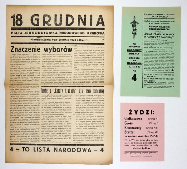 Marginesy pożółkłe. Jednodniówka SN wydana przed wyborami samorządowymi 18 XII 1938. Część tekstów o charakterze antysemickim. Dodano dwie ulotki (na jednej z nich wymienieni kandydaci PPS pochodzenia żydowskiego).