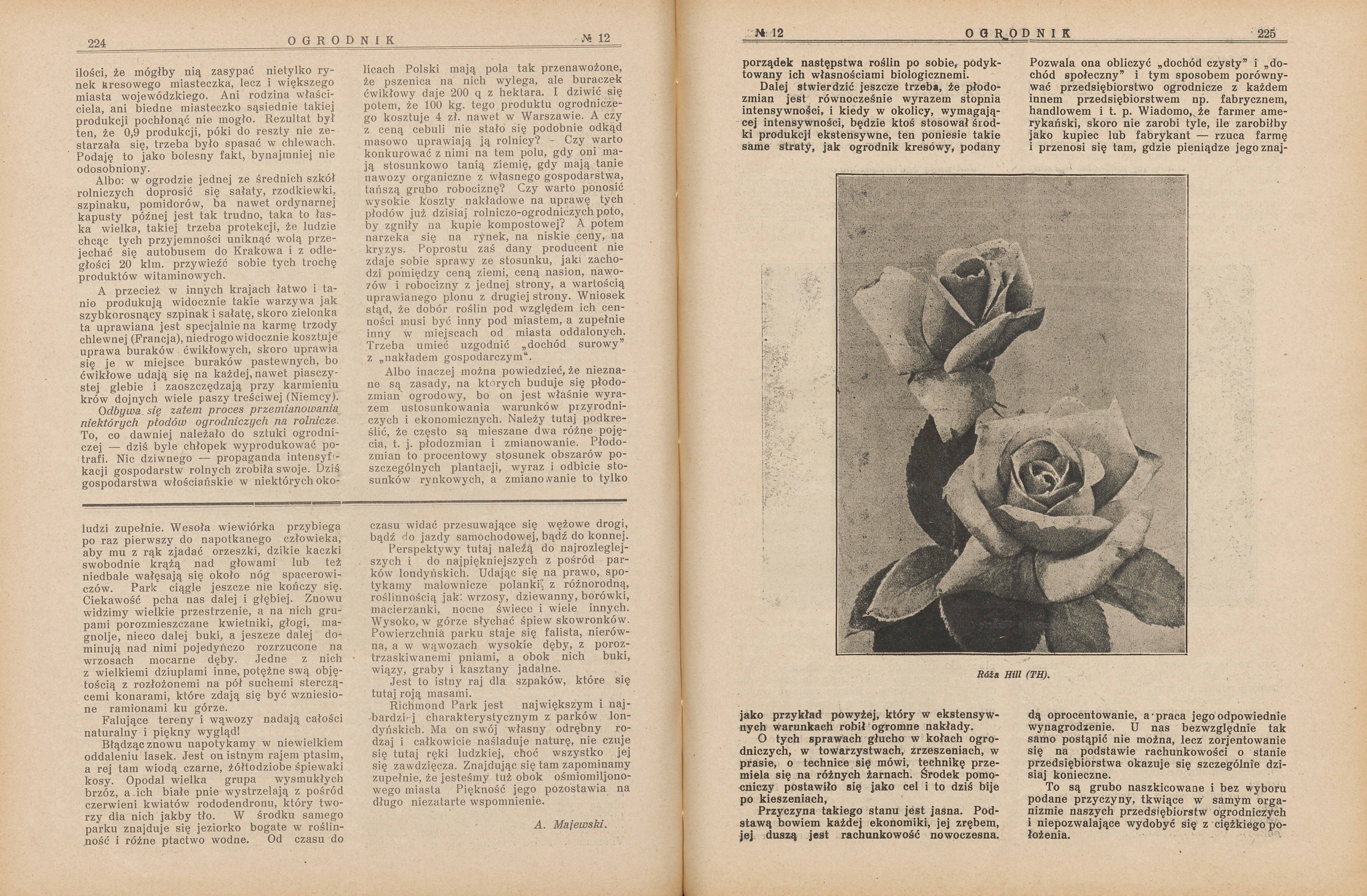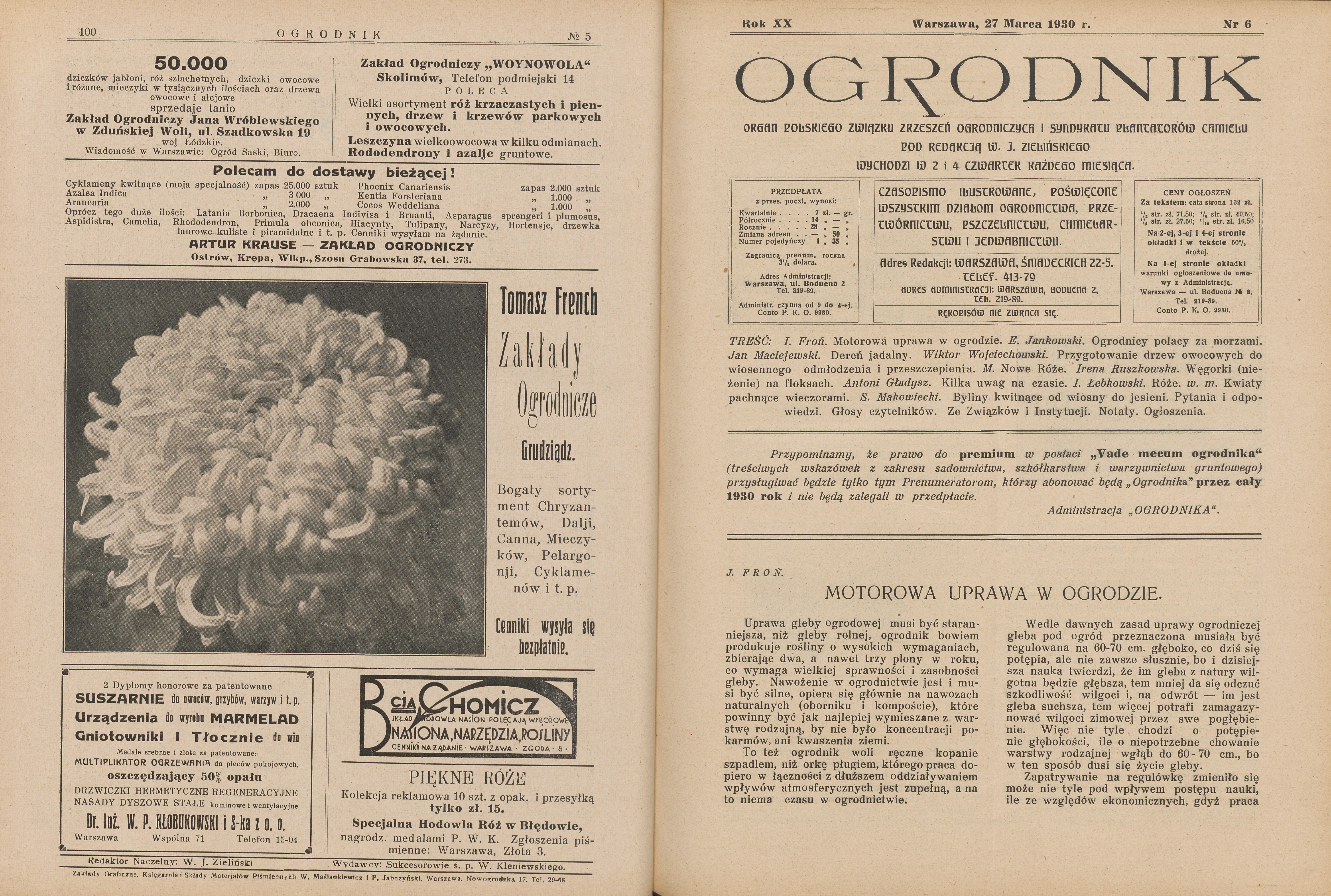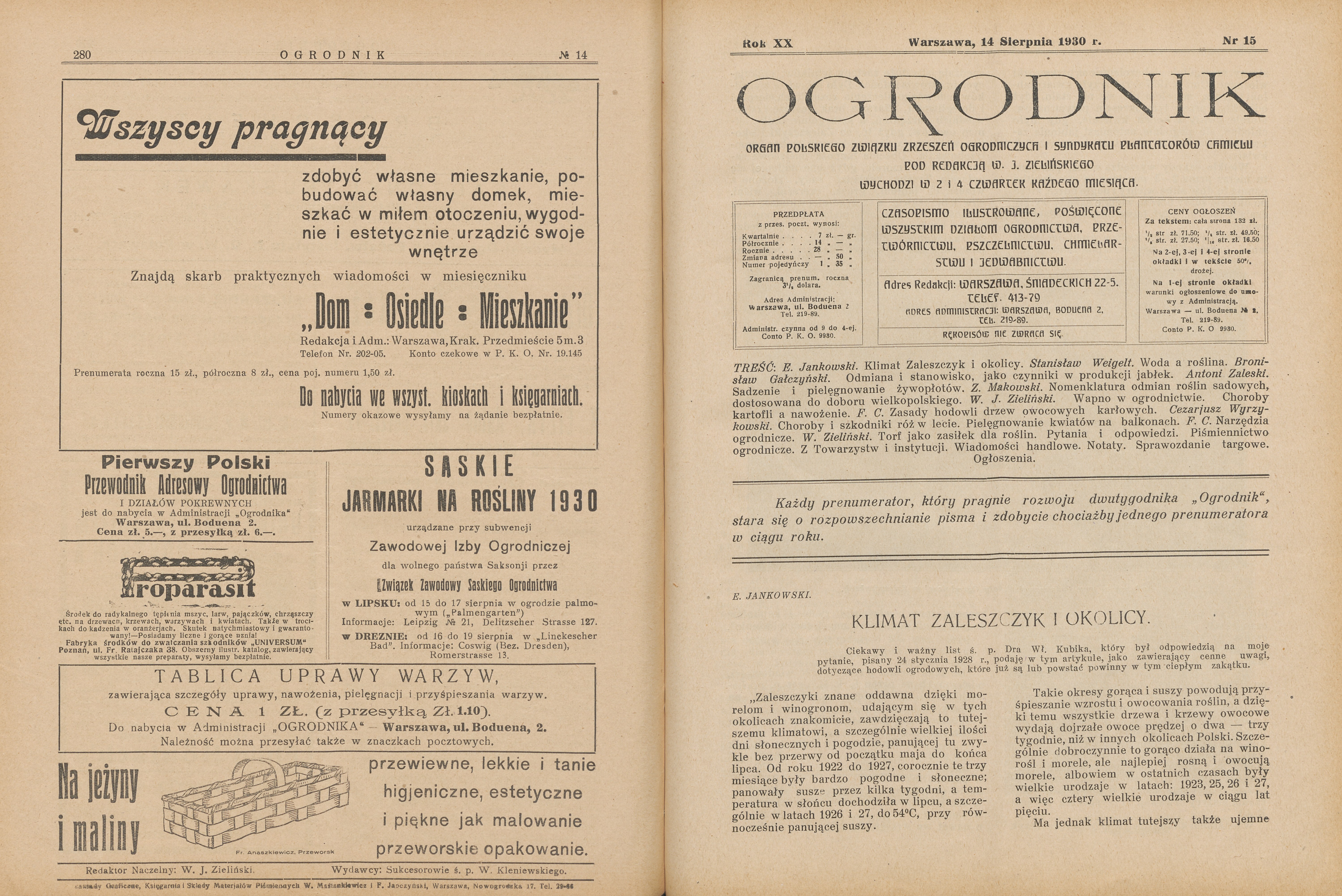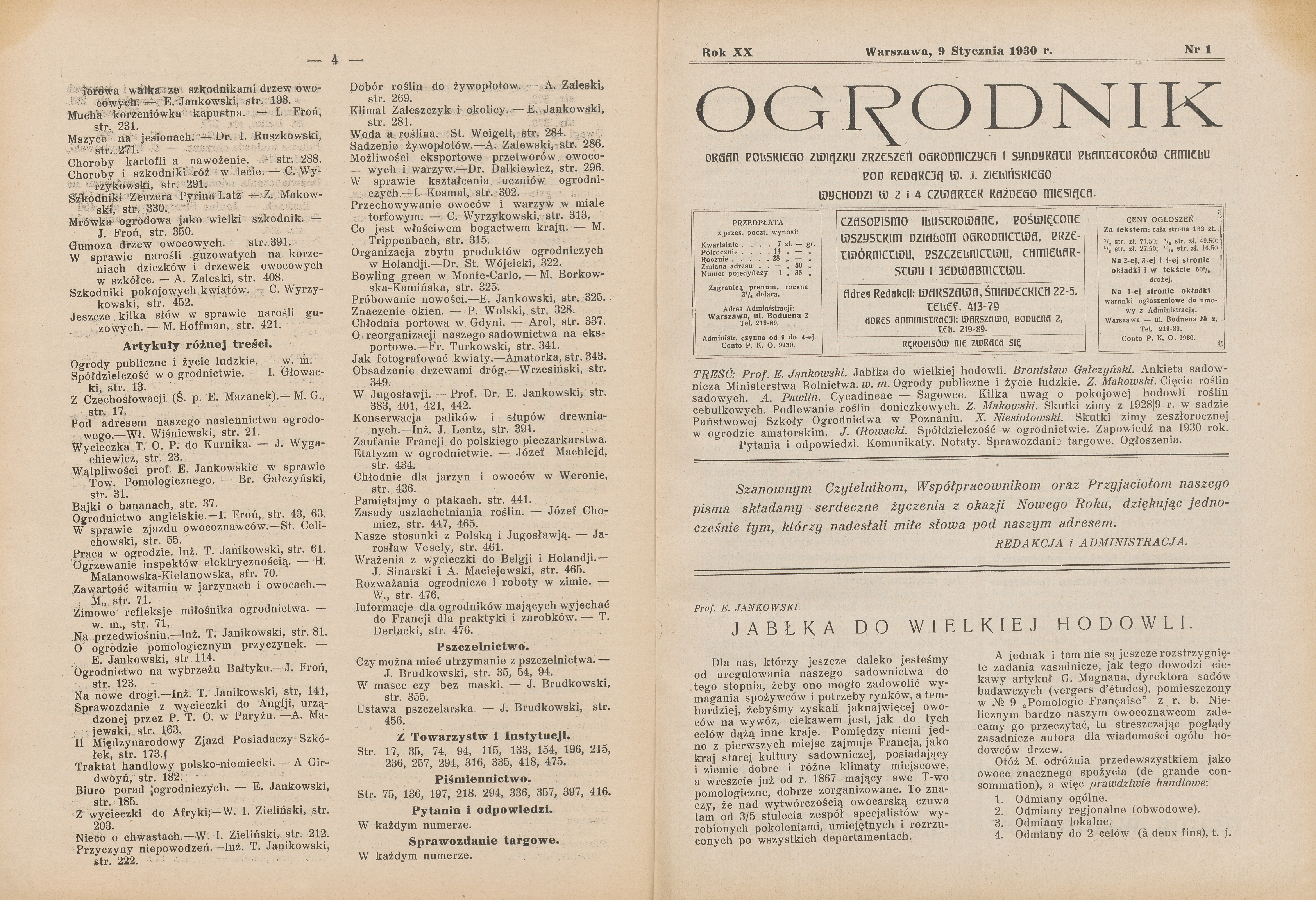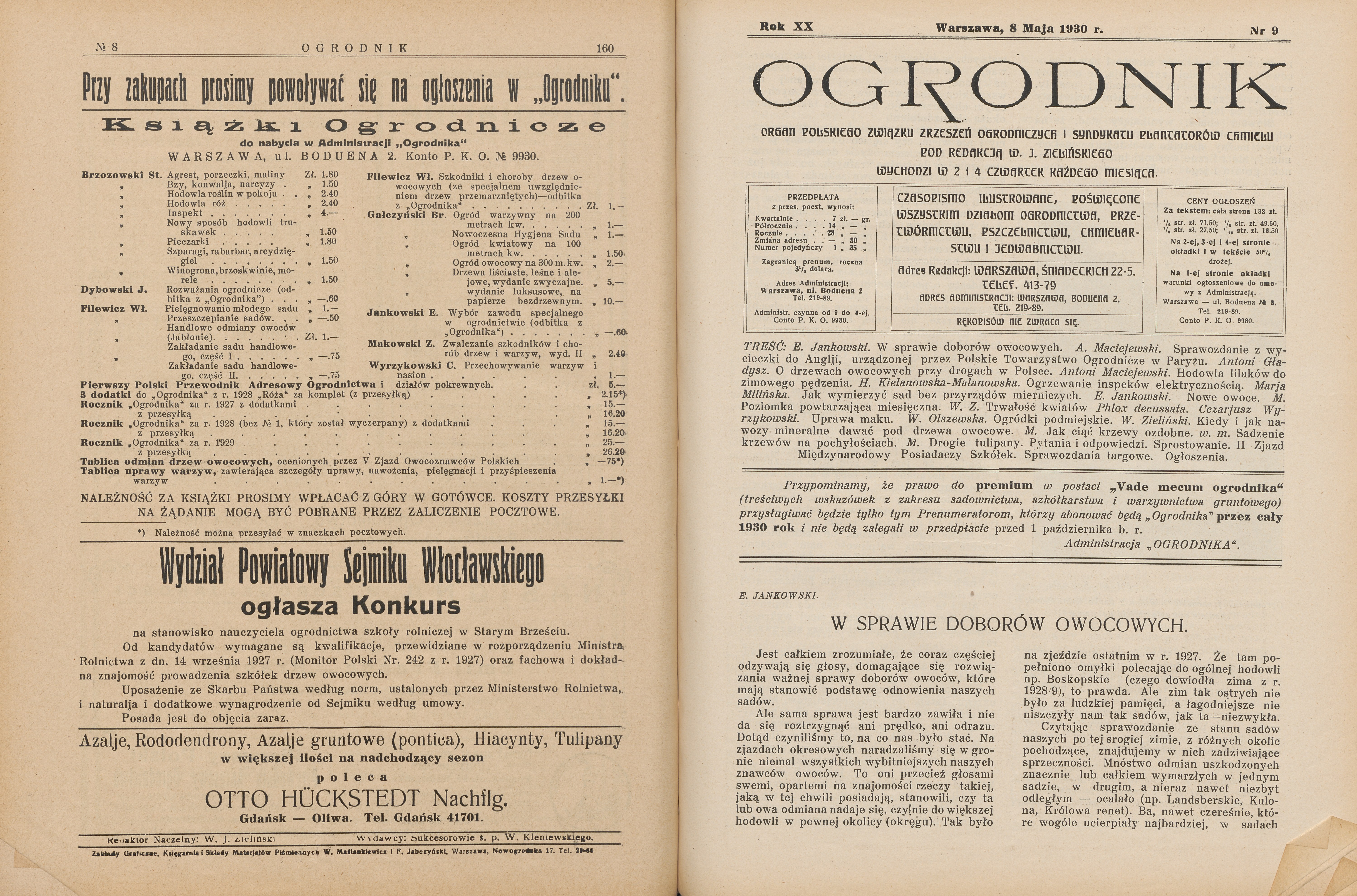 Kompletny rocznik 1930 (24 numery) czasopisma Ogrodnik, poświęconego wszystkim działom ogrodnictwa, przetwórnictwu, pszczelnictwu, chmielarstwu, rolnictwu, oraz sprawom ekonomicznym. W treści m.in.: Jabłka do wielkiej hodowli. Sadownictwo na Rusi Podkarpackiej. Z jakich odmian tworzyć nowy dobór drzew owocowych dla Polski. Długie cięcie winorośli. Szkodliwy wpływ suszy na owoce. Dobór odmian drzew i krzewów dla Wielkopolski. Zbiór i przechowywanie owoców. Szkółki drzew owocowych i róż "Lemszczyzna-Szczekarków". Najważniejsze prace jesienne w ogrodzie owocowym. Kilka uwag o pokojowej hodowli roślin cebulkowych. Żywopłoty ozdobne. Byliny kwitnące od wiosny do jesieni. Dobór róż do ogródków amatorskich. Grudziądzkie Towarzystwo Upiększania Miast. Ogródki podmiejskie. Mało znane pnącza i chmieliny. Kwietniki, rabaty, trawniki, dróżki i ścieżki. Nowoczesne ogrody publiczne. Ogrody na dachach domów. Warszawskie lipy. Nieco o roślinach wodnych. Tulipany w Warszawskim Ogrodzie Botanicznym. Regulowanie okresów kwitnienia róż. Jak zamienić łąkę na ogród warzywny. Nawożenie machorki. Spółdzielczość w ogrodnictwie. Ogrodnictwo na wybrzeżu Bałtyku. Klimat Zaleszczyk i okolicy. Chłodnia portowa w Gdyni. Czy można mieć utrzymanie z pszczelnictwa.