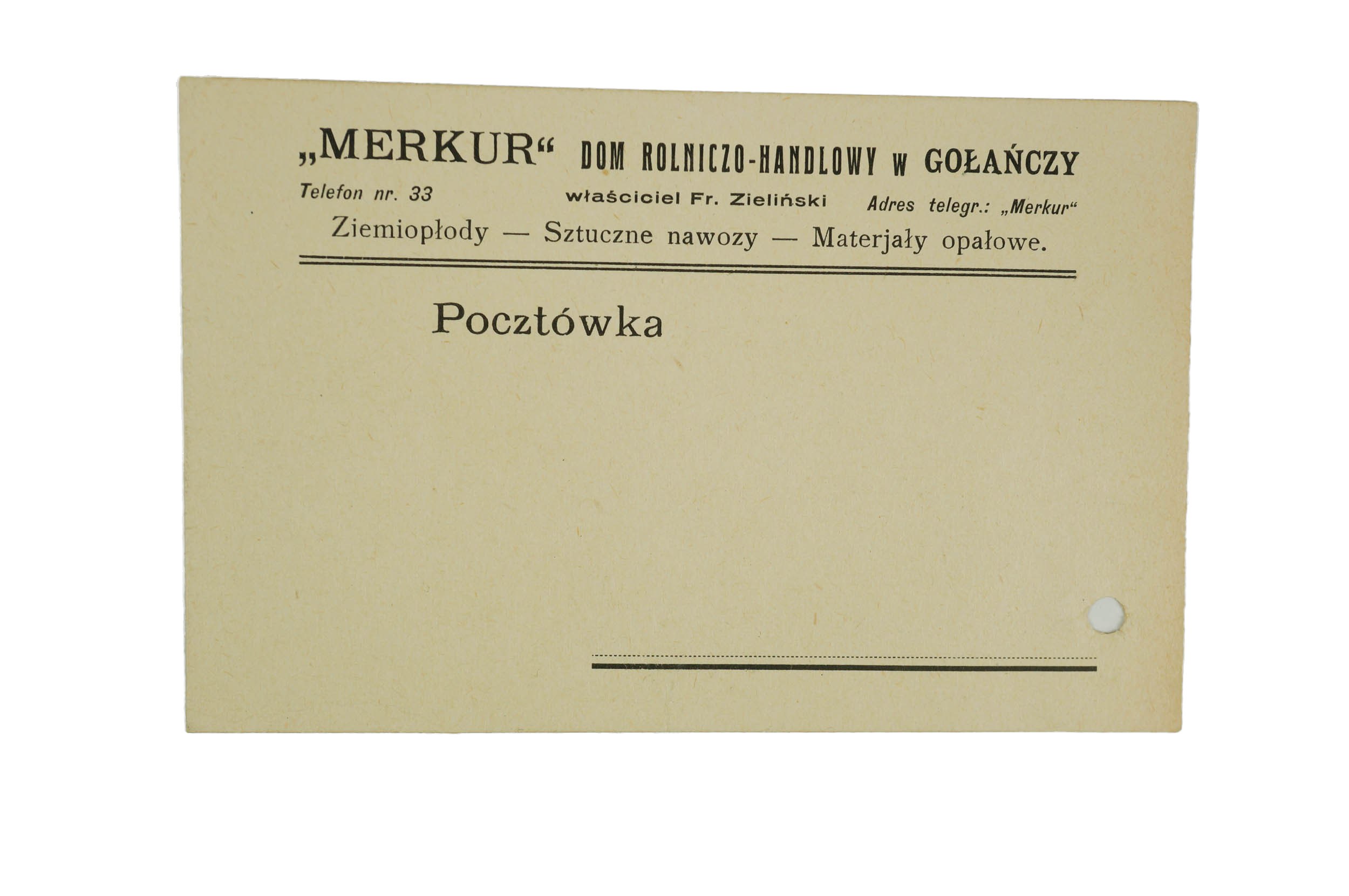 [GOŁAŃCZ] "Merkur" Dom Rolniczo-Handlowy w Gołańczy właściciel Fr. Zieliński, POCZTÓWKA z 30 października 1931r., f. 14x9cm