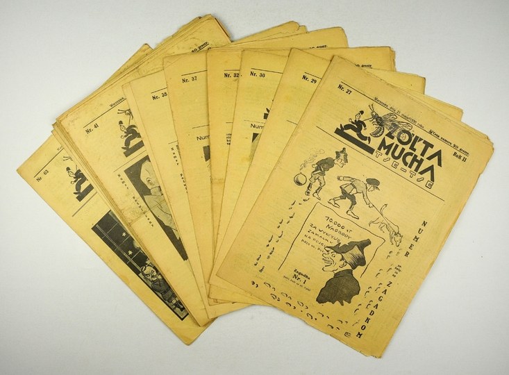Ślady złożenia znacznej części numerów, niewielkie naddarcia krawędzi, kilka okładek zakurzonych. Wycięty fragment jednej karty (nr 45). Zestaw 27 numerów warszawskiego tygodnika polityczno-satyrycznego. Część z brakujących numerów została skonfiskowana. Każdy numer obj. 8 s. (za wyjątkiem numeru podwójnego, który liczył 16 s.). Pismo ukazywało się w l. 1929-1933 (i później jako "Tse-Tse").
