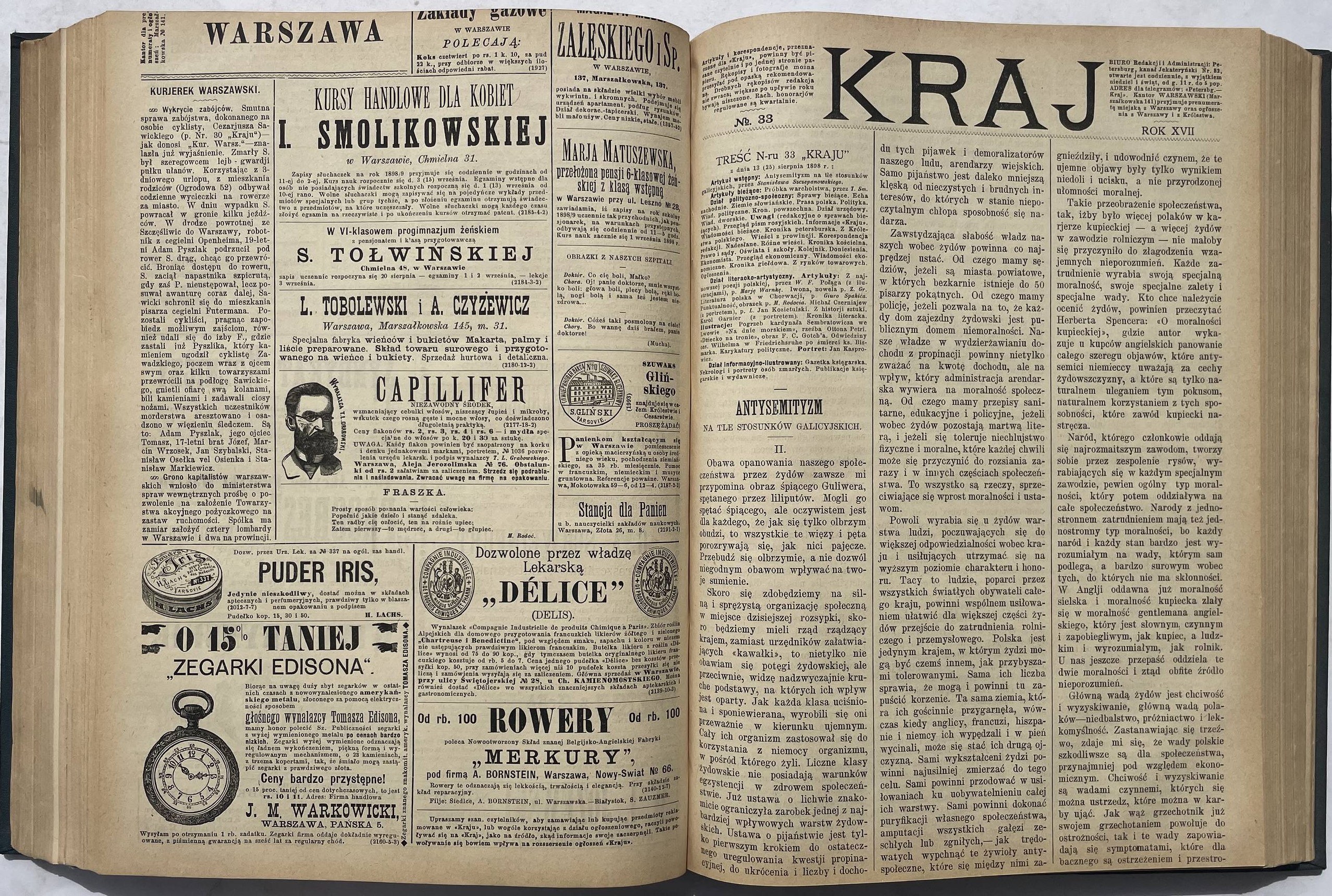 Kraj. Tygodnik społeczno-polityczny. Rok 1898 nr 1-39 (brak nr 5, 13, 16, 18 i 20) oraz 15 dodatków od nr 34. Format 31 cm, każdy nr ca 20-30 stron. Oprawa z epoki płsk. złoc., stan b. dobry, ładny egz.
