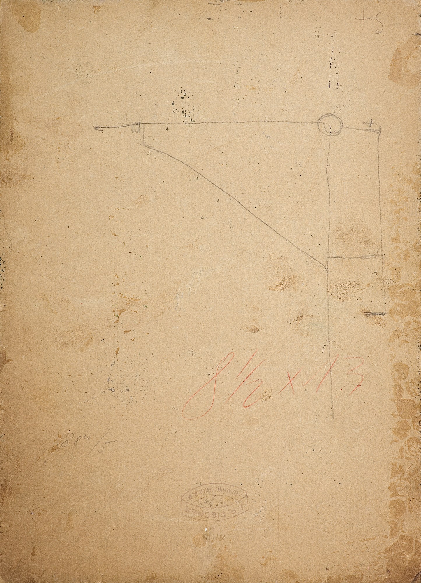 Na odwrocie p.g. notatki ramiarskie (ołówkiem): +S.; l.d.: 884/5; (czerwoną kredką): 8 1/2 x 13; ponadto, przeciwnie do kompozycji, pieczęć (pieczęć, tusz): J.F.FISCHER | W 707 | KRAKÓW, LINIA.A.B.