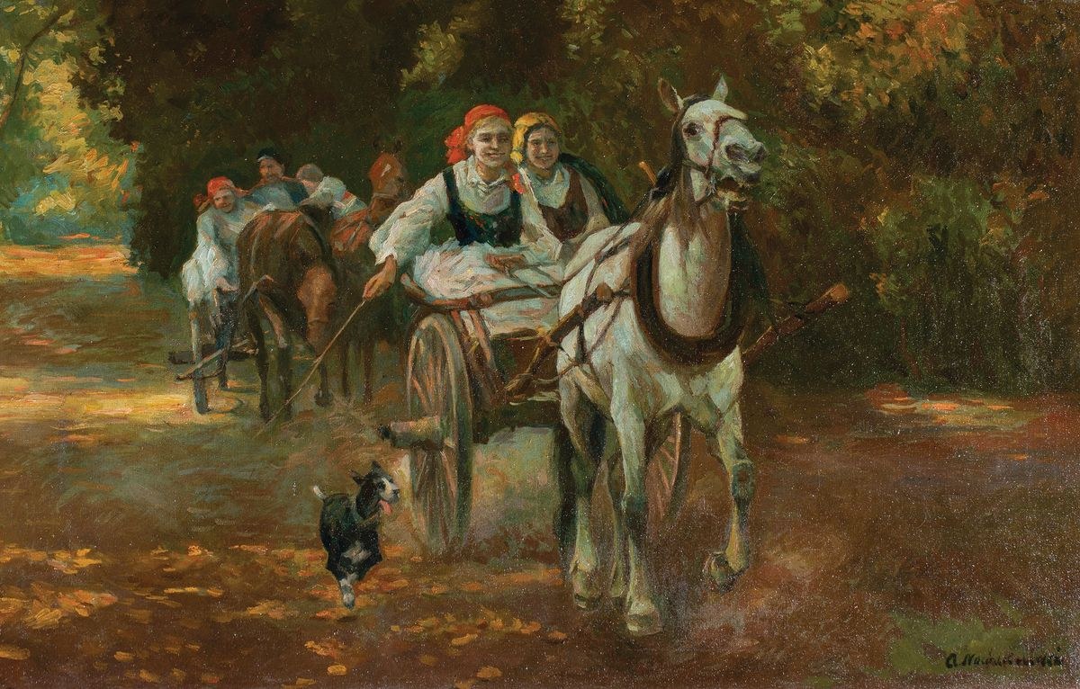 Malarz ukraiński; naukę malarstwa rozpoczął w Odessie, gdzie w latach 1888-1892 uczył się pod kierunkiem F.F. Klimenki. Następnie podjął studia w Szkole Sztuk Pięknych w Krakowie u J. Unierzyskiego, L. Wyczółkowskiego, J. Fałata i T. Axentowicza, J. Stanisławskiego (w 1907 wziął udział w wystawie jego uczniów). Studia ukończył w 1904. W latach 1900-1913 mieszkał w Mogile pod Krakowem skąd wyjeżdżał na plenery w poznańskie i Karpaty. W 1913 przeniósł się do Lwowa, zaproszony przez ks. metropolitę Andrzeja Szeptyckiego, który odtąd był jego mecenasem. Zamieszkał w dawnym domu Jana Styki (obecnie Muzeum O.Nowakiwskiego). W 1923 otworzył w swej pracowni szkołę malarską. Wiele wystawiał - tak wspólnie z różnymi stowarzyszeniami artystów ukraińskiej, jak i polskich, m.in. w 1911 z grupą „Zero”, w 1912 z Tow. Artystów Polskich „Sztuka”, wielokrotnie w TPSP w Krakowie i TZSP w Warszawie, gdzie w 1932 odbyła się indywidualna wystawa jego prac. W okresie „krakowskim” tworzył głównie pejzaże o żywej kolorystyce i wyrazistej fakturze malarskiej. Po 1913, już we Lwowie malował także portrety, sceny rodzajowe z życia Hucułów, wizerunki bohaterów legend ukraińskich, martwe natury, kwiaty, kompozycje alegoryczne i religijne. W oferowanym obrazie nawiązał do znanego dzieła Alfreda Wierusz-Kowalskiego.