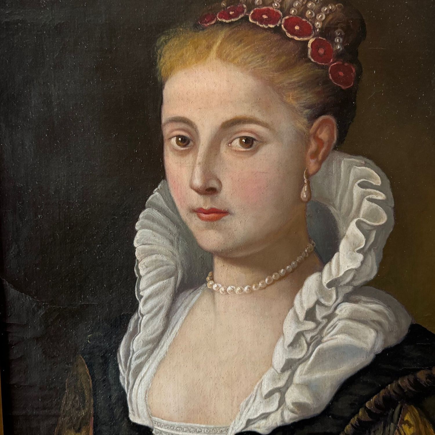 Oil painting on canvas, 19th/20th-century Italian school, depicting a portrait of a woman in the manner of the 17th century. Dimensions within the frame: 54x67 cm. Dimensions including the frame: 67x79 cm. By an anonymous academic artist of the Italian school. The artwork is in good condition with slight signs of wear as shown in the attached photos.
