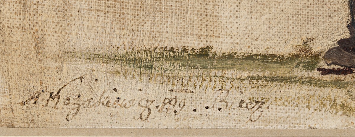 Olej, płótno naklejone na tekturę; wym. w świetle pp.: 14,5 x 19 cm; sygn. l. d.: "A. Kozakiewicz 899. Biecz".