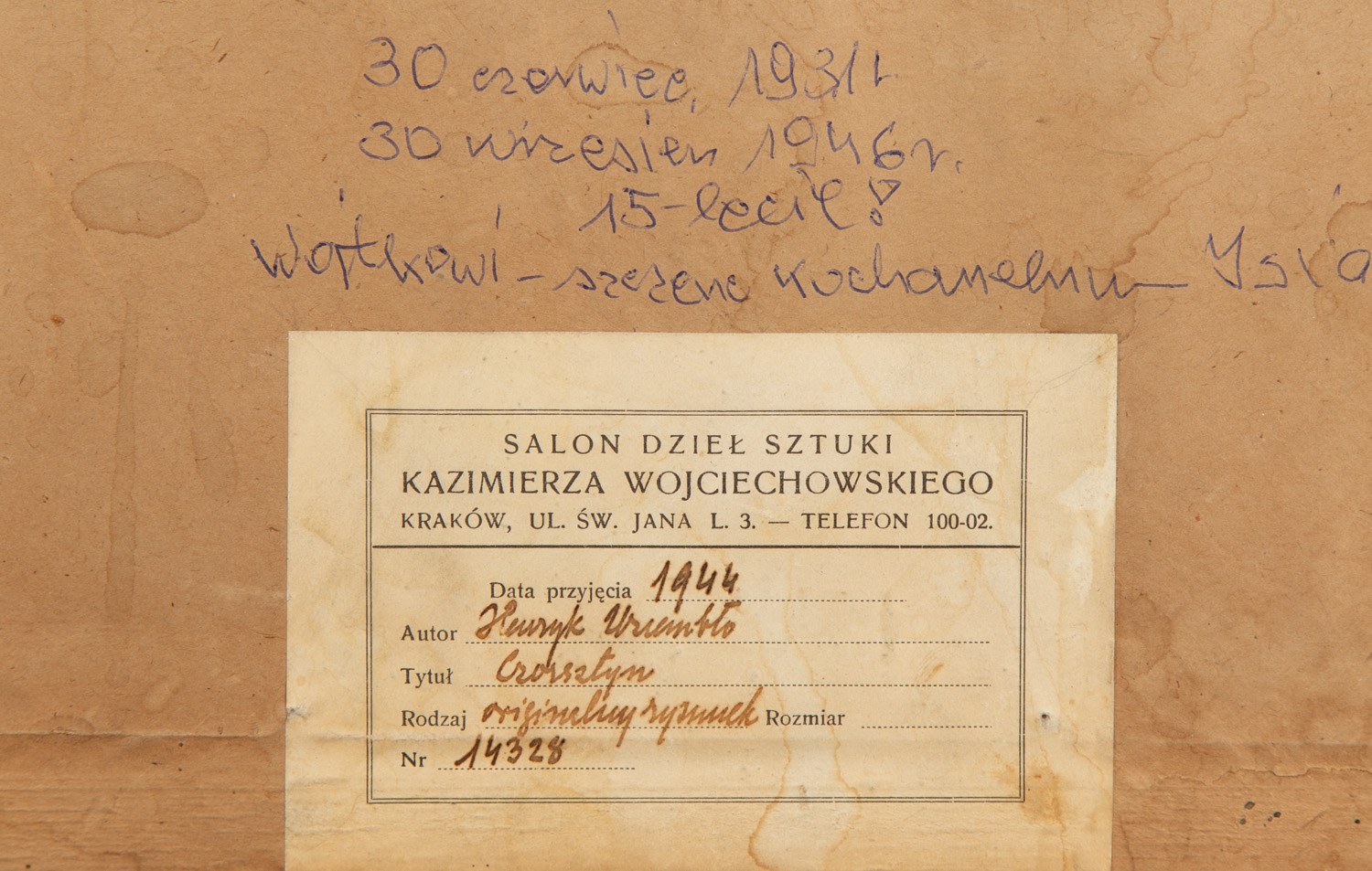 opisany na odwrociu: '30 czerwiec 1931r. | 30 wrzesień 1946r. | 15-lecie! | Wojtkowi - szczerze Kochanemu - Isia', poniżej papierowa nalepka Salonu Dzieł Sztuki Kazimierza Wojciechowskiego w Krakowie