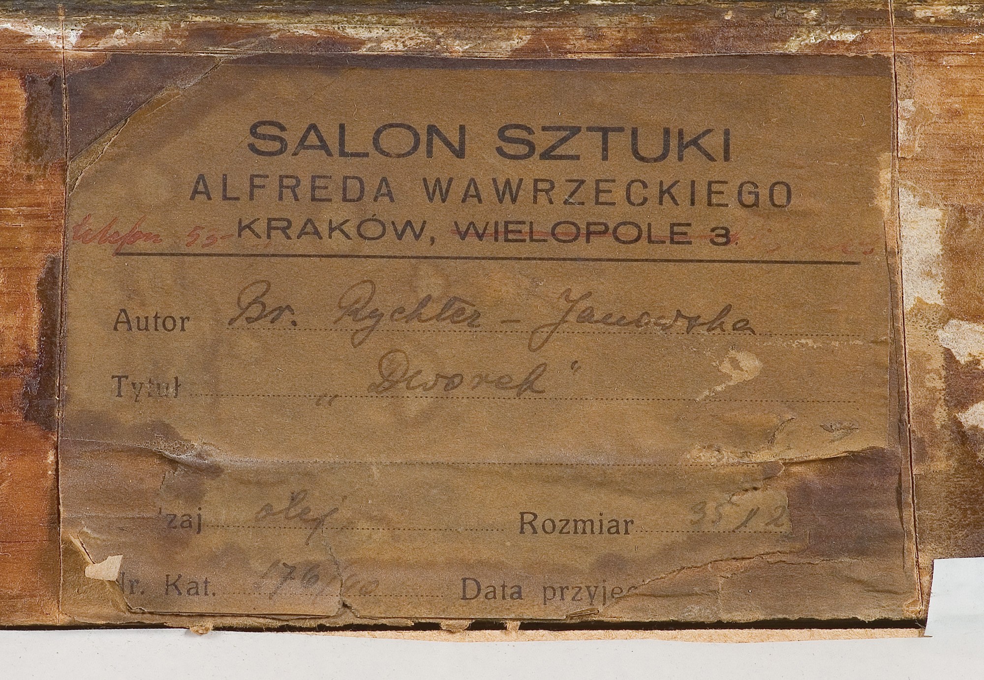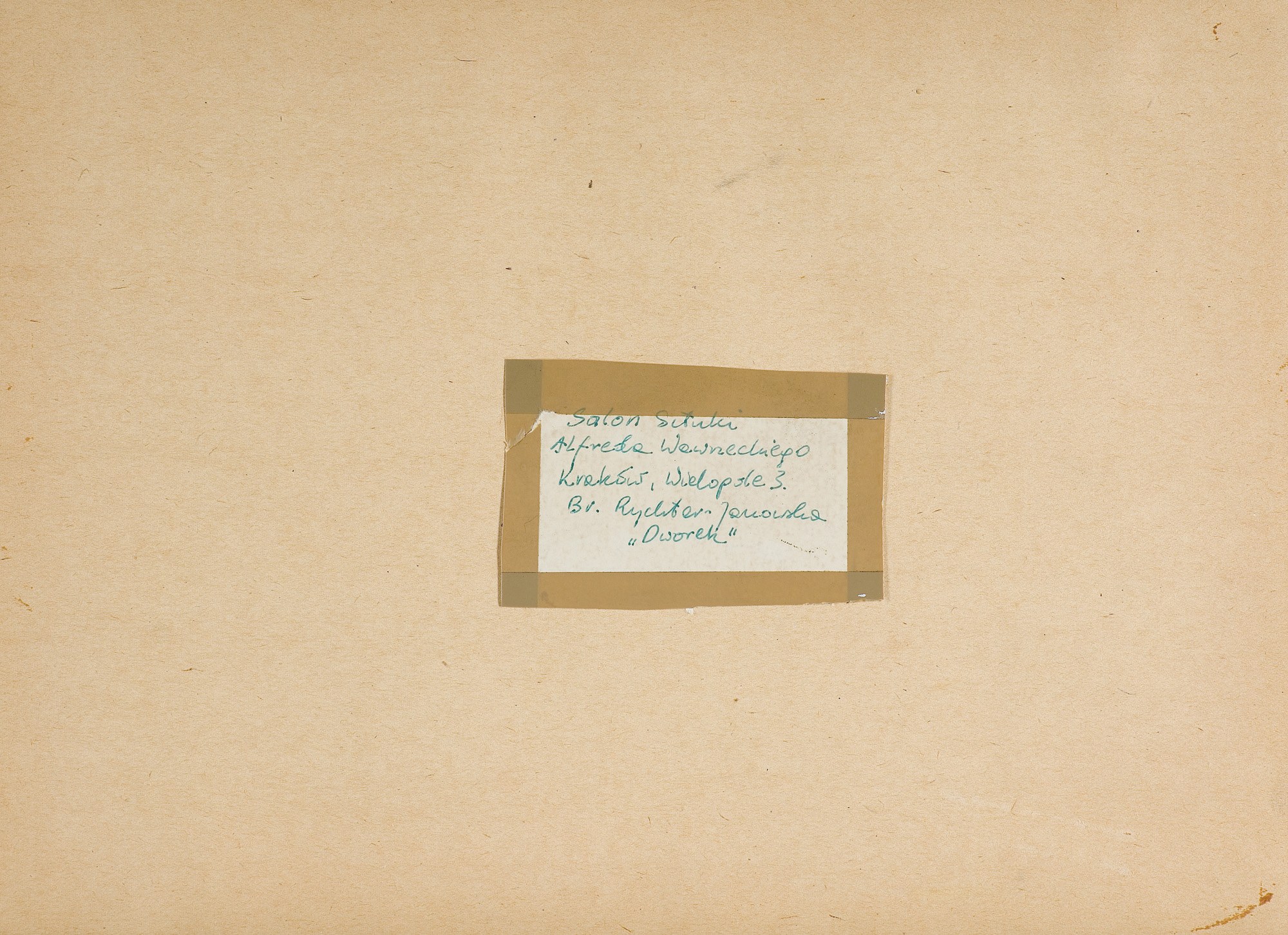 Na odwrocie kartka z napisem (długopis): Salon Sztuki | Alfreda Wawrzenieckiego | Kraków, Wielopole 3. | Br. Rychter-Janowska | "Dworek"