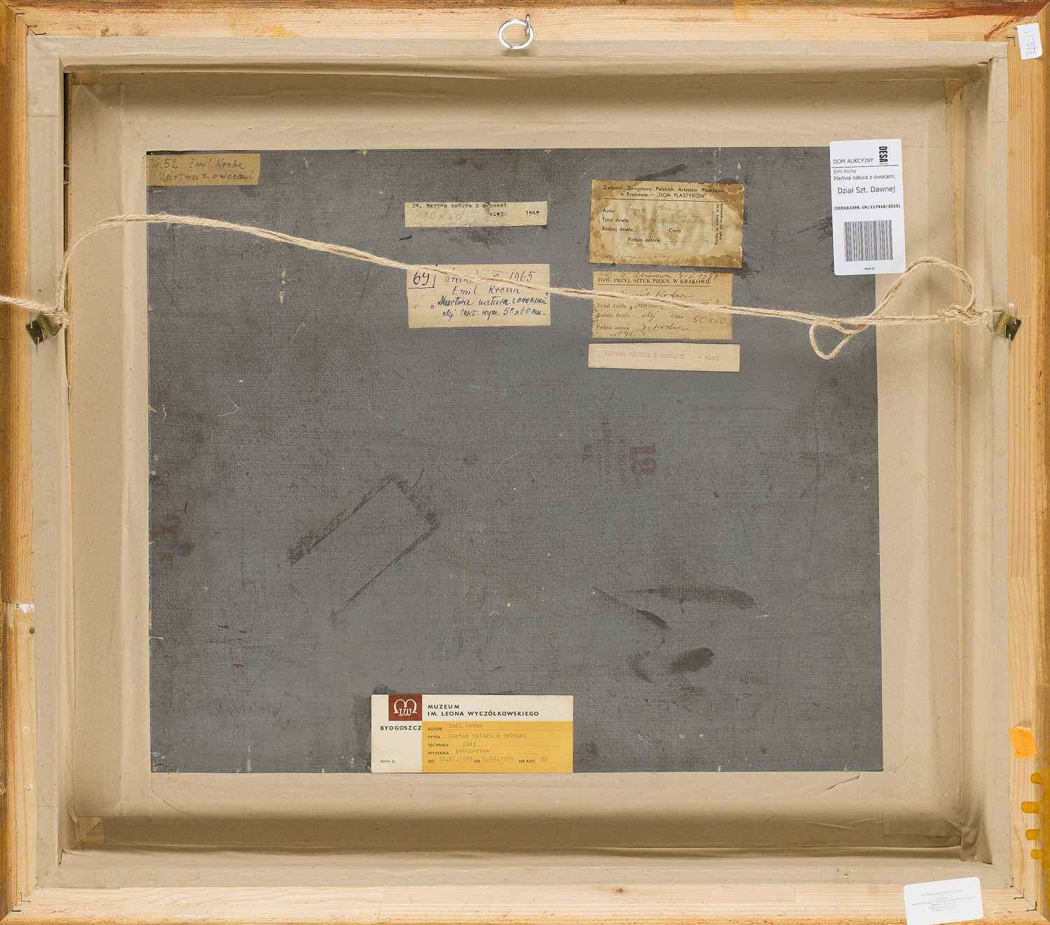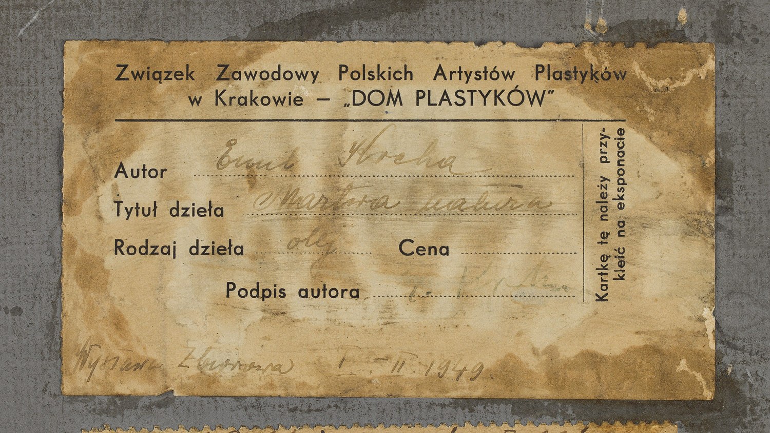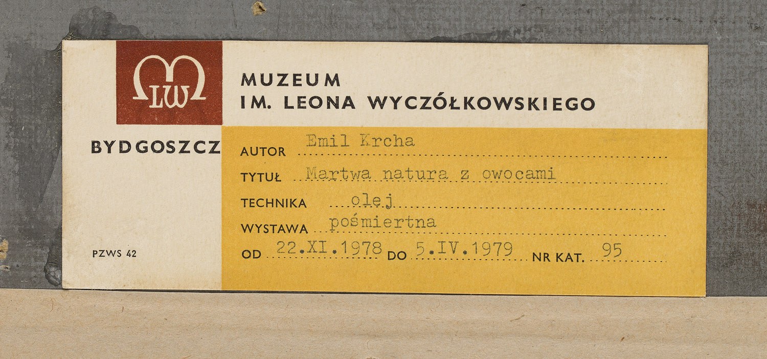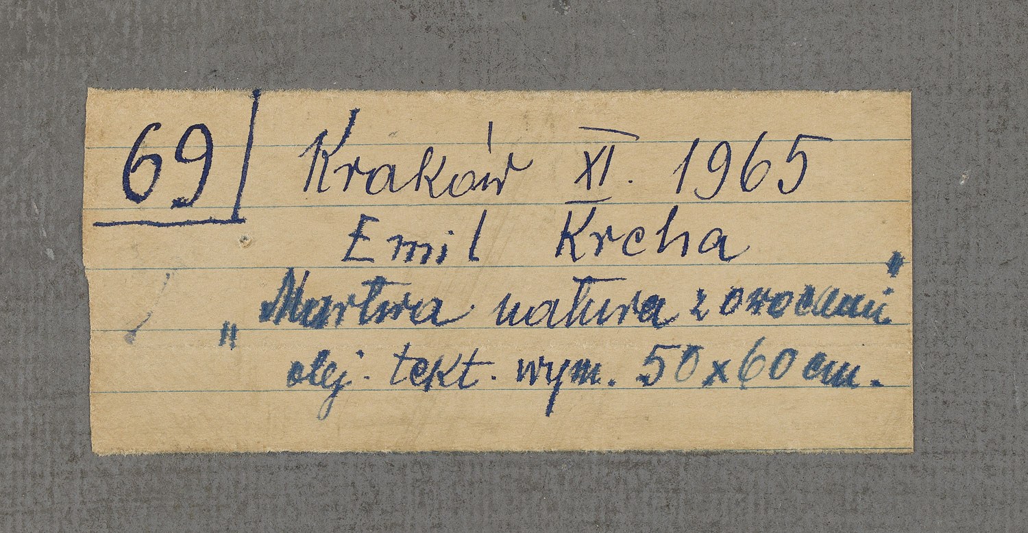 na odwrociu papierowe nalepki wystawowe z Muzeum im. Leona Wyczółkowskiego w Bydgoszczy, Towarzystwa Przyjaciół Sztuk Pięknych w Krakowie, Związku Zawodowego Polskich Artystów Plastyków w Krakowie oraz cztery papierowe nalepki z opisem pracy