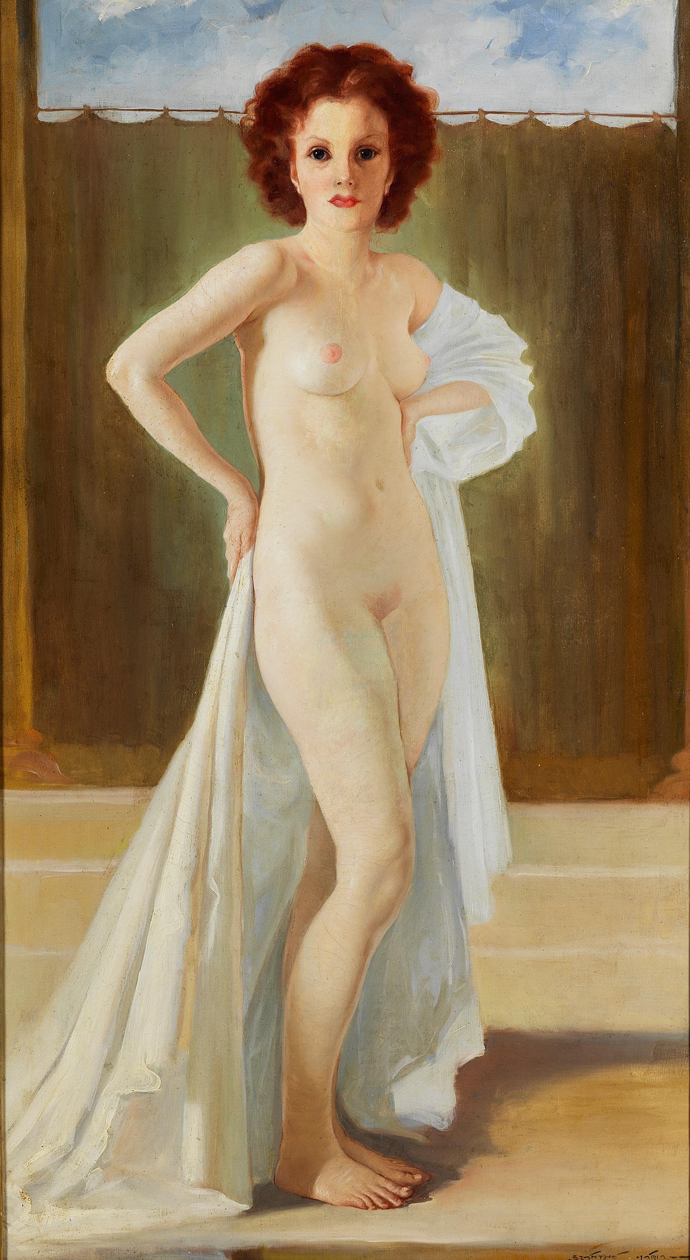 Vor einem Vorhang, über den hinweg der Himmel sichtbar ist, die selbstbewußt stehende, junge nackte Frau mit roten Haaren und einem langen weißen Umhang, der von der linken Armbeuge hinter ihrem Rücken zum Boden verläuft. Rest. (14111914) (4) (18)
