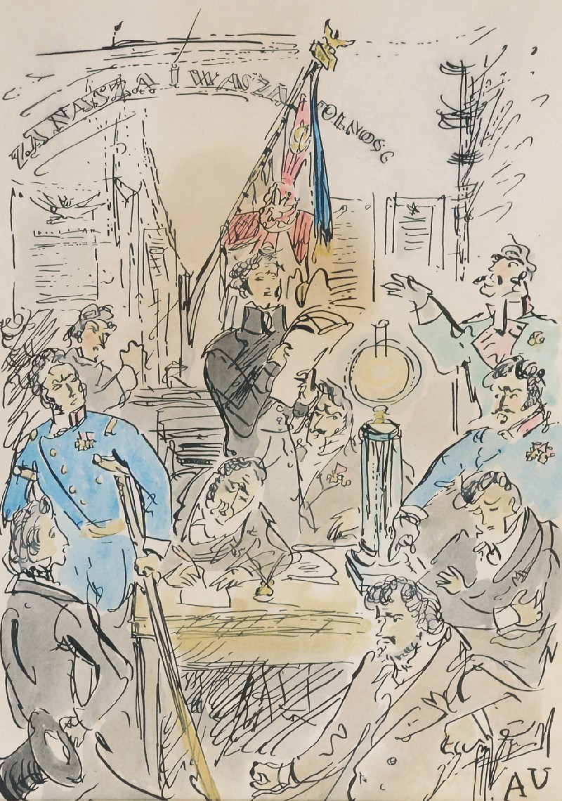 akwarela, tusz, piórko, papier; 40,5 x 29 cm (w świetle passe-partout);