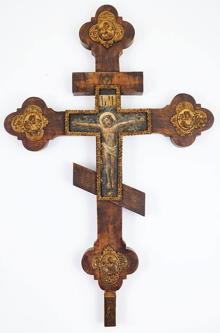 Drewno (dębina), olej na blasze stalowej, miedź złocona; 68 x 44 cm (krzyż), 24 x 18 cm (obraz)