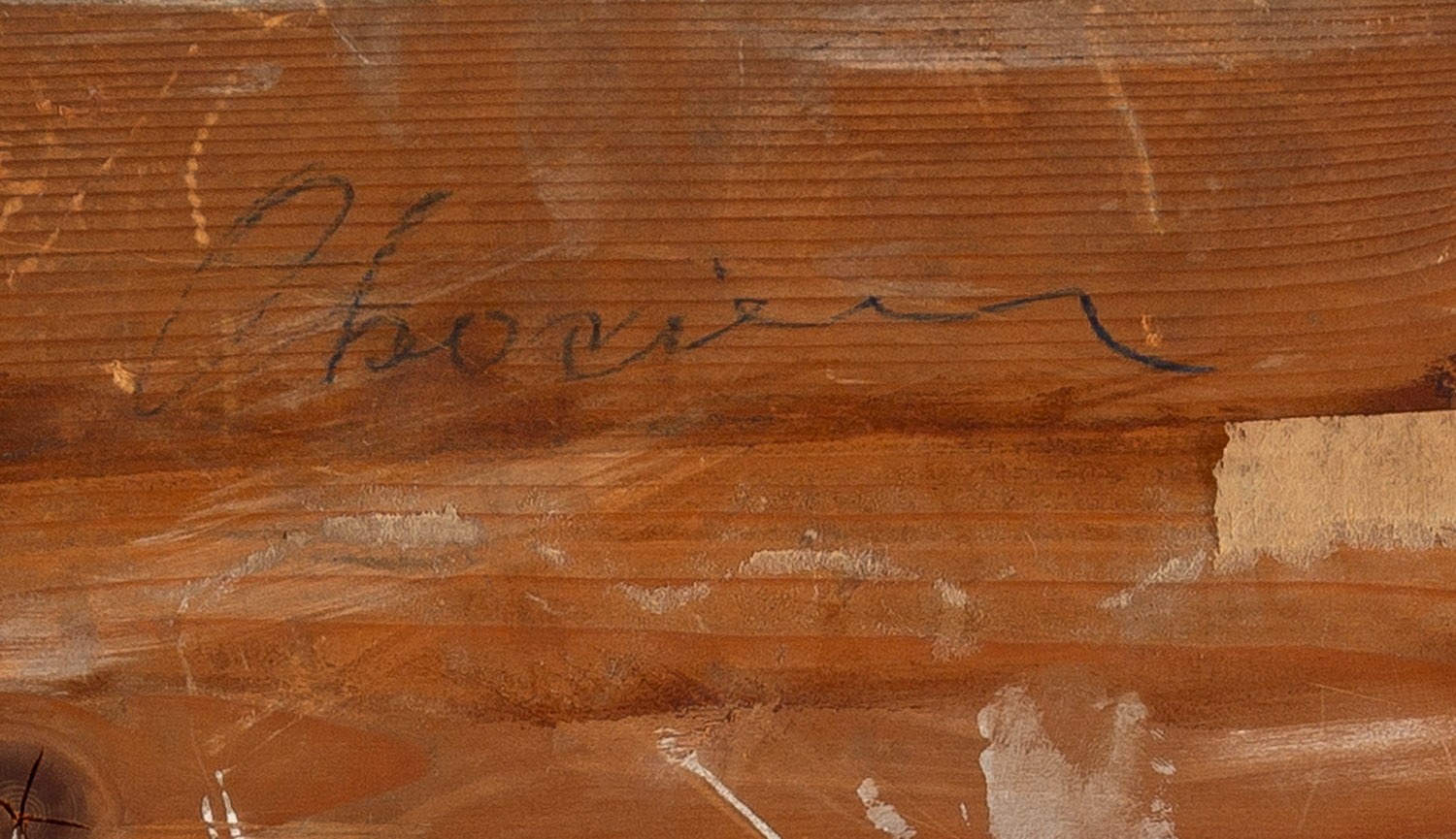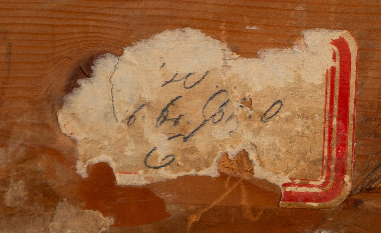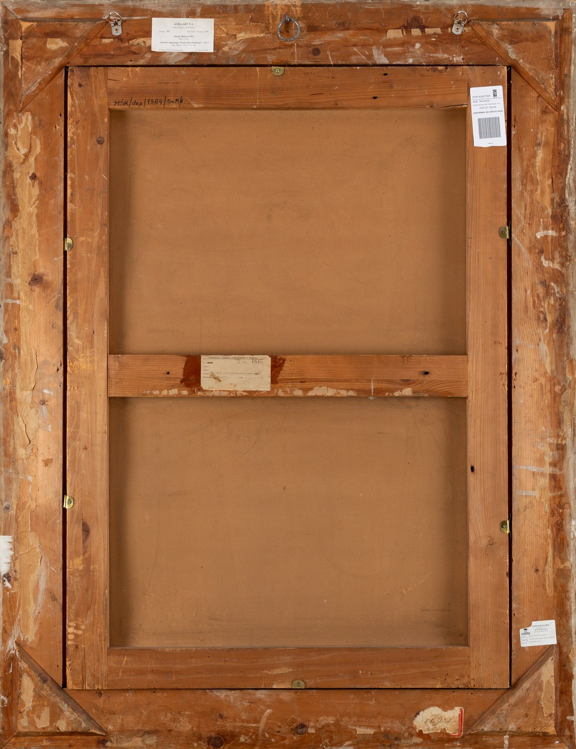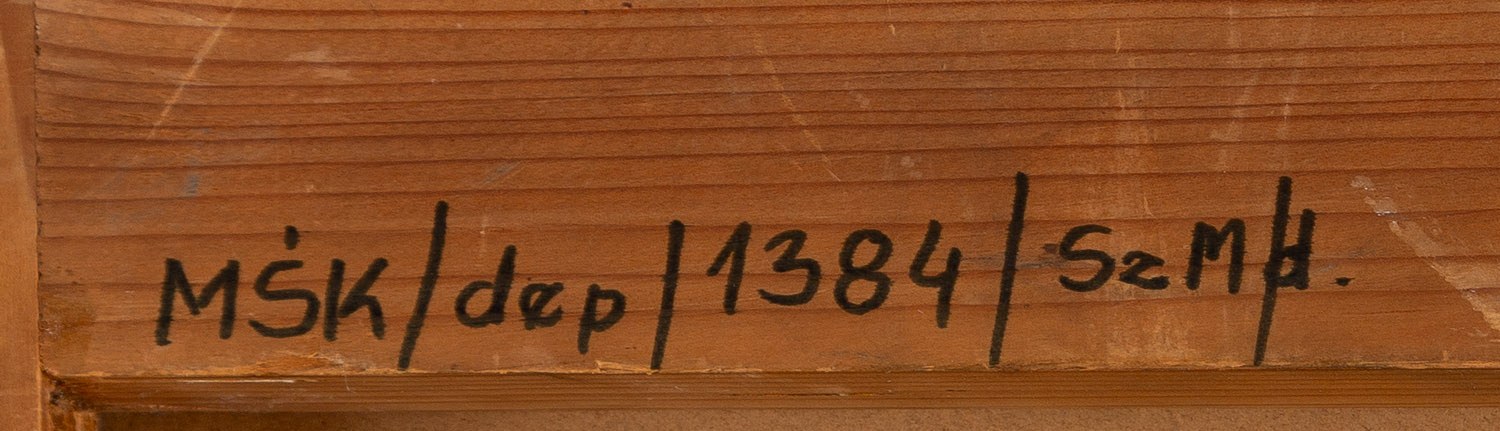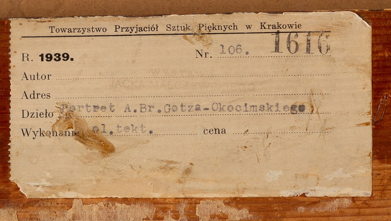 na krośnie malarskim papierowa nalepka wystawowa Towarzystwa Przyjaciół Sztuk Pięknych w Krakowie oraz numer depozytowy Muzeum Śląskiego w Katowicach: 'MŚK/dep/1384/SzM/d.', opisany na ramie: 'Okocim', fragmentarycznie zachowana, papierowa nalepka inwentarzowa z opisem oraz dwie nalepki aukcyjne
