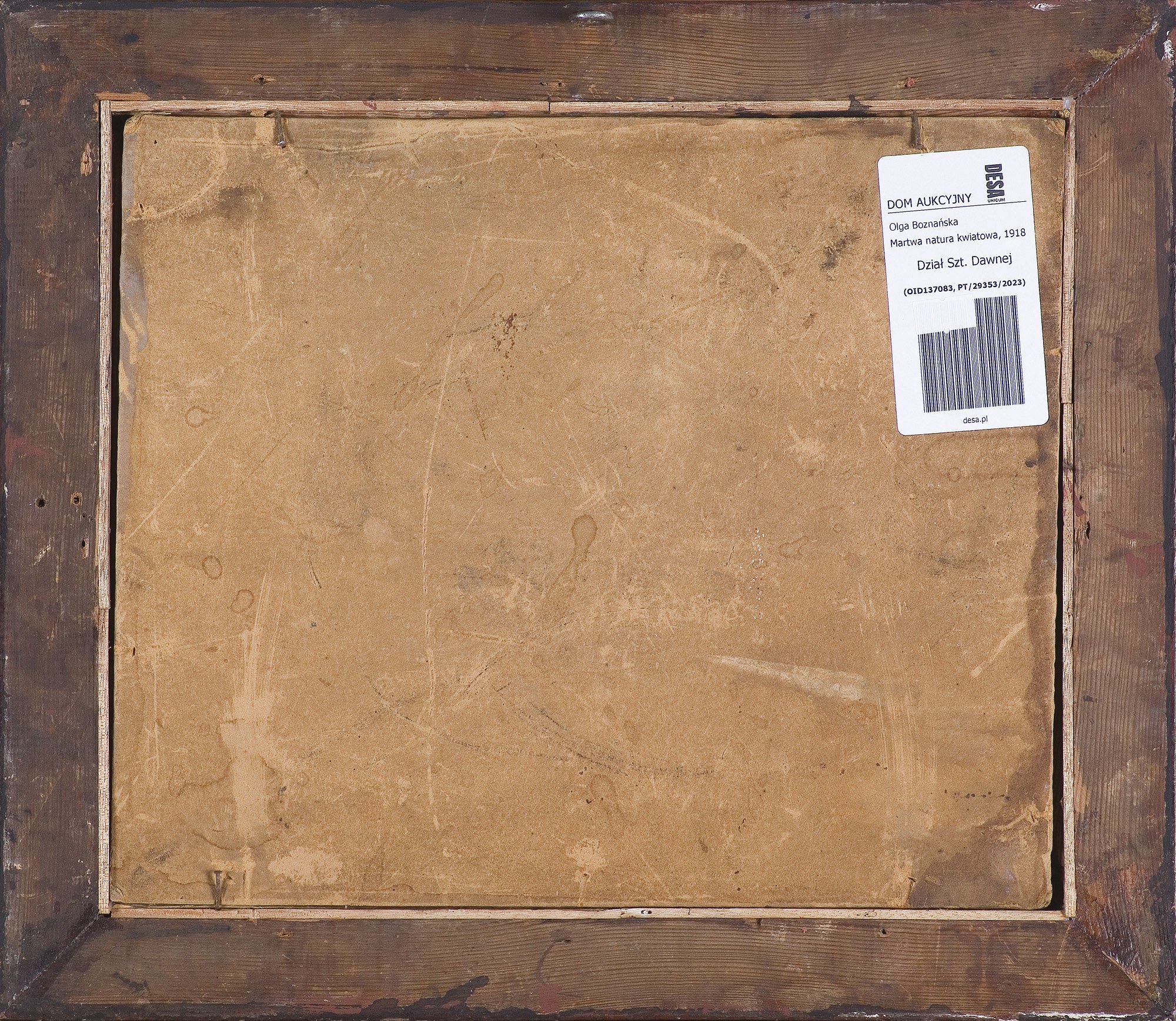 Na odwrocie nalepka warszawskiego domu aukcyjnego.