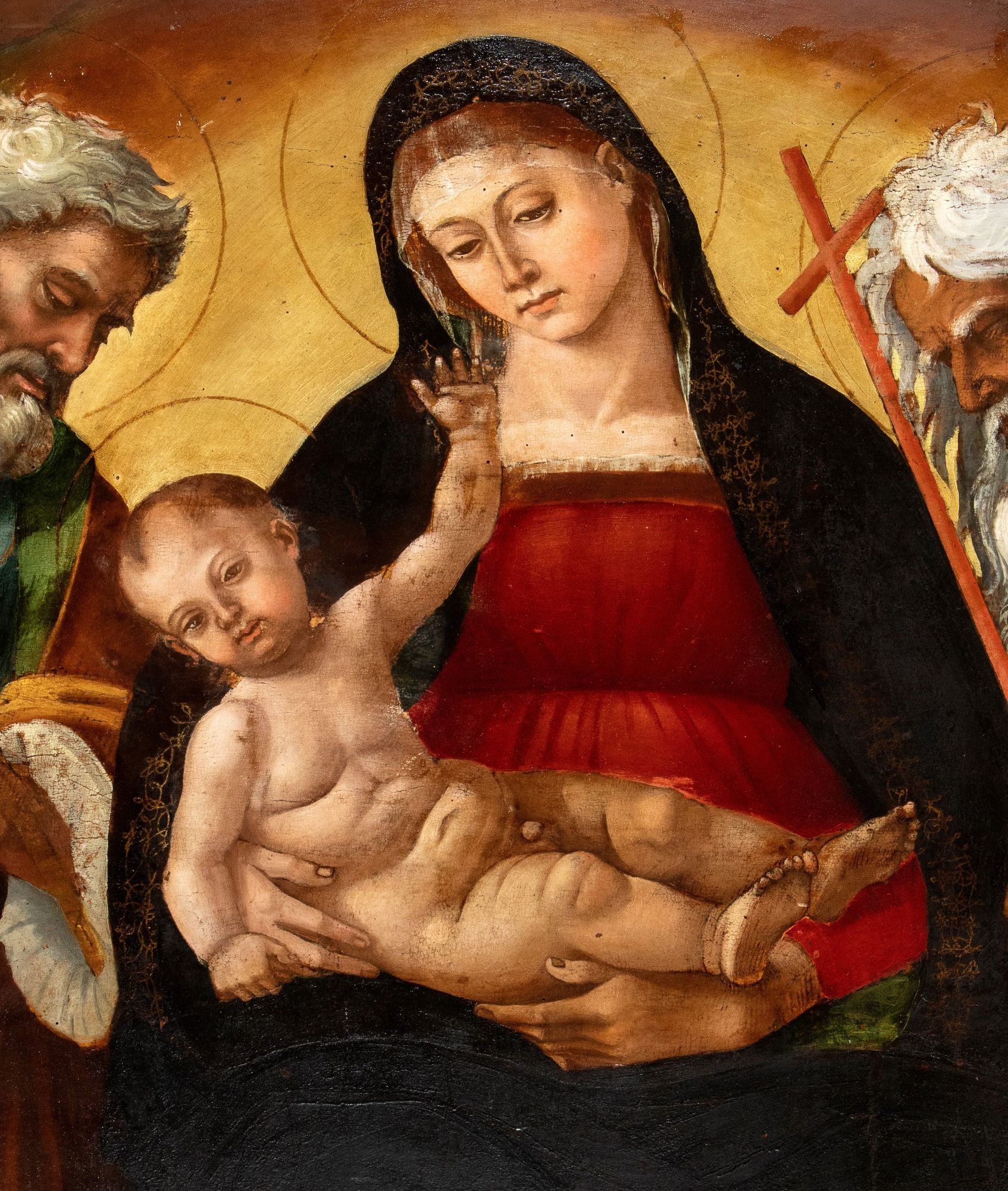 Madonna and Child between Saint Joseph and Saint Onofrio Oil on panel cm. 107x178