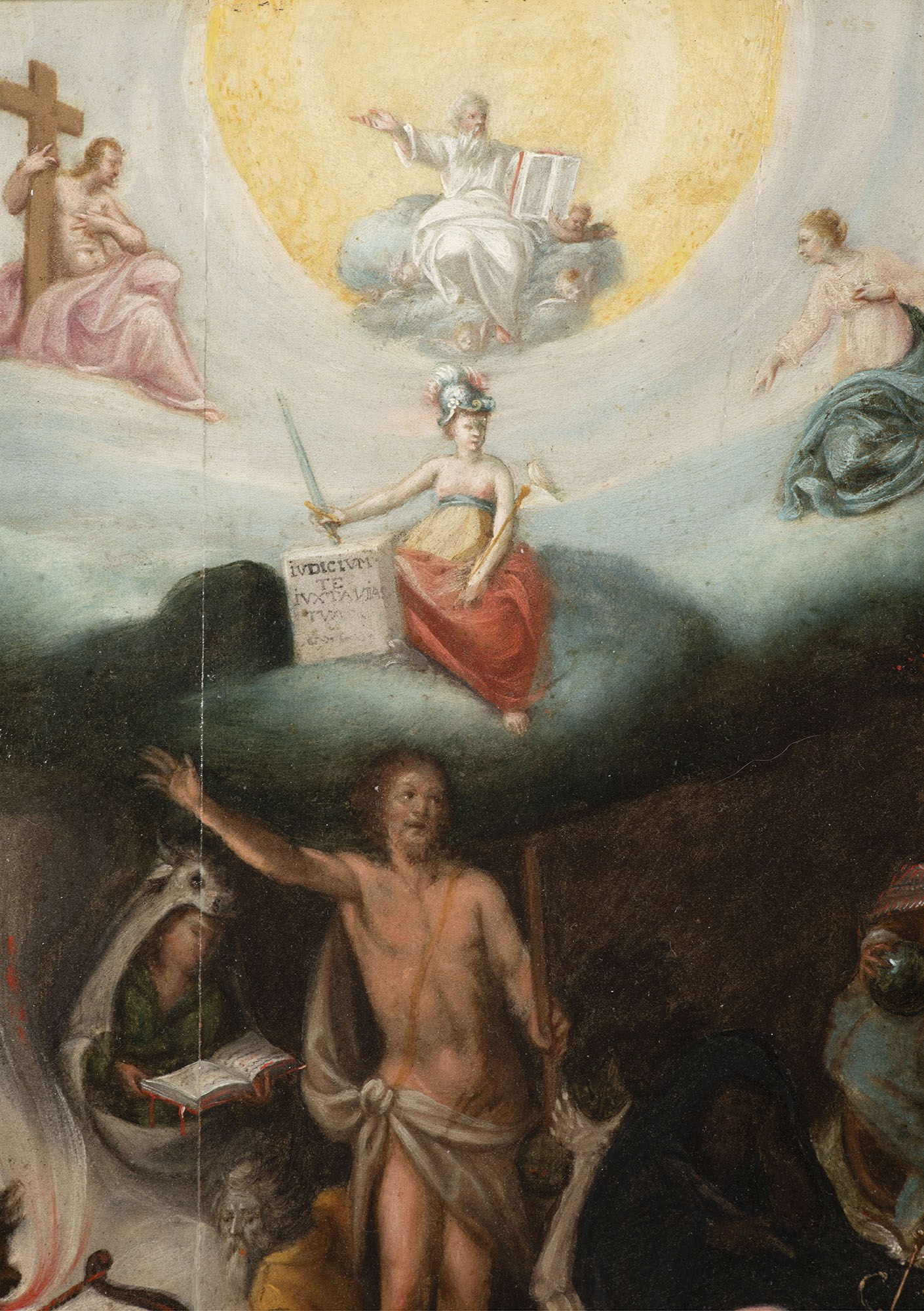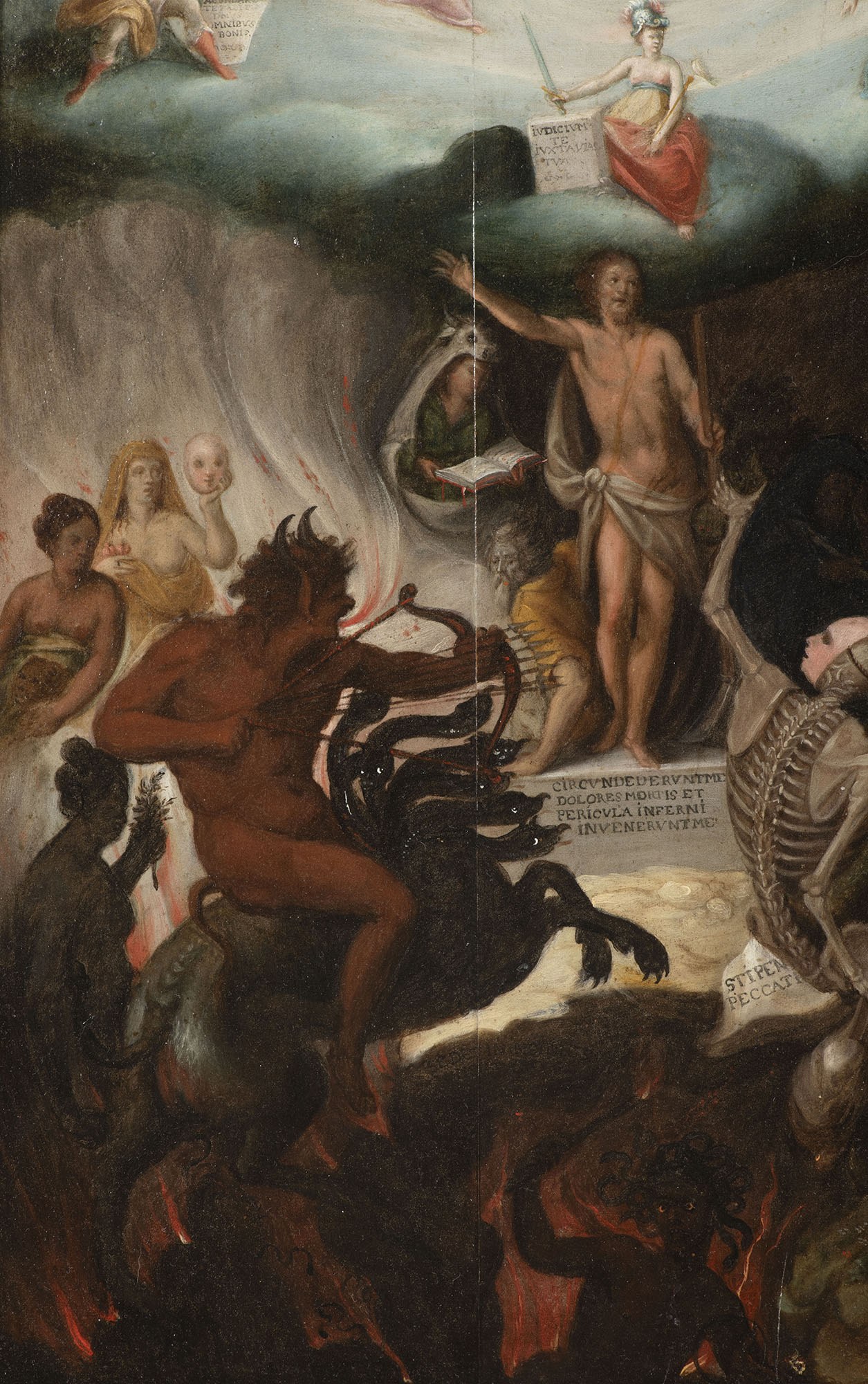 In the centre of the composition stands the risen Christ on his tomb, surrounded by Death and the Devil as well as numerous allegorical figures. Hell opens up below him, with the figure of a snake-haired Fury standing out in front of its flames, screaming at the viewer. Above Christ, heaven opens up with God the Father enthroned between Christ and Mary, who intercedes for mankind. Three female allegories with scrolls or tablets of scripture sit on the clouds. The numerous Latin inscriptions emphasise the content. On the sarcophagus of Christ is Psalm 114:3: ‘The pains of death surrounded me; the dangers of hell befell me.’ Death in the form of a skeleton wearing a mask sits next to a book in which the words refer to a passage in St Paul's letter to the Romans (6, 23): ‘For the wages of sin is death’. On the left in the foreground, the horned devil rides out of hell on the seven-headed beast of St John's Apocalypse and shoots seven arrows at once with his bow. According to the Book of Revelation, the whore of Babylon is actually riding the beast. The artist has placed her on the right-hand edge of the picture, she appears as a lightly clad Venus with Cupid and looks at the viewer in an inviting and friendly manner. Her identity is revealed by the quote from the Apocalypse on the stone on which she sits (Acts 18:7): ‘I sit enthroned as a queen, a widow I am not’. The female allegories behind her hold a tambourine, which symbolises music and dance, a caduceus, the staff of Mercury, which symbolises trade, and a blindfolded woman holds a globe. Further back, a woman holds a cornucopia symbolising worldly and spiritual power. Two female figures with masks in their hands appear in the smoke on the left, symbolising falsehood. The figure wearing the skin of a billy goat and reading from a book symbolises black magic. At the top of the clouds, a woman with a sword and sceptre sits in the centre. The inscription announces a judgement according to the life led. The inscription of the allegory at the top right, also with a sword, is not quite decipherable; it begins with ‘Maledicta’ (‘cursed’) and refers to the damned of the Last Judgement. The figure on the left holds a cornucopia with a tiara and mitre, the inscription refers to the blessed with a quotation from the Book of Deuteronomy (28, 11): Abundance will the Lord give you in all good things.’ Oil on panel, 45 × 35.3 cm.