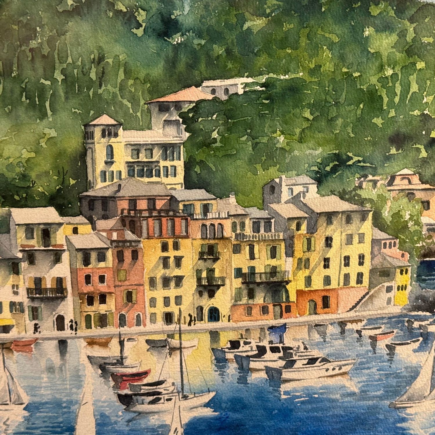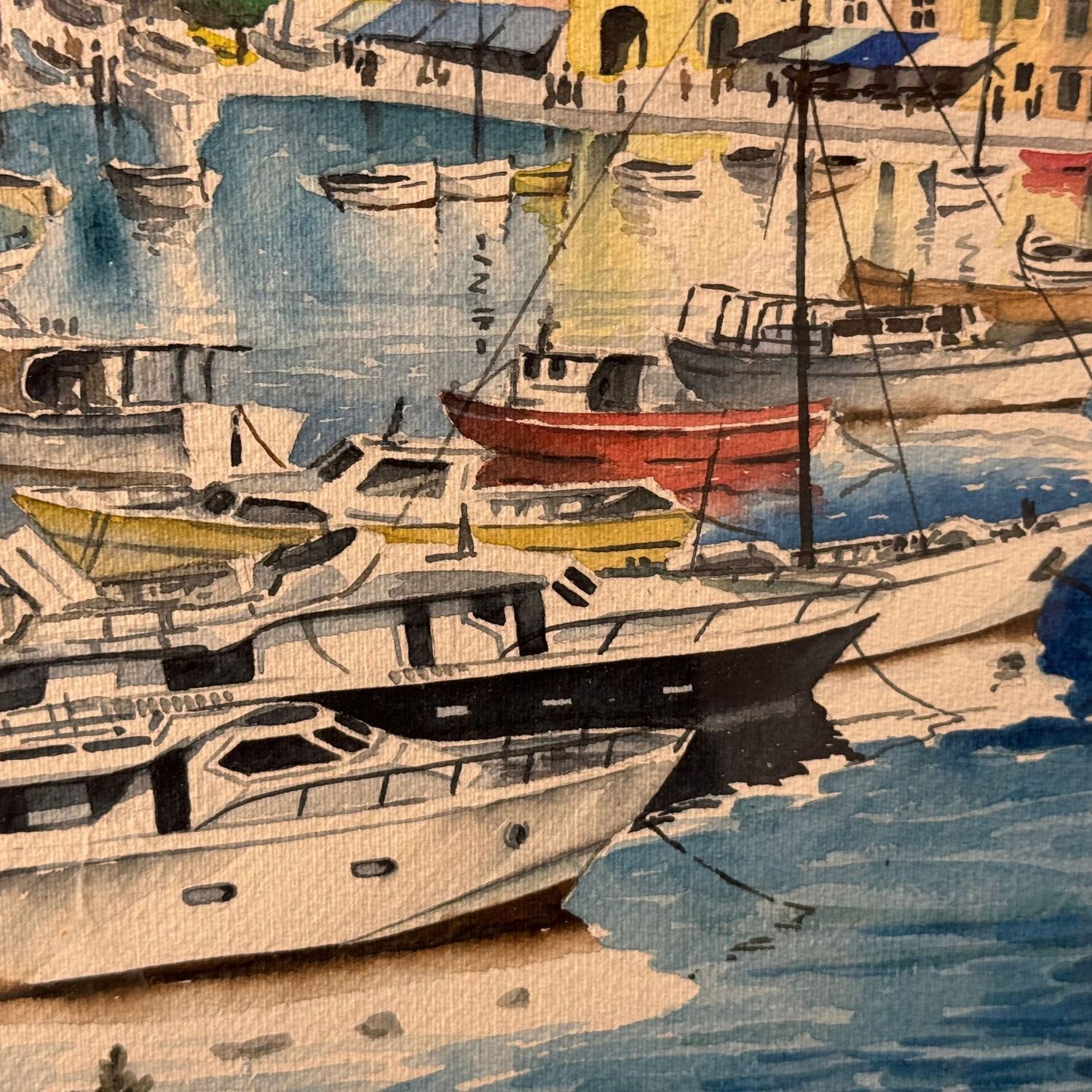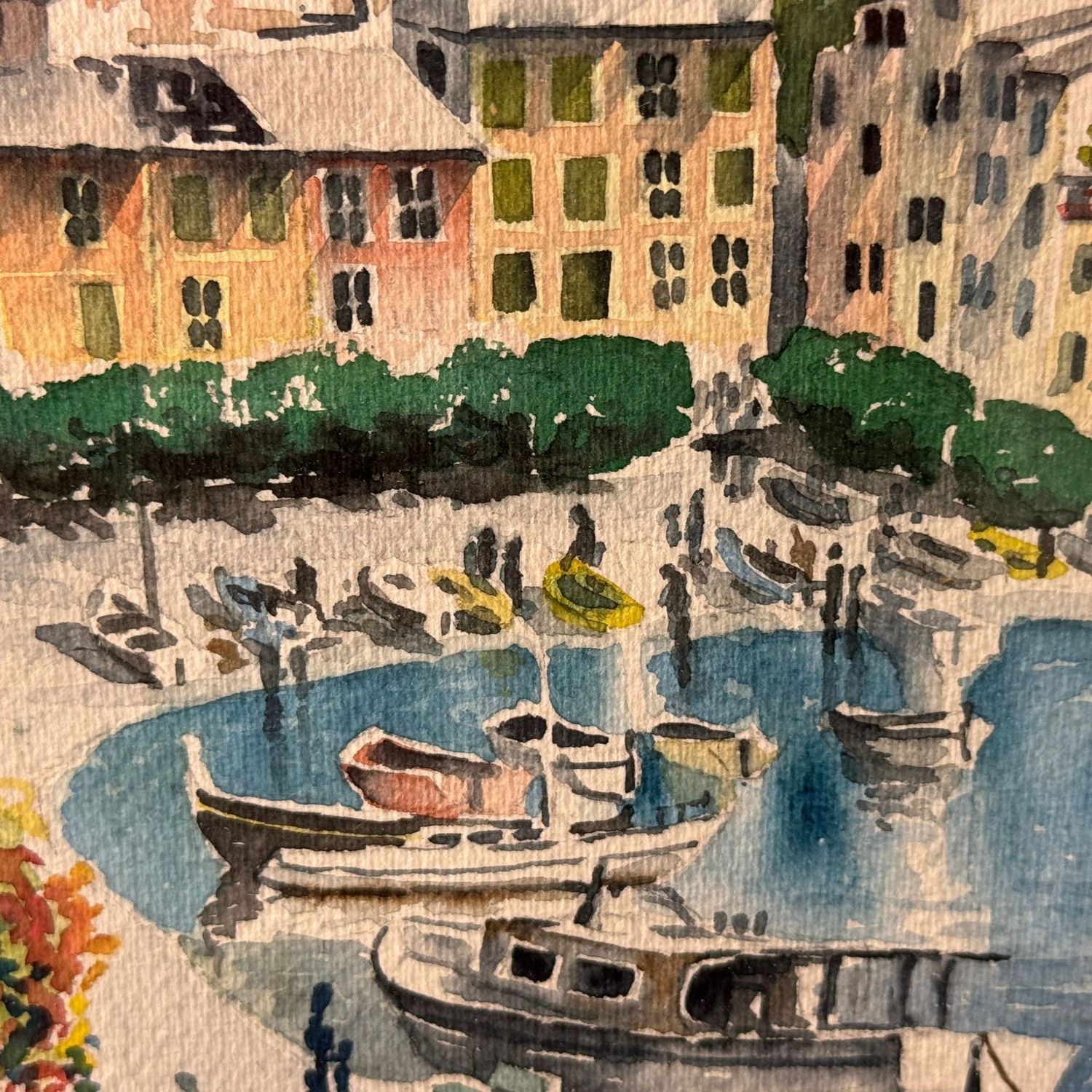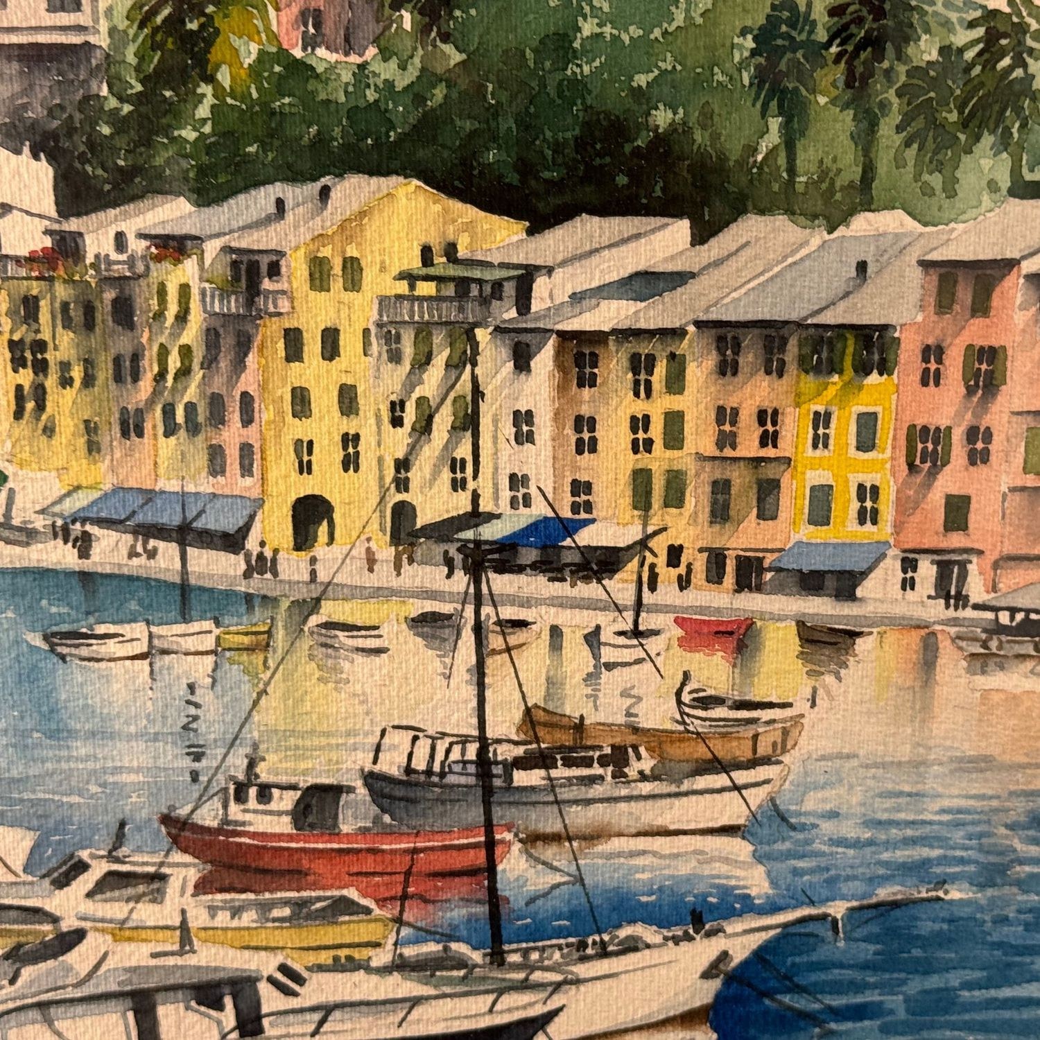 Watercolor painting on paper, 20th-century Italian school, depicting Portofino. Frame dimensions: 74x53 cm. Dimensions including frame: 66x88 cm. Signed in the lower right by an unidentified artist. The artwork is in good condition. Frame needs repair.