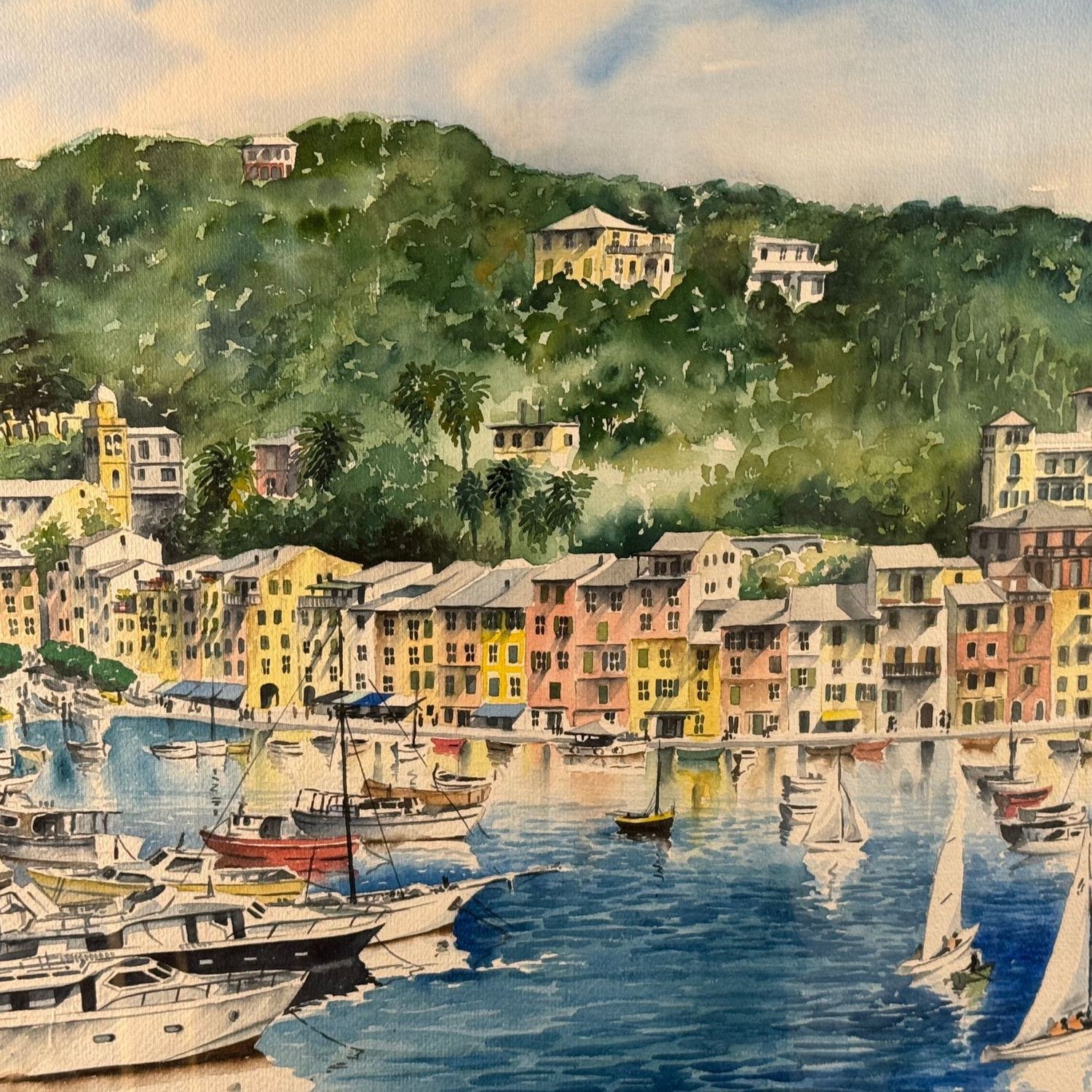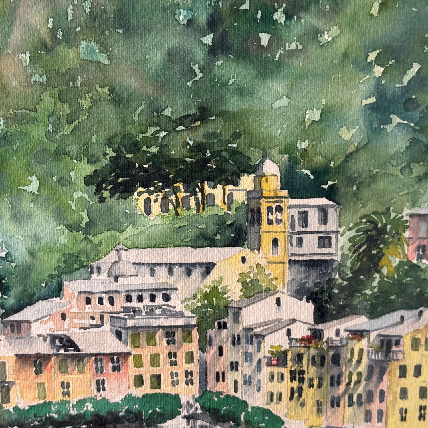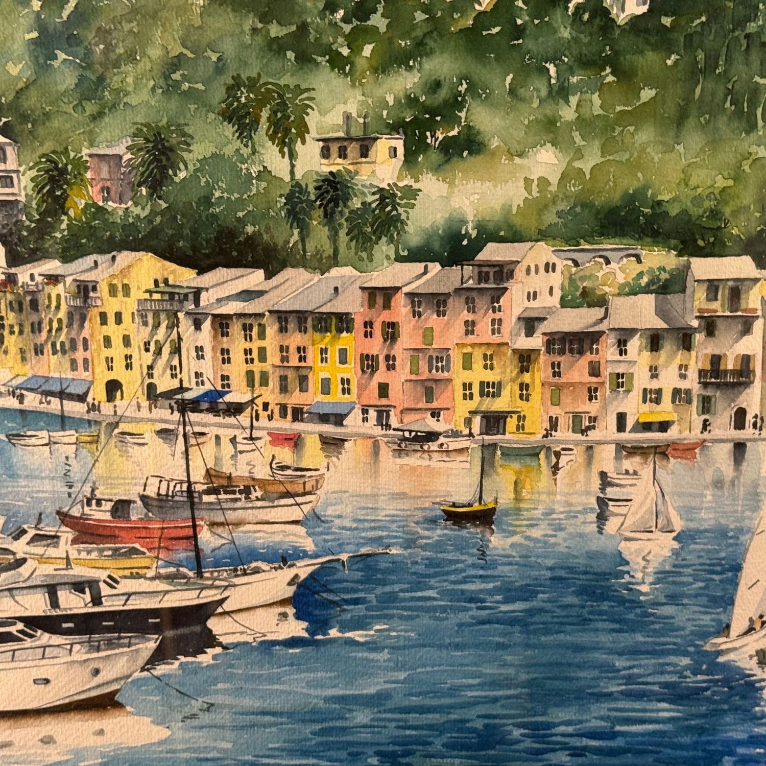 Watercolor painting on paper, 20th-century Italian school, depicting Portofino. Frame dimensions: 74x53 cm. Dimensions including frame: 66x88 cm. Signed in the lower right by an unidentified artist. The artwork is in good condition. Frame needs repair.