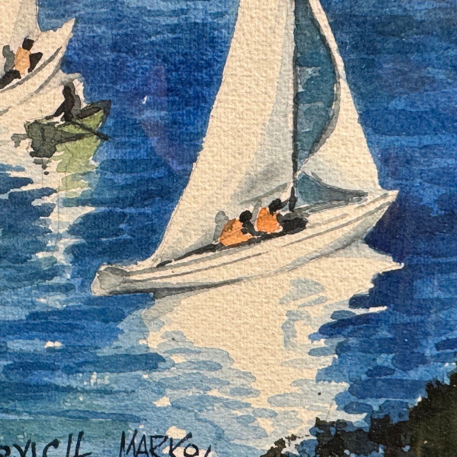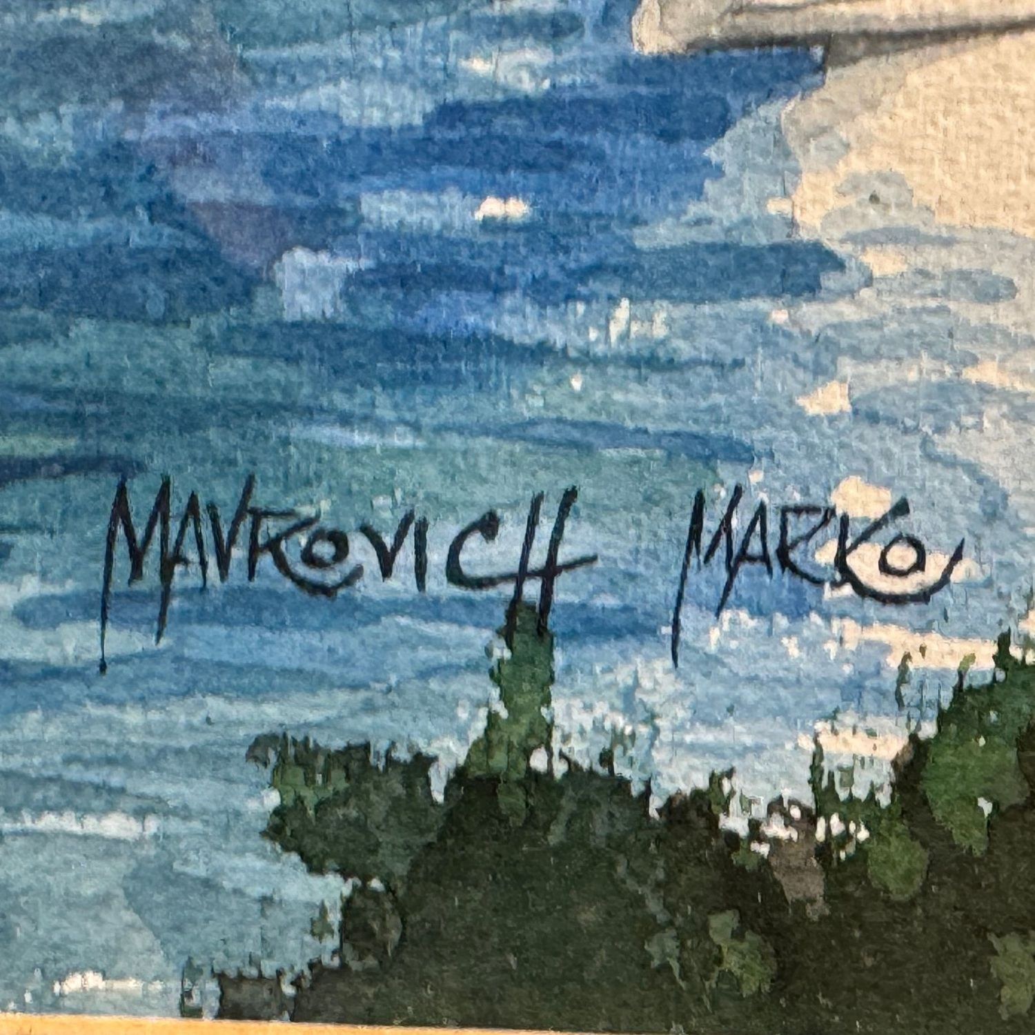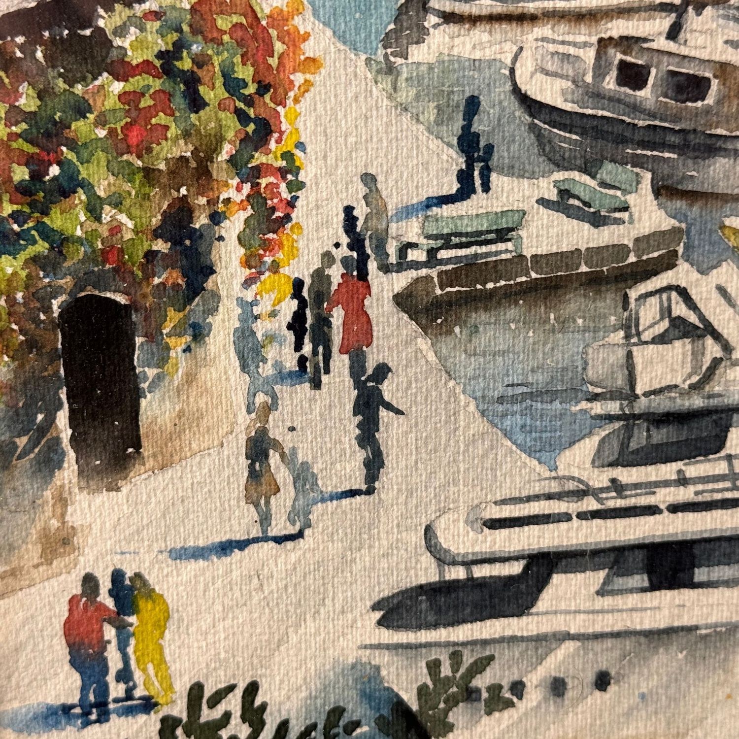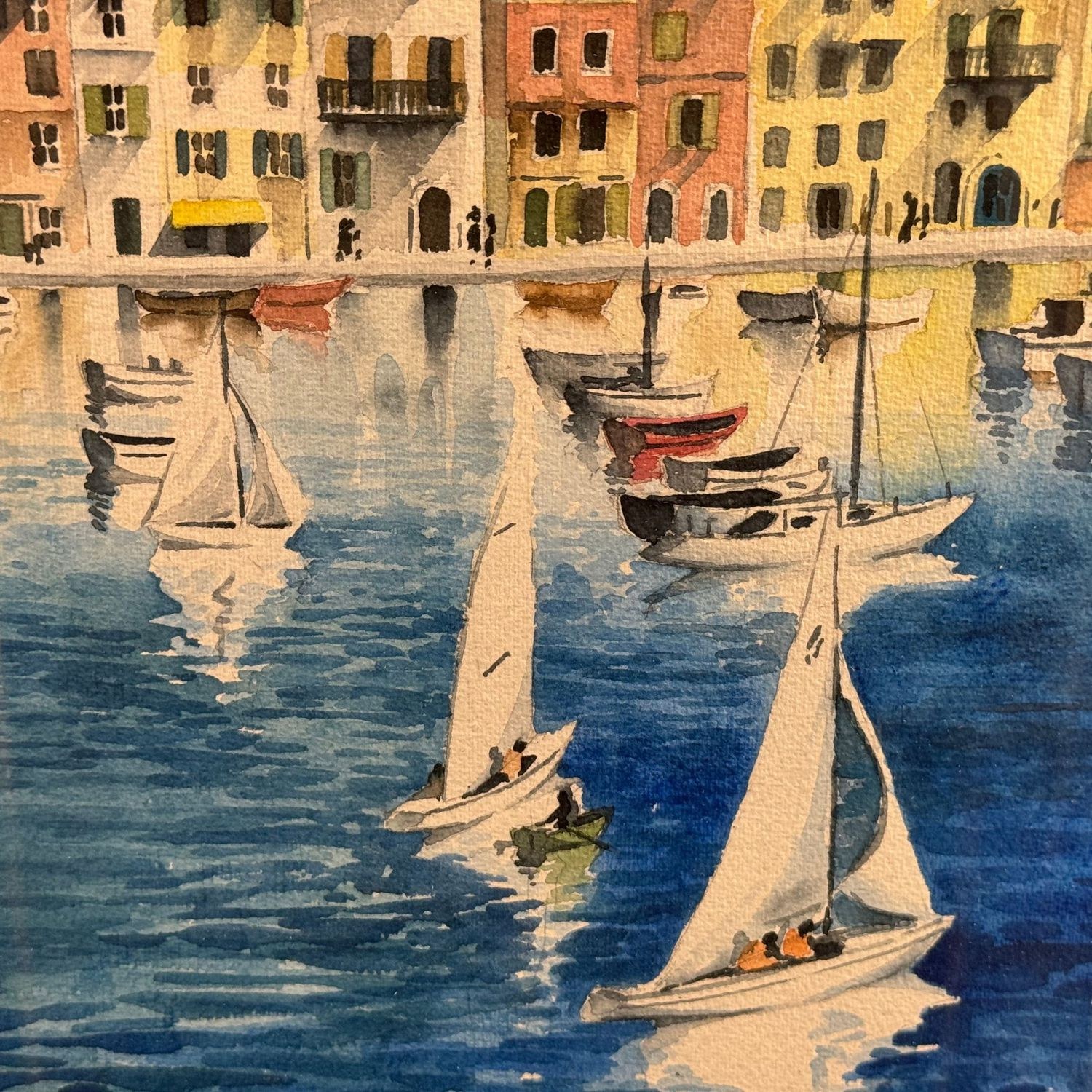 Watercolor painting on paper, 20th-century Italian school, depicting Portofino. Frame dimensions: 74x53 cm. Dimensions including frame: 66x88 cm. Signed in the lower right by an unidentified artist. The artwork is in good condition. Frame needs repair.