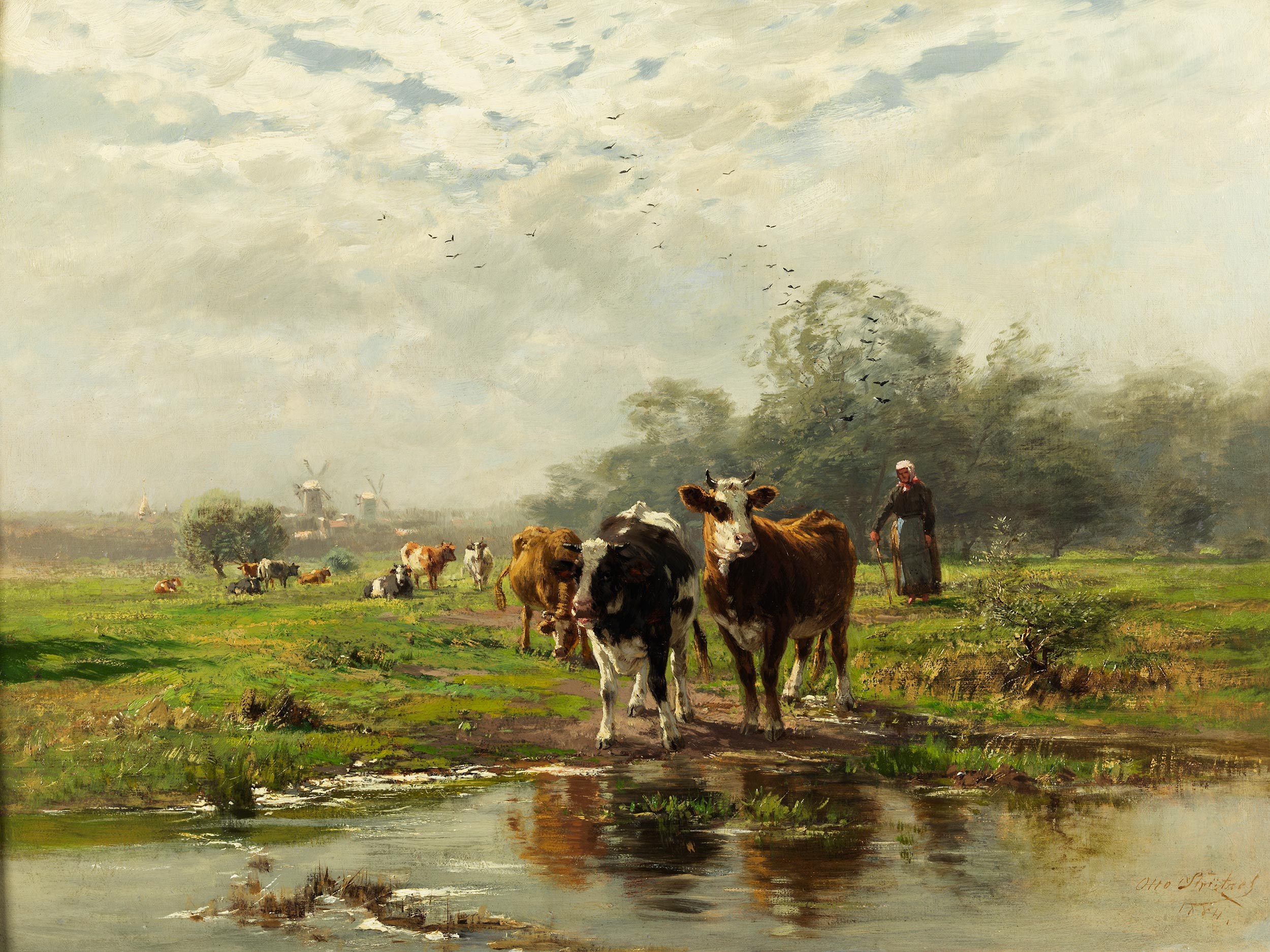 Im Vordergrund begleitet eine Bäuerin ihre Kühe zum Wasser, während sich im Hintergrund zwei Windmühlen abzeichnen. Die Details der Tiere und die Spiegelung des Baches werden durch den geschickten Einsatz von Farbe und Weiß hervorgehoben, um die Wirkung des Sonnenlichts zu unterstreichen.