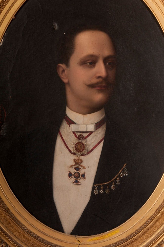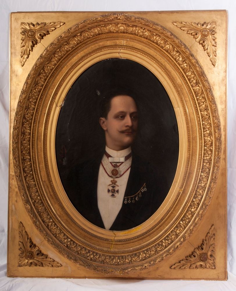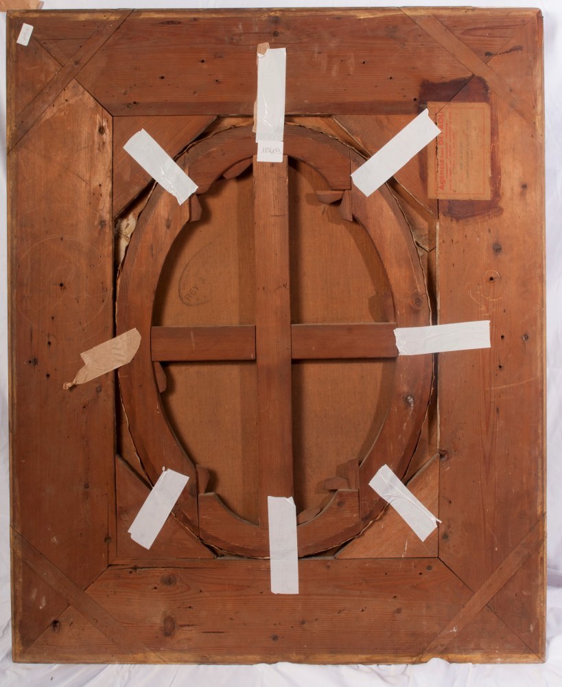 oval-shaped, signed in a contemporary triple-order gilded frame Condition: good with a hole and a loss, frame with minimal losses and wear.