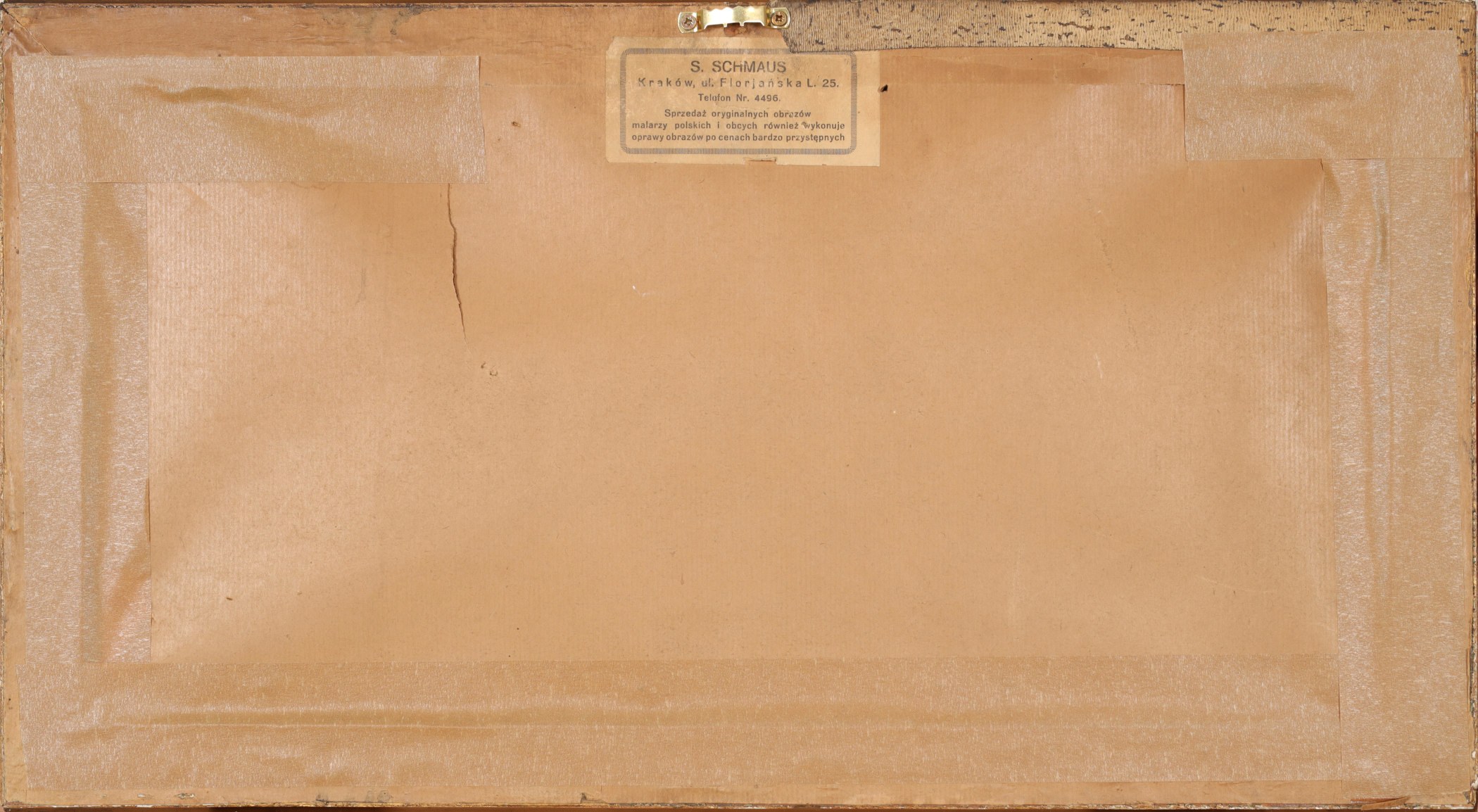 Na odwrocie oprawy metka sklepu i oprawy obrazów S. Schmausa przy ul. Floriańskiej 25 w Krakowie.
