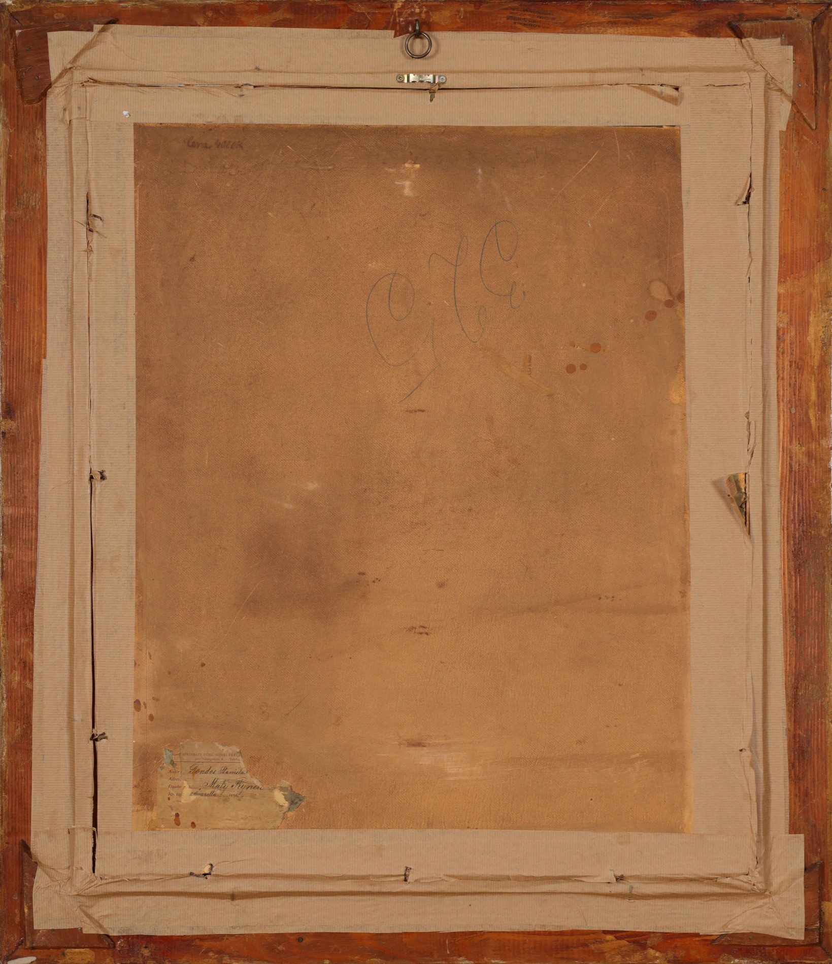 Na odwrocie częściowo zachowana historyczna metka z salonu sprzedaży dzieł sztuki.