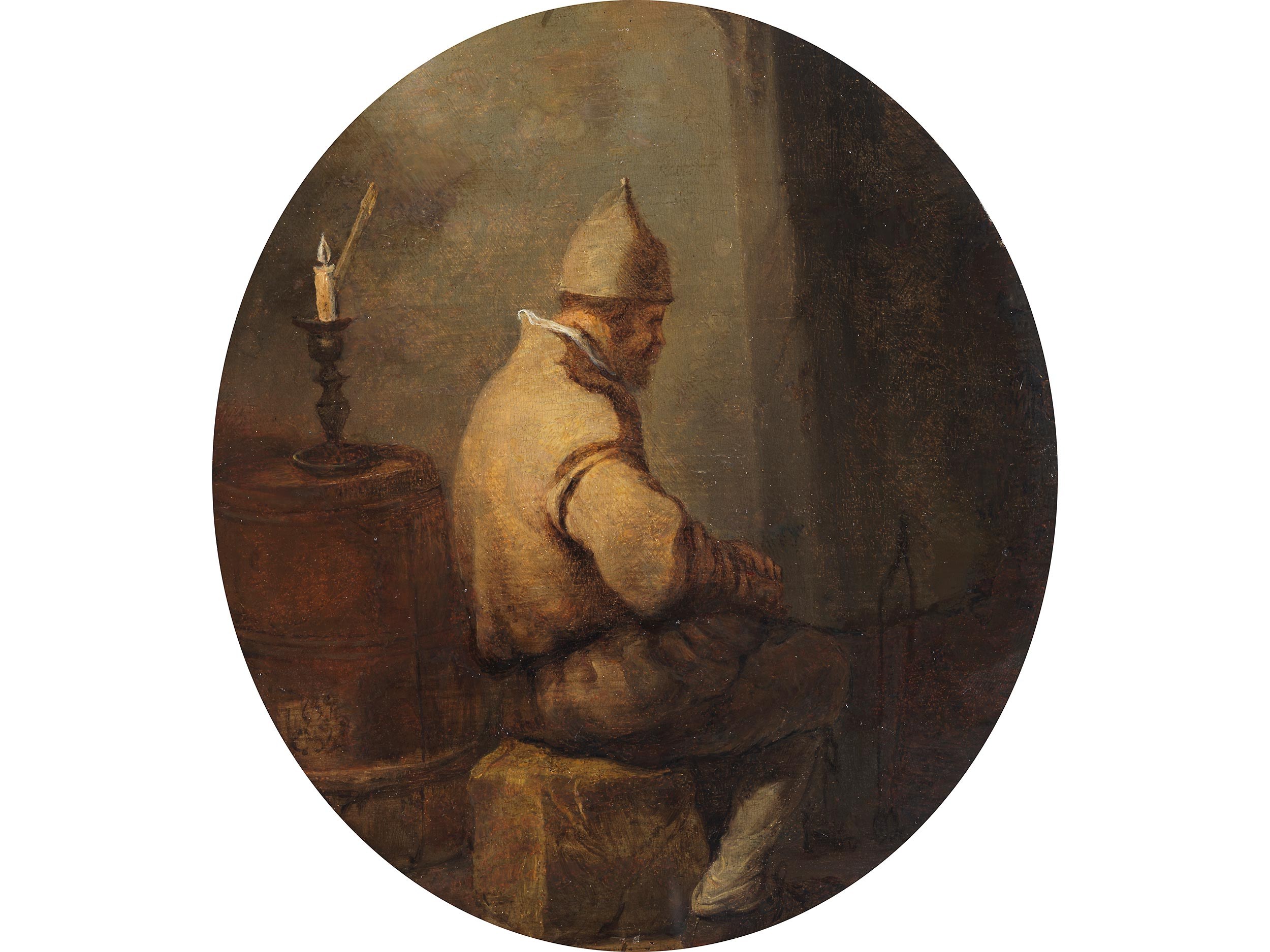 Im Profil nach rechts ein auf einem Holz- oder Steinblock sitzender Mann mit übereinandergelegten Händen und Kappe auf seinem Kopf, leicht nach unten blickend. Hinter ihm auf einem stehenden Fass, in einem Ständer, eine brennende Kerze. Malerei in monochromer beige-brauner Farbigkeit. (14217527) (18))