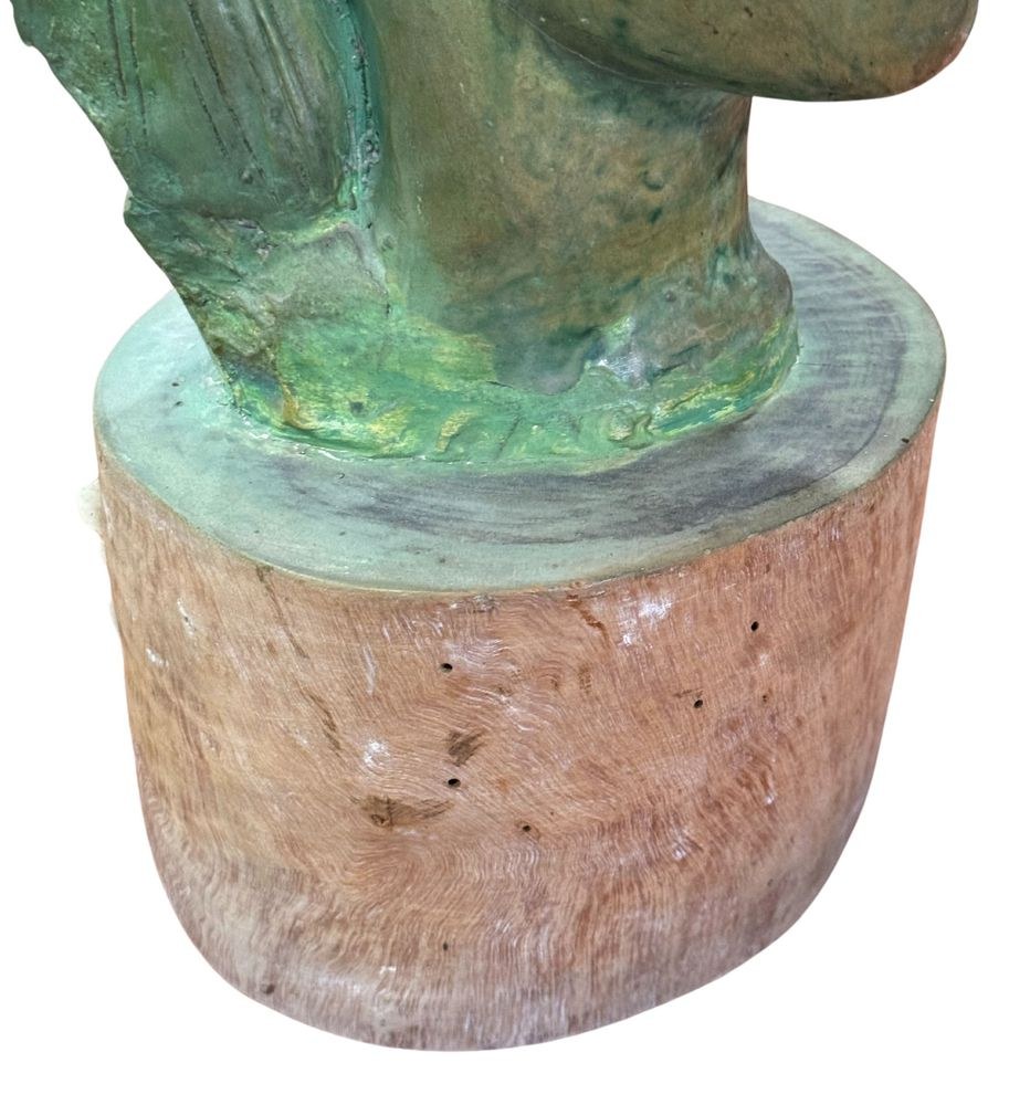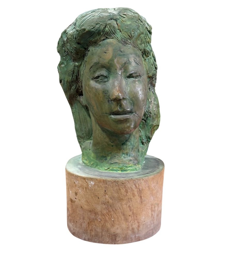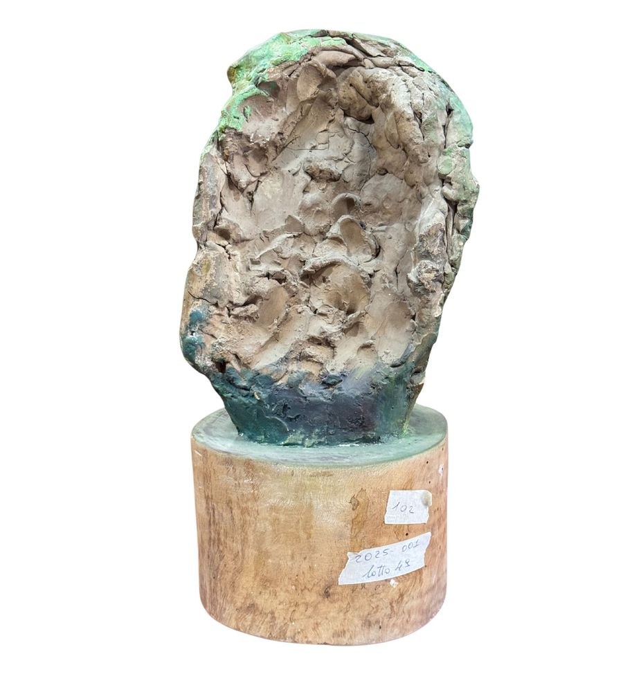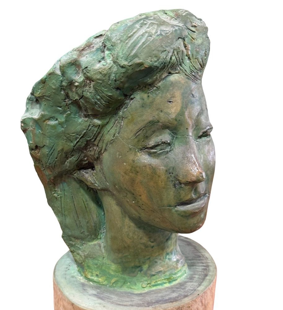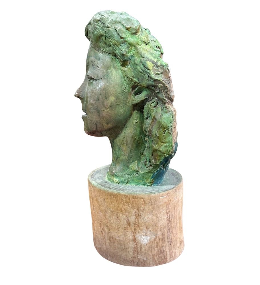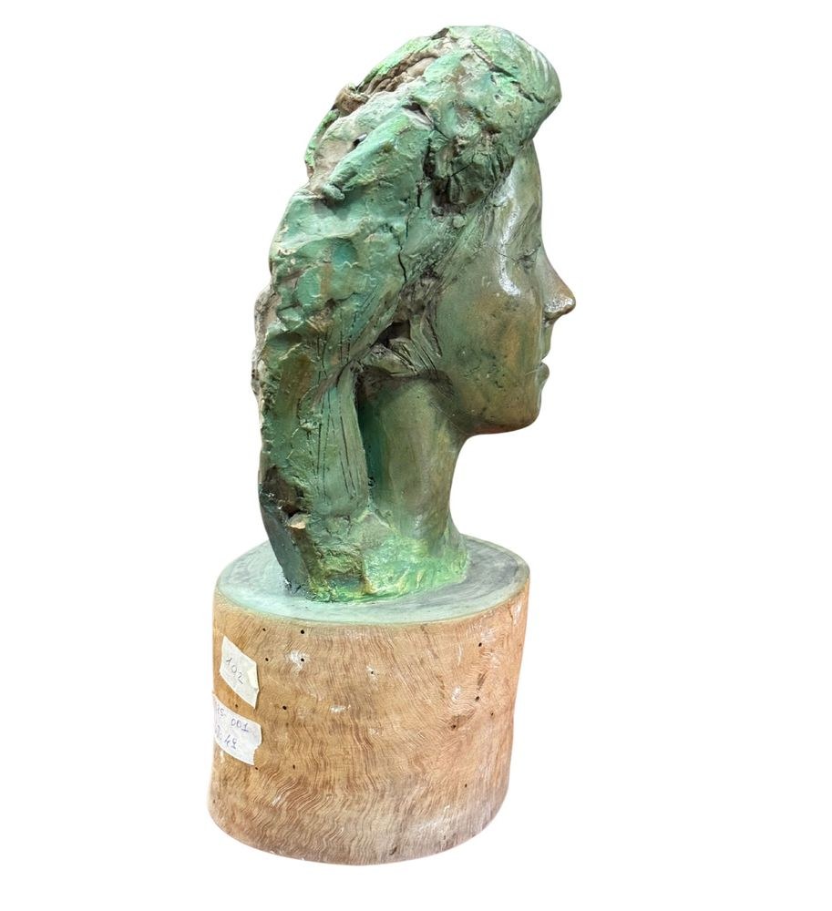 Terracotta sculpture on a wooden base, early 19th/20th century, depicting a Woman's Face. Dimensions: h43x20 cm. The sculpture is in good condition with slight signs of wear, as shown in the attached photos.