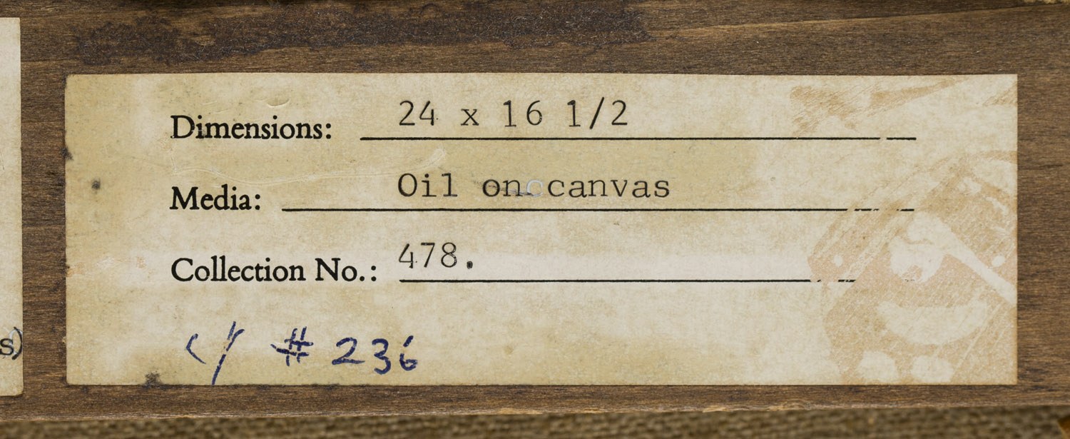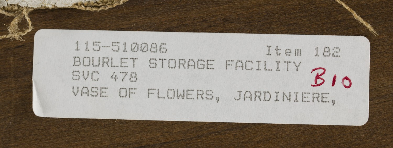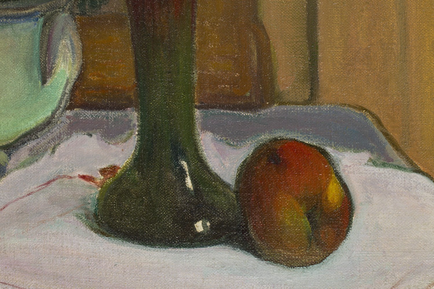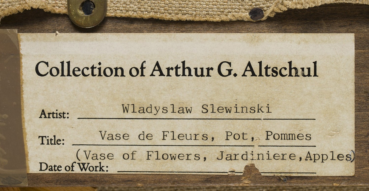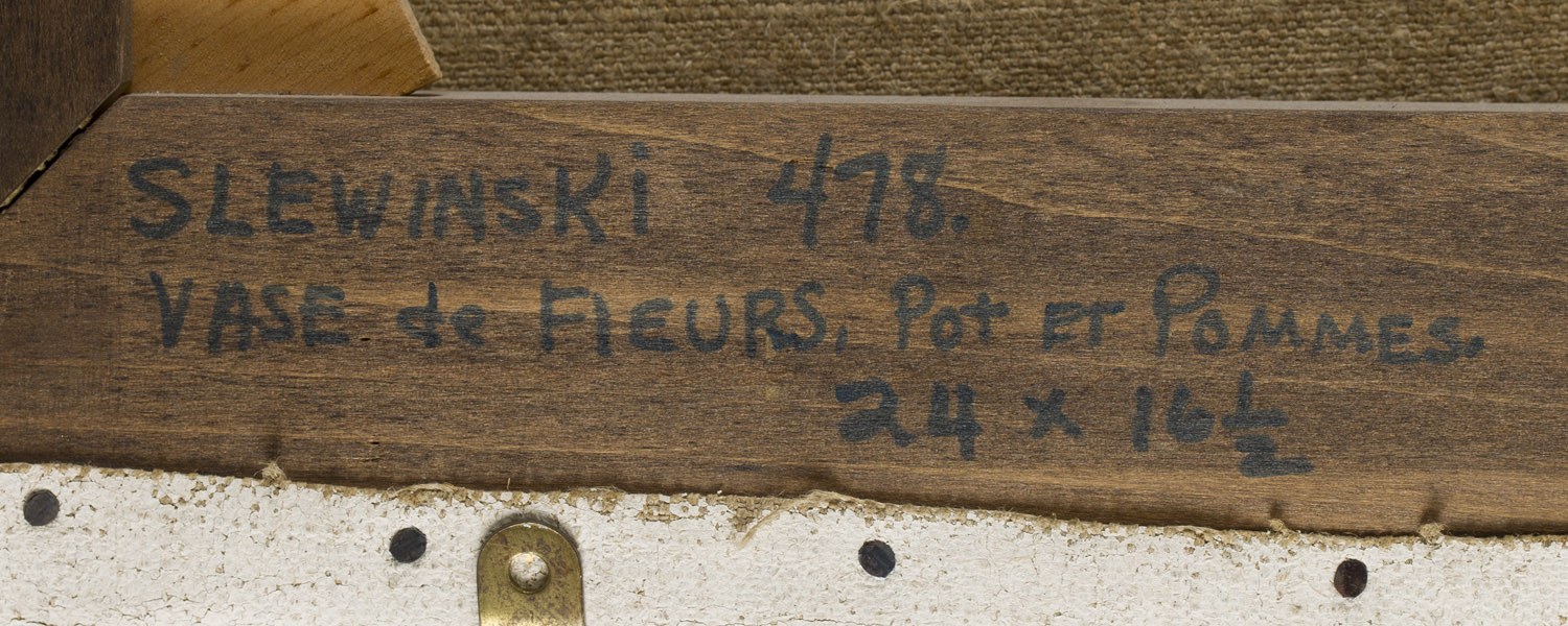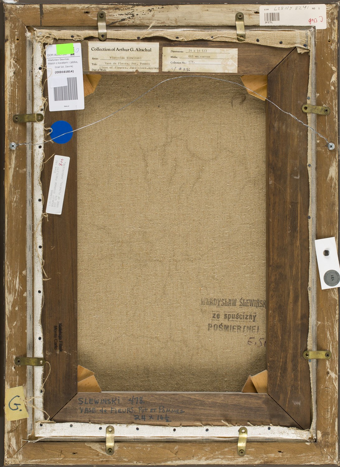 inne tytuły: Wysoki flakon z kwiatami, ceramiczna waza, jabłka; Vase de fleurs, pommes, ok.1903; na odwrociu stempel spuścizny po artyście; na krośnie malarskim nalepka inwentarzowa kolekcji Arthura G.Altschula oraz pieczęć kolekcjonera