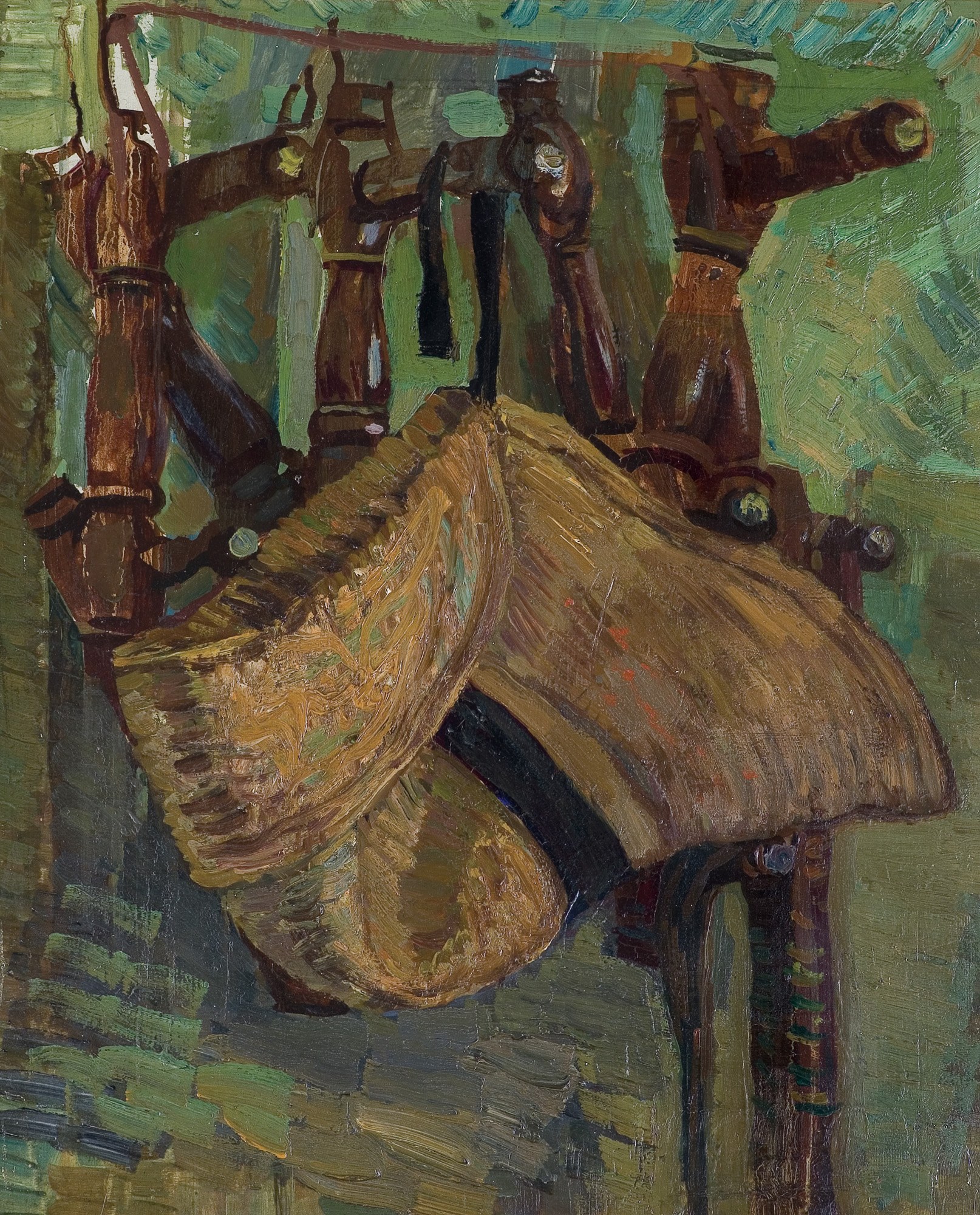 Martwa natura – gatunek, po który Waliszewski sięgał chętnie – w jego twórczości rzadko bywała klasycznym układem owoców czy naczyń. Częściej konstruował ją na zasadzie artystycznego eksperymentu, zestawiając ze sobą przedmioty codzienności i fragmenty pracowni, wydobywając ich autonomiczne piękno poprzez odważną kolorystykę i ekspresyjną fakturę. W Martwej naturze z kapeluszem przedmiot zostaje potraktowany niemal jako żywy model – słomkowe nakrycie głowy zawieszone na stojaku ukazane jest w gęstej sieci pociągnięć pędzla, które rozbijają kontury.