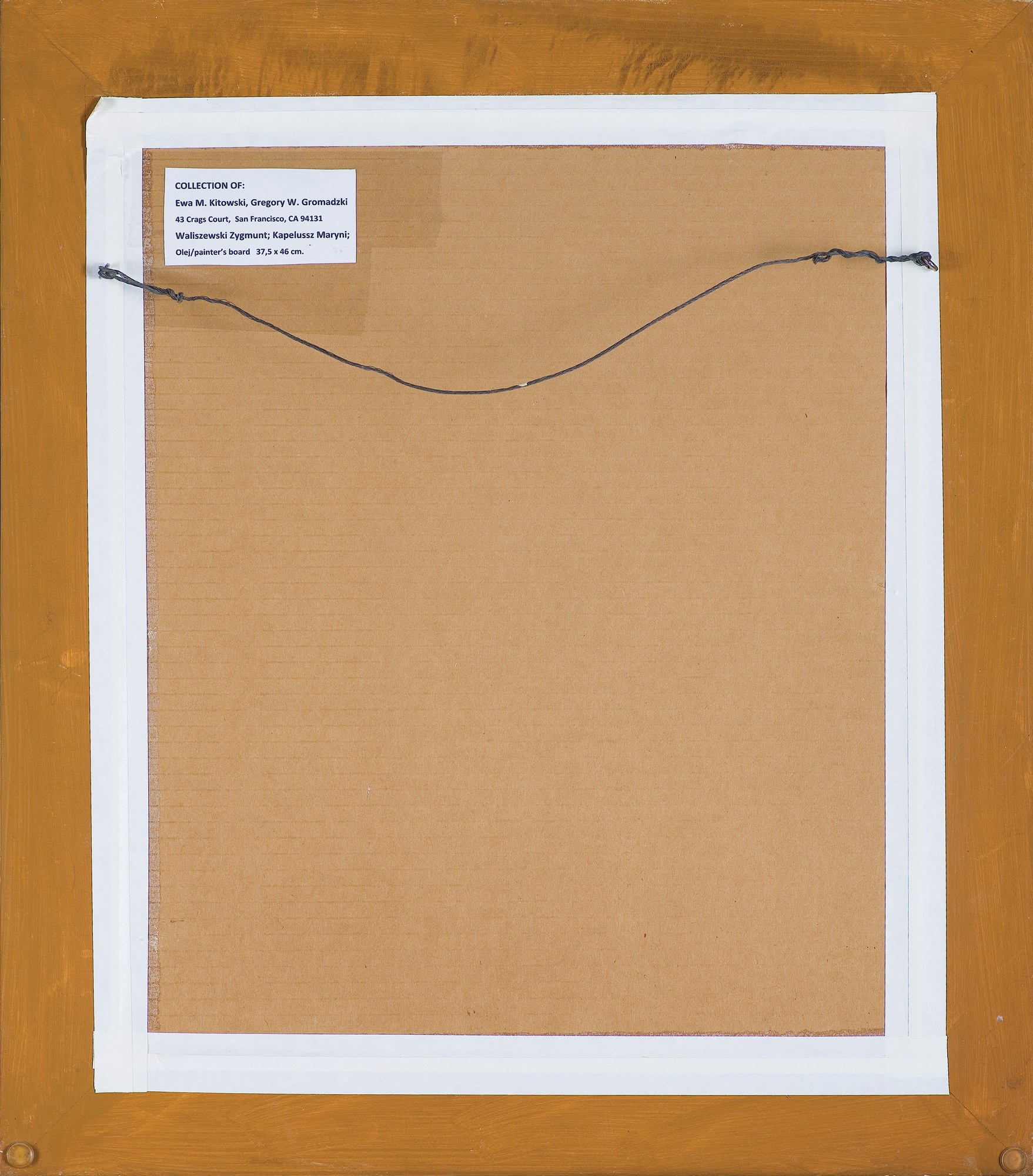 Na odwr. pieczęć z nr. 8 (odnoszącym się do wielkości podobrazia); wzdłuż d. krawędzi napis: Waliszewski; na tzw. „zaplecku“ nalepka właścicielska z opisem obrazu.