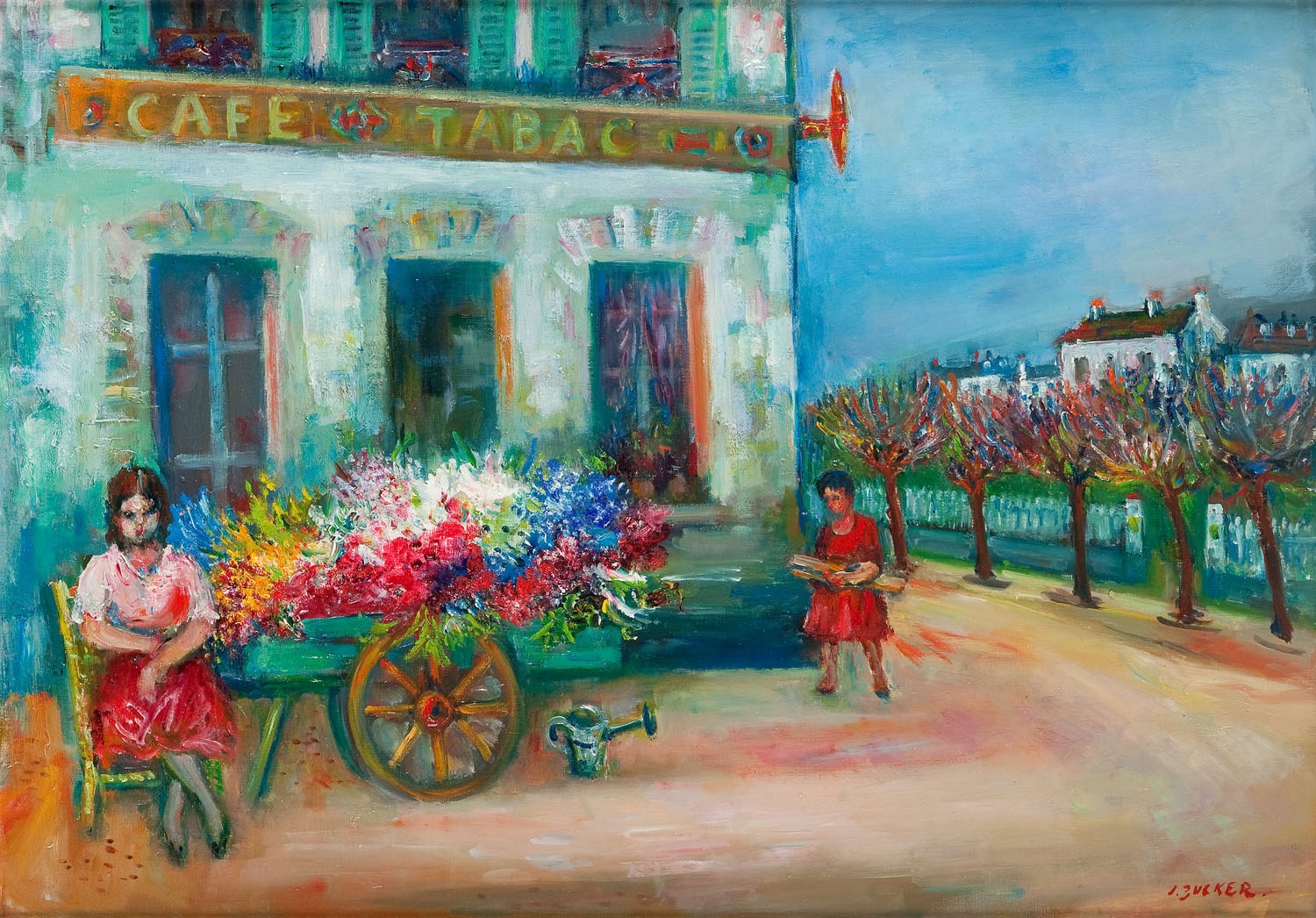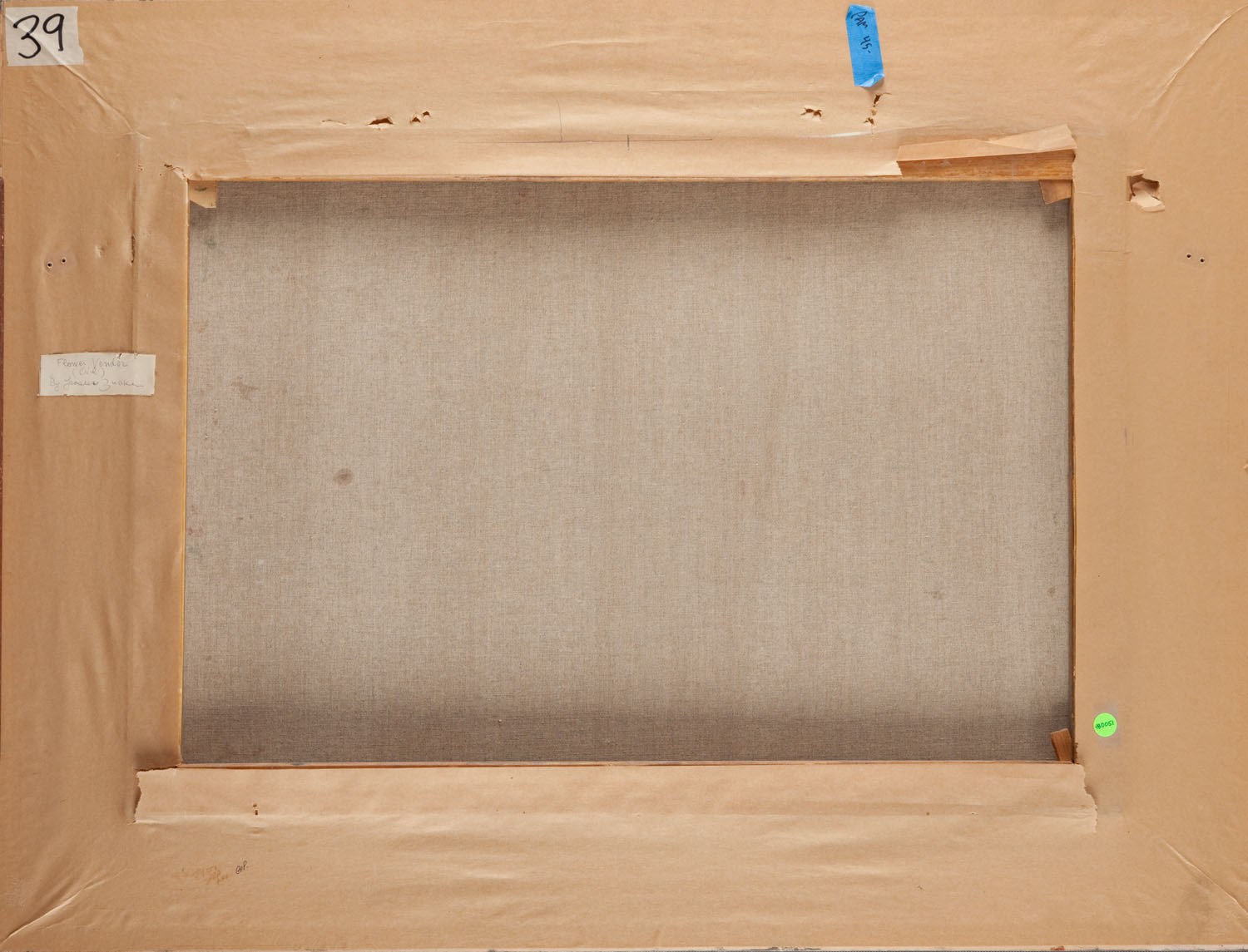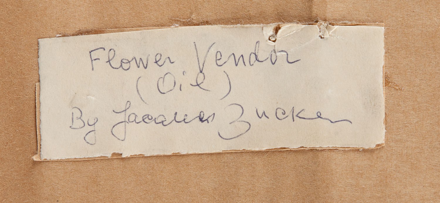na odwrociu liczne nalepki z numerami oraz papierowa nalepka z opisem: 'Flower Vendor | (oil) | By Jacques Zucker'