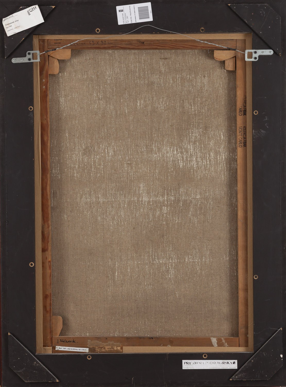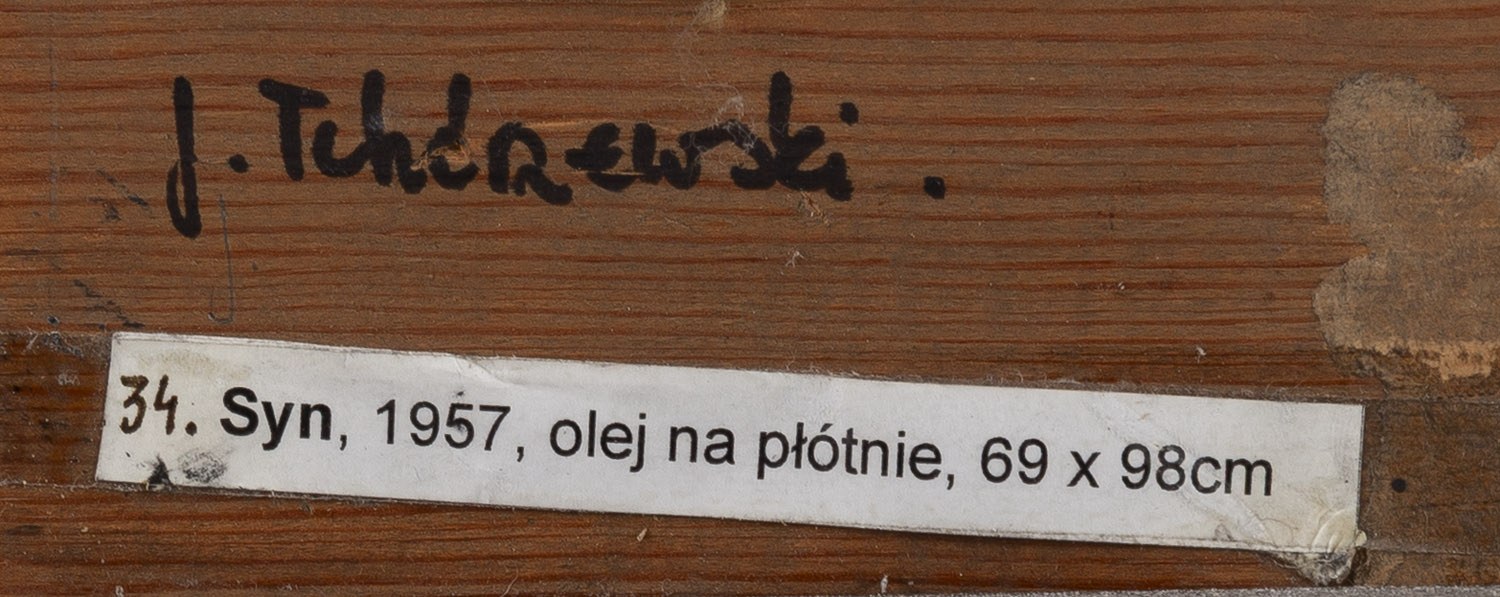 na krośnie sygnowany i opisany: 'wymiar 69 x 98 cm | J. Tchórzewski' nalepka '34. Syn 1957, olej na płótnie, 69 x 98 cm', nalepka Pracowni Podkomorskiej oraz stempel 'Kolekcja Fibak | Monte Carlo'