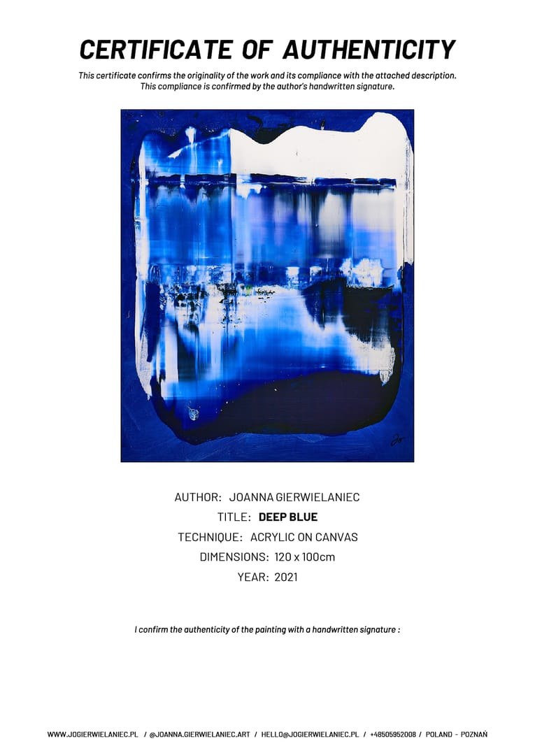 Wyrazista, energetyczna, głęboka plama koloru. Idealna jako akcent kolorystyczny we współczesnym wnętrzu. Kompozycja dynamicznych gestów tworzy abstrakcyjną, unikalną przestrzeń. Wzburzone fale, przenikające się przestrzenie, głębia ? A może gra światła. Zapraszam Cię byś poczuł ten obraz po swojemu, nadał mu swoją interpretację. Kompozycja pełna napięcia i tajemnicy. Obraz dopasuje się do wielu typów wnętrz. Sygnowany obustronnie. Płótno naciągnięte na drewnianą, boki zamalowane, gotowy do powieszenia. Zabezpieczony satynowym werniksem.
