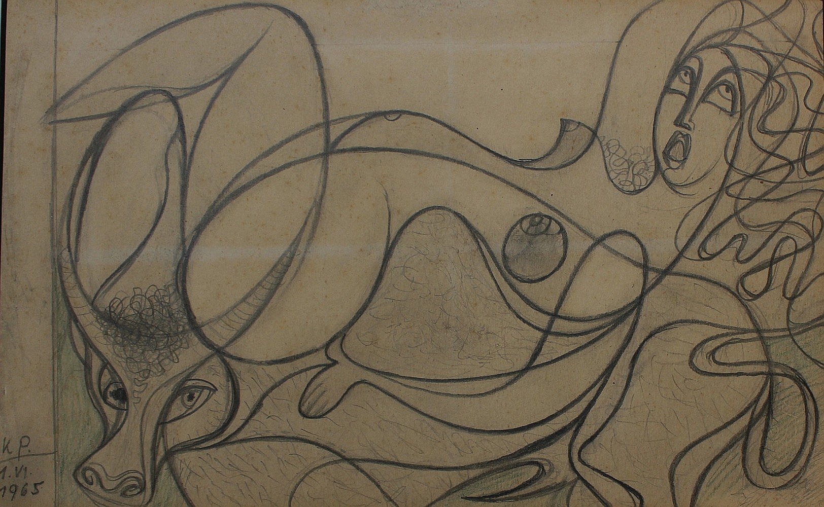 Porwanie Europy [Akt z bykiem](1965) sygn.dat.l.d. monogramem K.P. / 1. IV. / 1965
