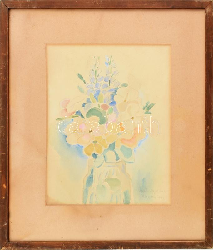 Kmetty János (1889-1975): Csendélet. Akvarell, ceruza, papír, jelezve jobbra lent (Kmetty 1943), Kmetty János autográf dedikációjával (Sch... Magdinak). Üvegezett fakeretben, 30×23 cm / János Kmetty (1889-1975): Still life. Watercolour on paper, signed lower right. Framed. 30×23 cm