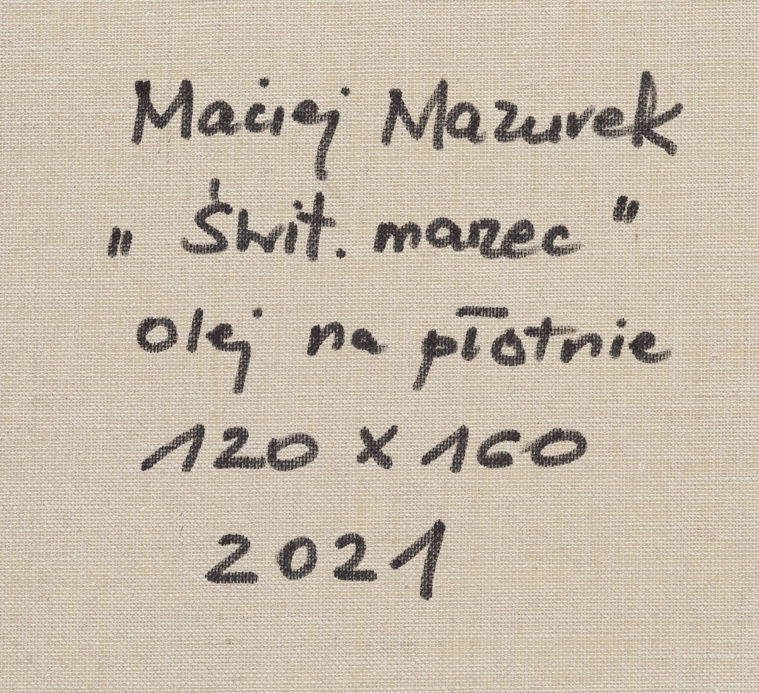 sygnowany, datowany i opisany na odwrociu: 'Maciej Mazurek | "Świt. marzec" | olej na płótnie | 120 x 160 | 2021'