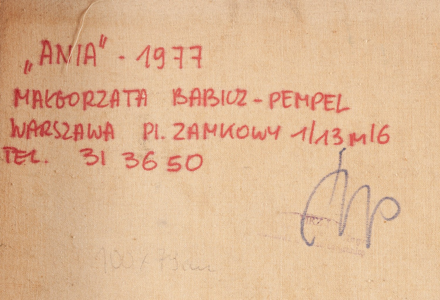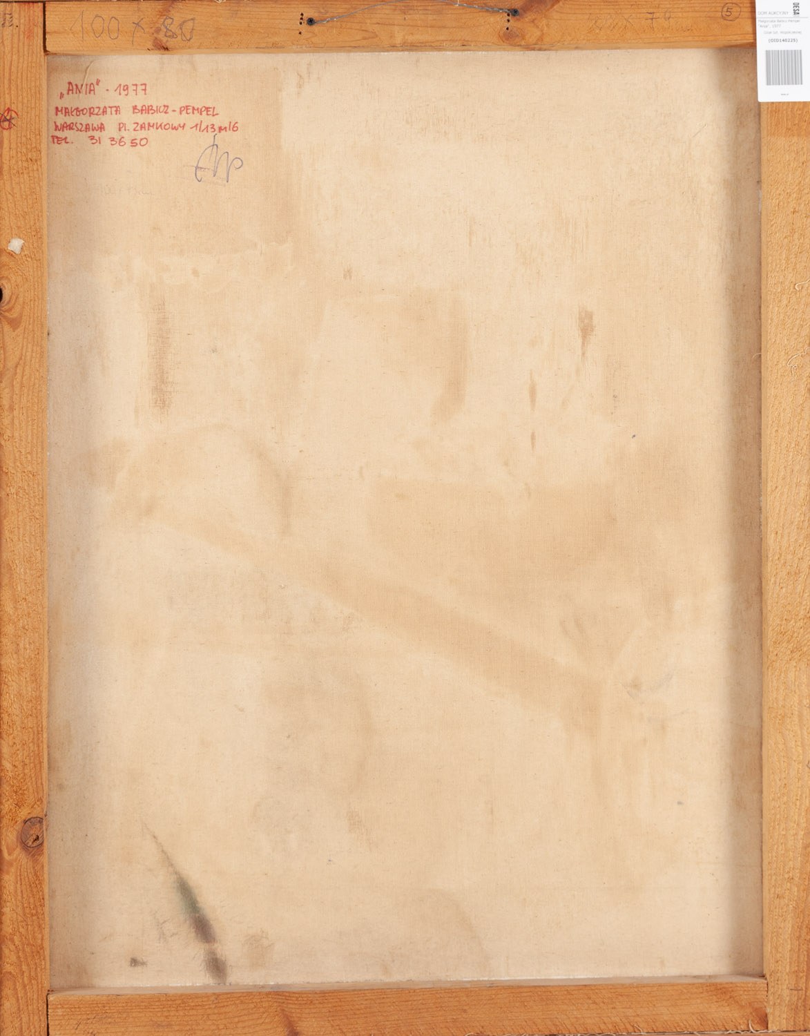 sygnowany, datowany i opisany na odwrociu: '"ANIA" - 1977 | MAŁGORZATA BABICZ-PEMPEL | [dane kontaktowe] | 100 x 79 cm' oraz pieczęć wywozowa