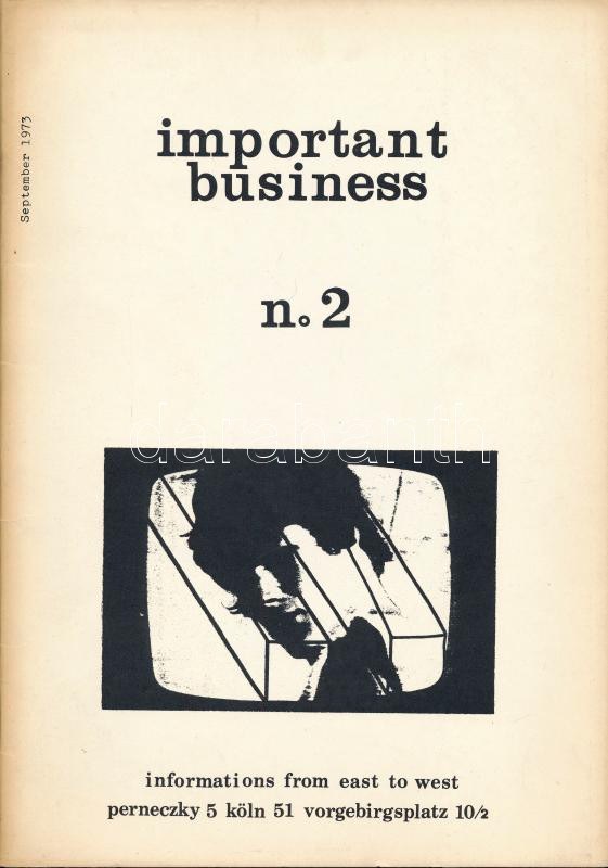 Géza Perneczky: Important Business No. 2. Hopp-Halász Károly (1946-2016), a Pécsi Műhely tagjának 5 db nyomatával a modulált televízió (modulated television) sorozatból és Perneczky Géza (1936-) 4 db nyomatával (modulate person). Nyomat, papír, jelzett a nyomaton. Köln, 1973, Perneczky Géza kiadása. Kiadói papírmappában, mappa hátoldala alján és néhány lap szélénapró sérüléssel, máskülönben jó állapotban. Rendkívül ritka, az NSZK-ban kiadott emigráns magyar neo-avantgárd kiadvány, tudomásunk szerint korábban Magyarországon nem szerepelt árverésen!