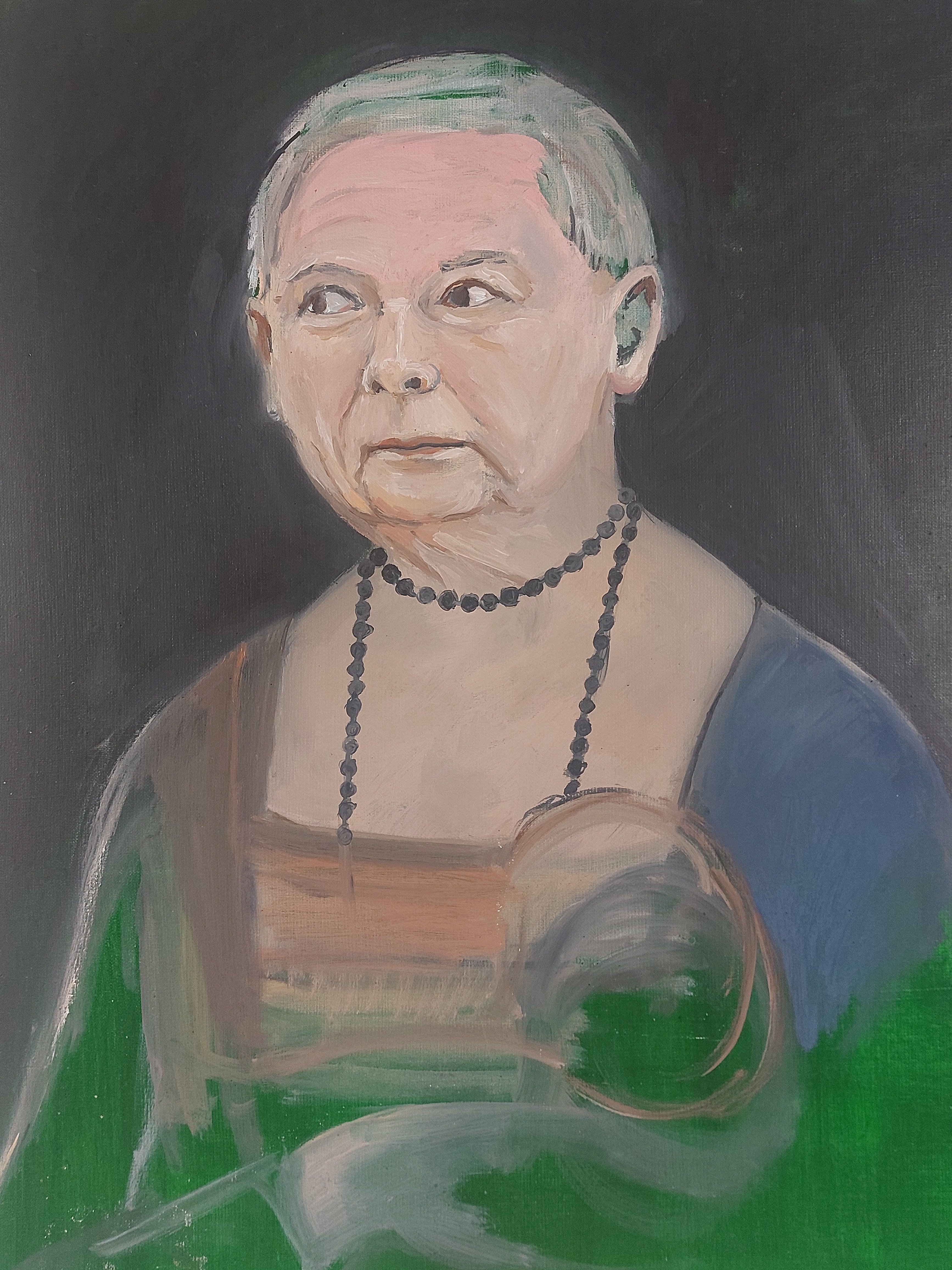 na pewno zupełnym przypadkiem przypomina jednego z popularnych polityków choć opisu tudzież podpisu brak... W naszej małej galerii obraz ten budził tak ogromne emocje i mieliśmy wiele pytań o cenę długo nie mogąc się na nią zdecydować. Informowaliśmy więc naszych Klientów, że obraz wystawiony zostanie na cele charytatywne. Praca była przez Nas wystawiona na licytacje na jednym z aukcyjnych portali publicznych, jednak została przez kogoś zgłoszona jako naruszenie regulaminu, co za tym idzie usunięta z ofert - mimo, iż wystawiona była na cel charytatywny dla WOŚP, tuż przed finałem. Ponieważ nie odpuszczamy w takich sytuacjach praca pojawia się tu! Bardzo prosimy o wyrozumiałość, czasem przymrużenie oka i szacunek bo suma summarum jest to dalej sztuka a sztuka ma budzić emocje! Rozbudźmy więc je razem wspólnie robiąc z tego coś dobrego! :)