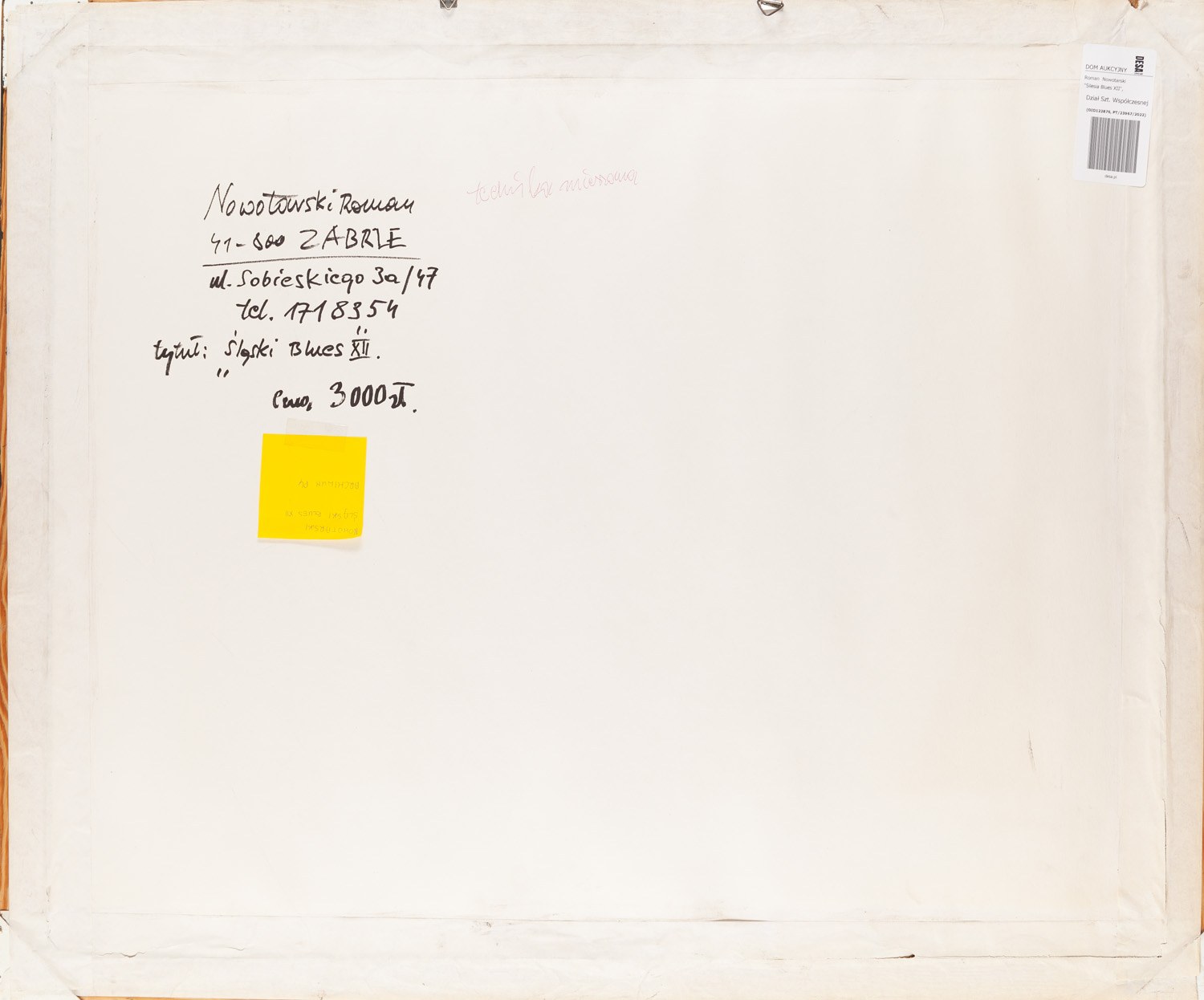 sygnowany i opisany na odwrociu: 'Nowotarski Roman | [dane adresowe] | tytuł: "Śląski Blues XII"'