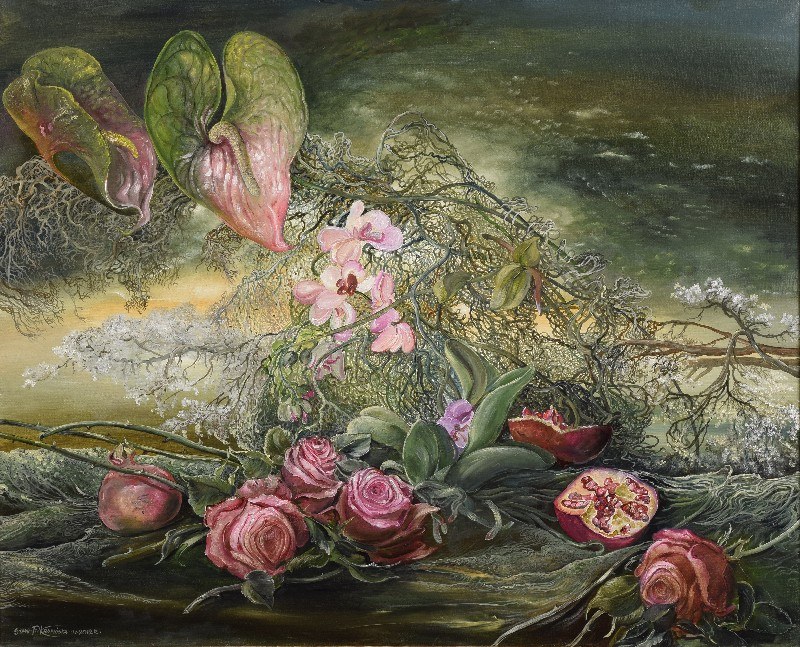 opisany na odwrocie: STANISŁAWA P. KRUPIŃSKA IV.2012 R. / OLEJ 65 x 81 cm / tytuł napisany ołówkiem na blejtramie na odwrocie: TYT. "ANTURIUM i GRANATY".