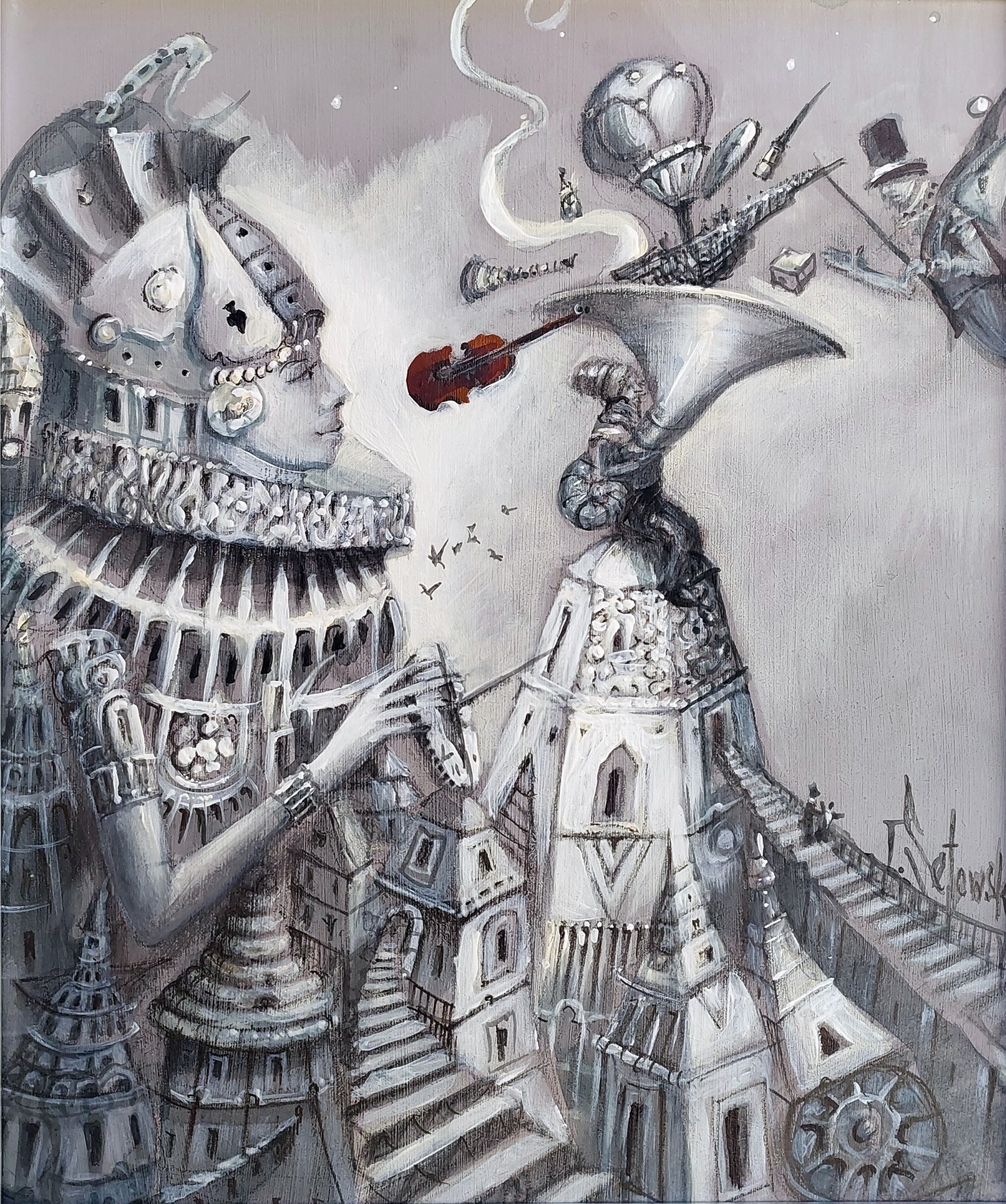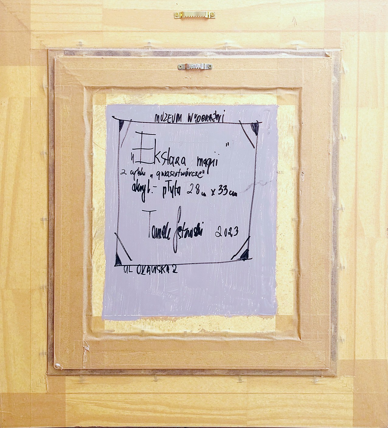sygnowany, datowany i opisany na odwrocie: MUZEUM WYOBRAŹNI / „Ekstaza Magii” z cyklu „gwaszotwórcze” / akryl. - płyta / 28 cm x 33 cm / Tomek Sętowski 2023 / ul. Oławska 2;