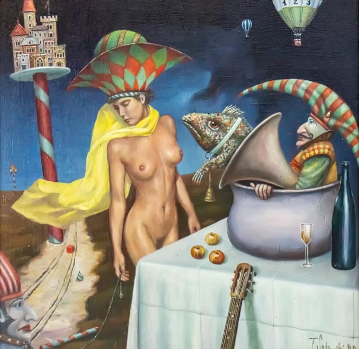 Wspaniały przykład malarstwa realizmu magicznego, z którego znany jest Tomasz Sętowski – jeden z najbardziej rozpoznawalnych polskich surrealistów. Kompozycja o tytule „Przywołanie Hermesa” przywołuje mityczny motyw posłańca bogów, osadzony w uniwersum artysty – złożonym z architektonicznych struktur, symboli czasu, skrzydeł, zegarów i postaci w formie monumentalnych hybryd.