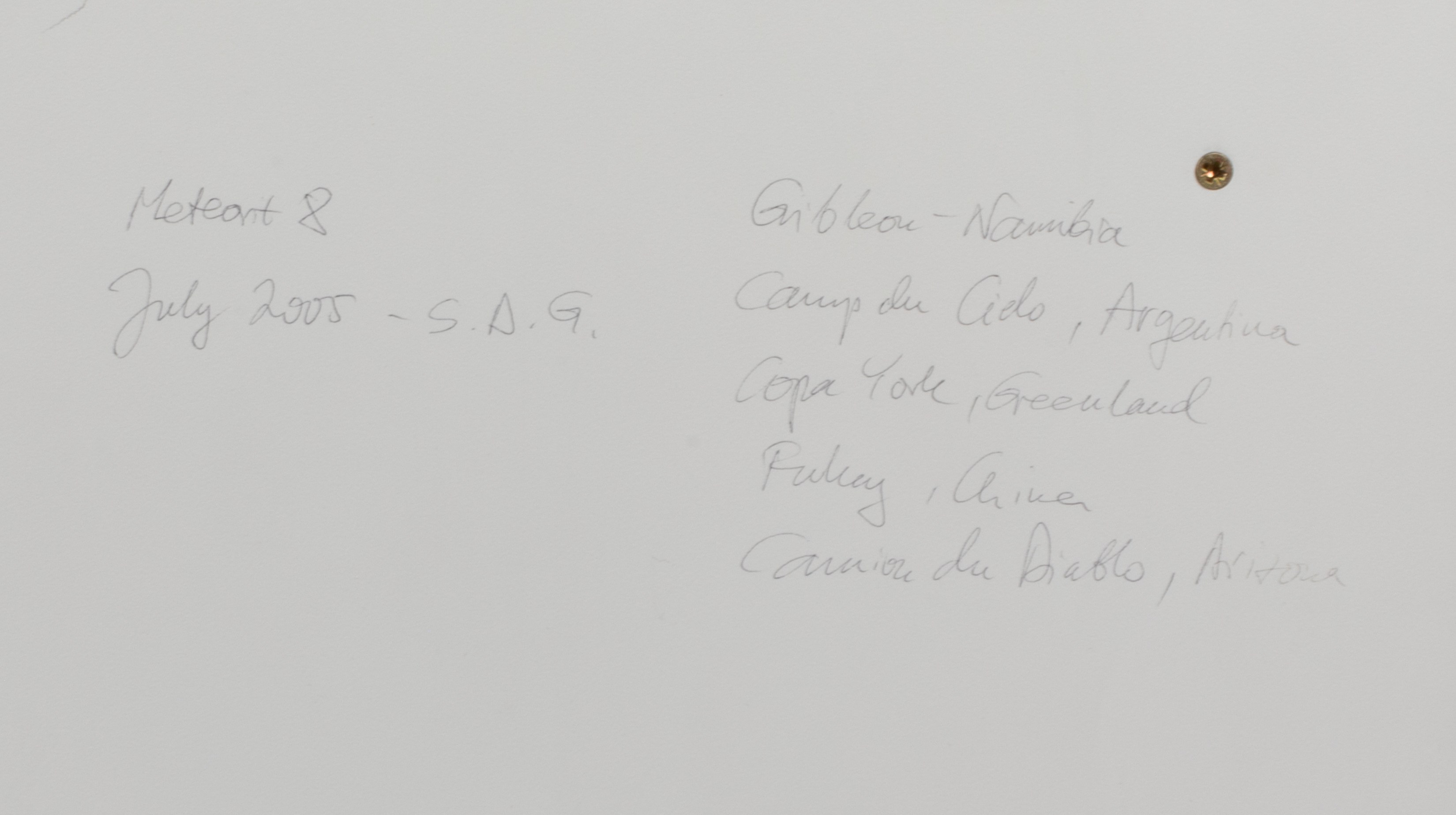 Meteorite, mixed media with meteor dust from Gibleou (Namibia), Campo del Cielo (Argentina), Cape York (Greenland), Puliey (China) and Cañón del Diablo (Arizona), inscribed on the reverse ''Meteorit 8 July 2005 - S. D. G.'', 32 cm × 33.5 cm (visible dimensions), 38 cm × 36 cm with plexiglass frame, mounted
