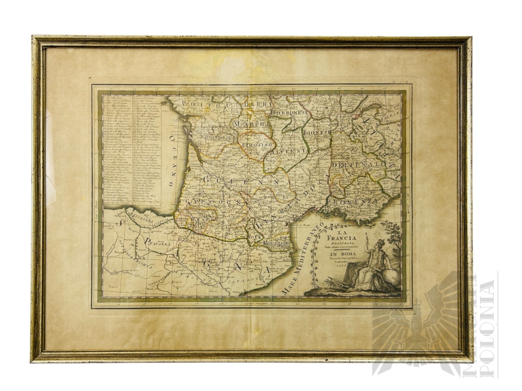 Mapa południowej Francji z 1794 roku opublikowana w Atlasie Cassiniego 'Nuovo Atlante Geografico Universale' . Stan jak na zdjęciach. ,Wymiary : z ramą 48 cm x 64 cm