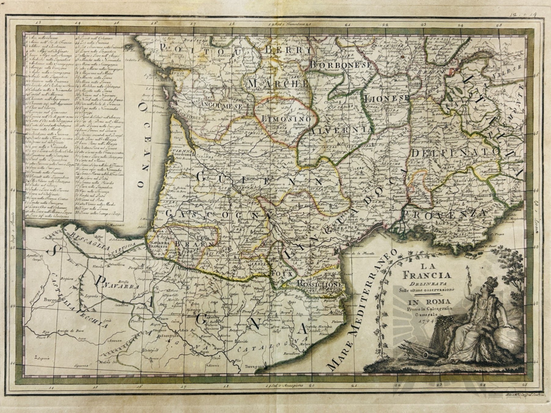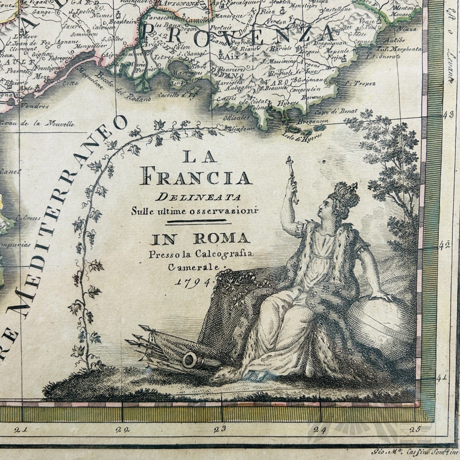 XVIII Wiek - Mapa Południowa Francja 1794 "La Francia Delineata sulle ultime osservazioni" G. M. Cassini