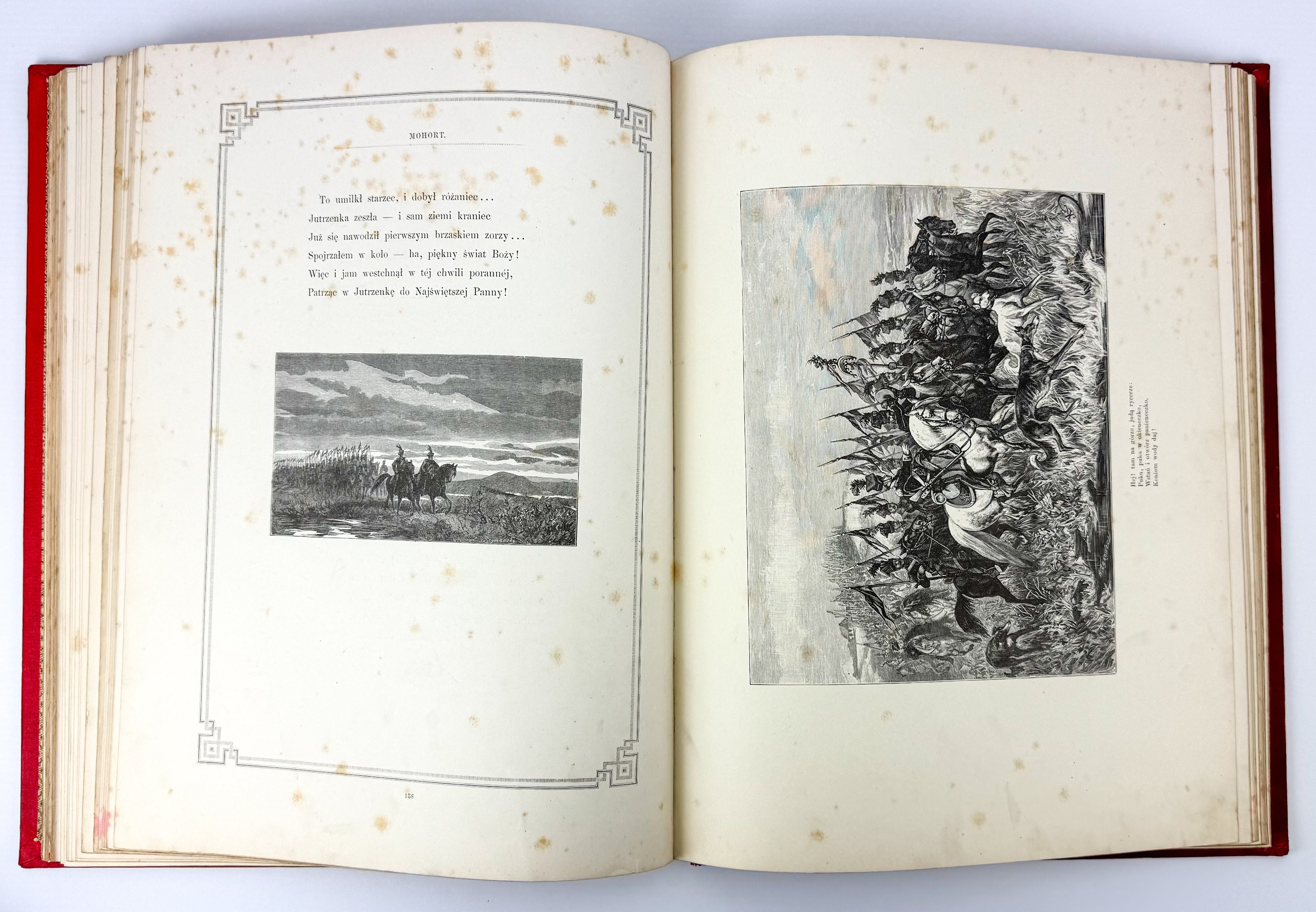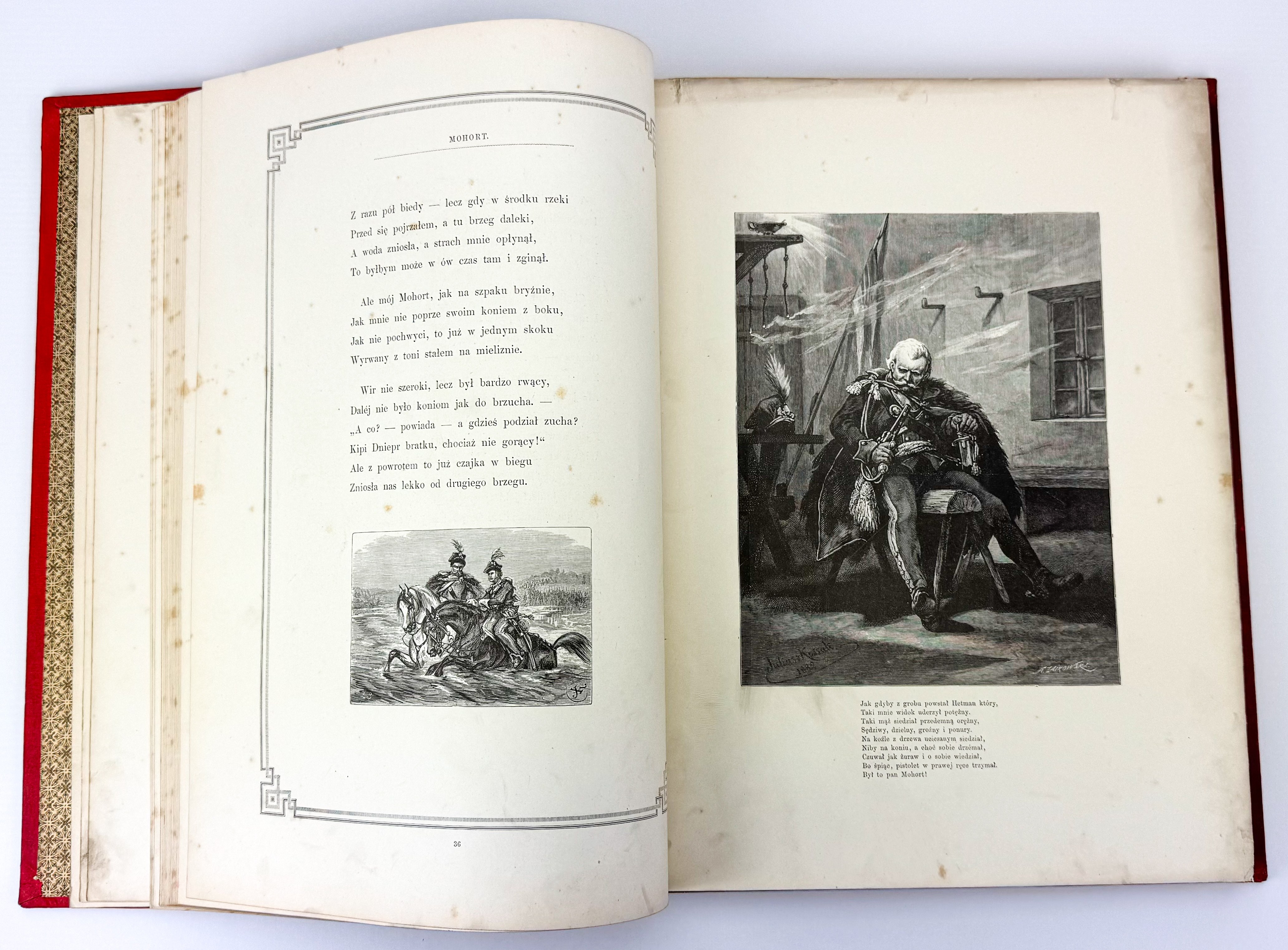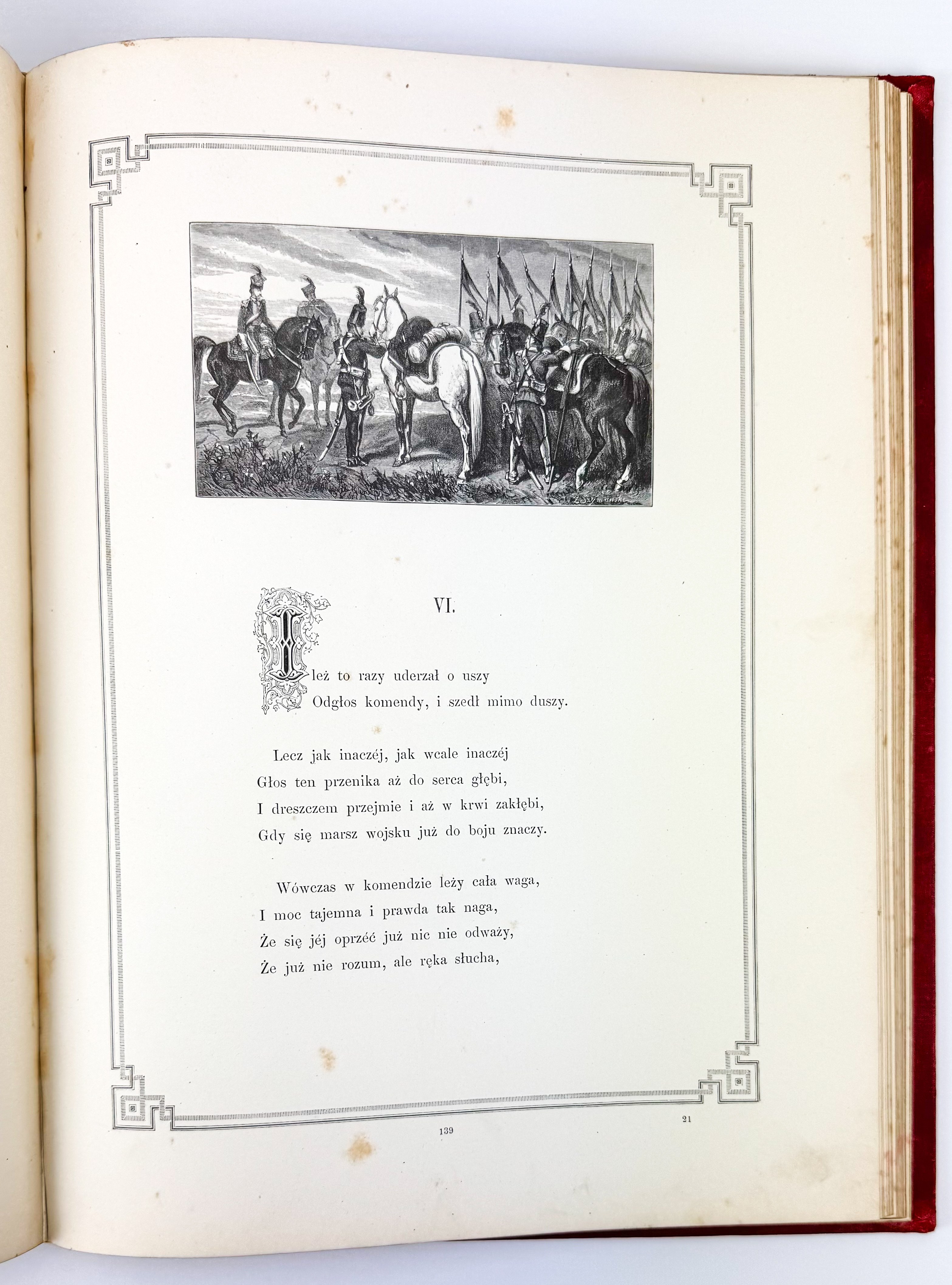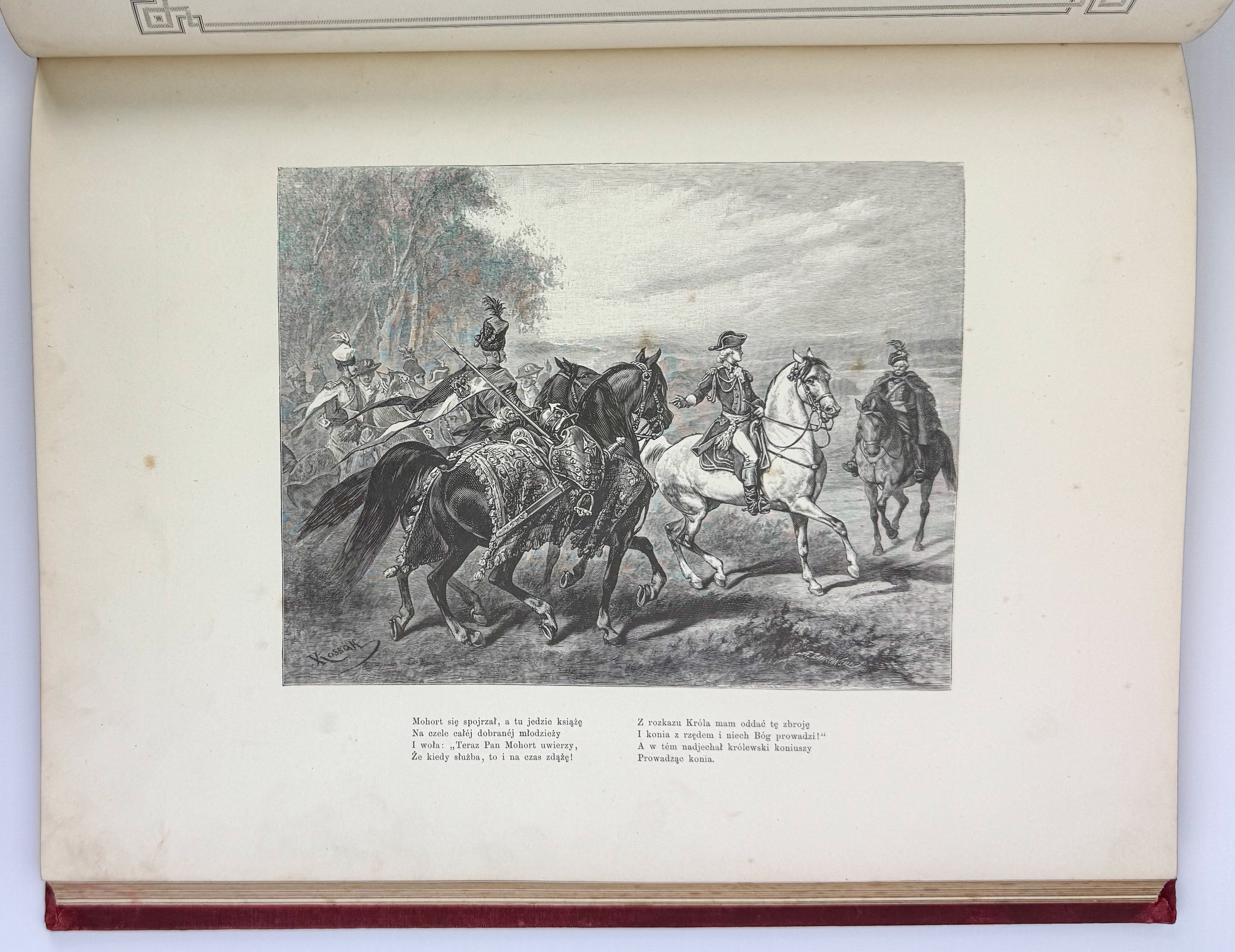 Piękne ilustrowane dzieło z barwną kompozycją na przedniej okładce: ułan na koniu na tle namiotu wojskowego, wokół geometryczno roślinna bordiura - tłoczona i złocona. Tekst ozdobiony ramkami. Ilustracje Juliusza Kossaka - 18 w tekście oraz 6 drzeworytów, rytował Z.Szymański i A.Zajkowski. Ostatnie karty z objaśnieniami, nutami oraz tekst dotyczący koni.