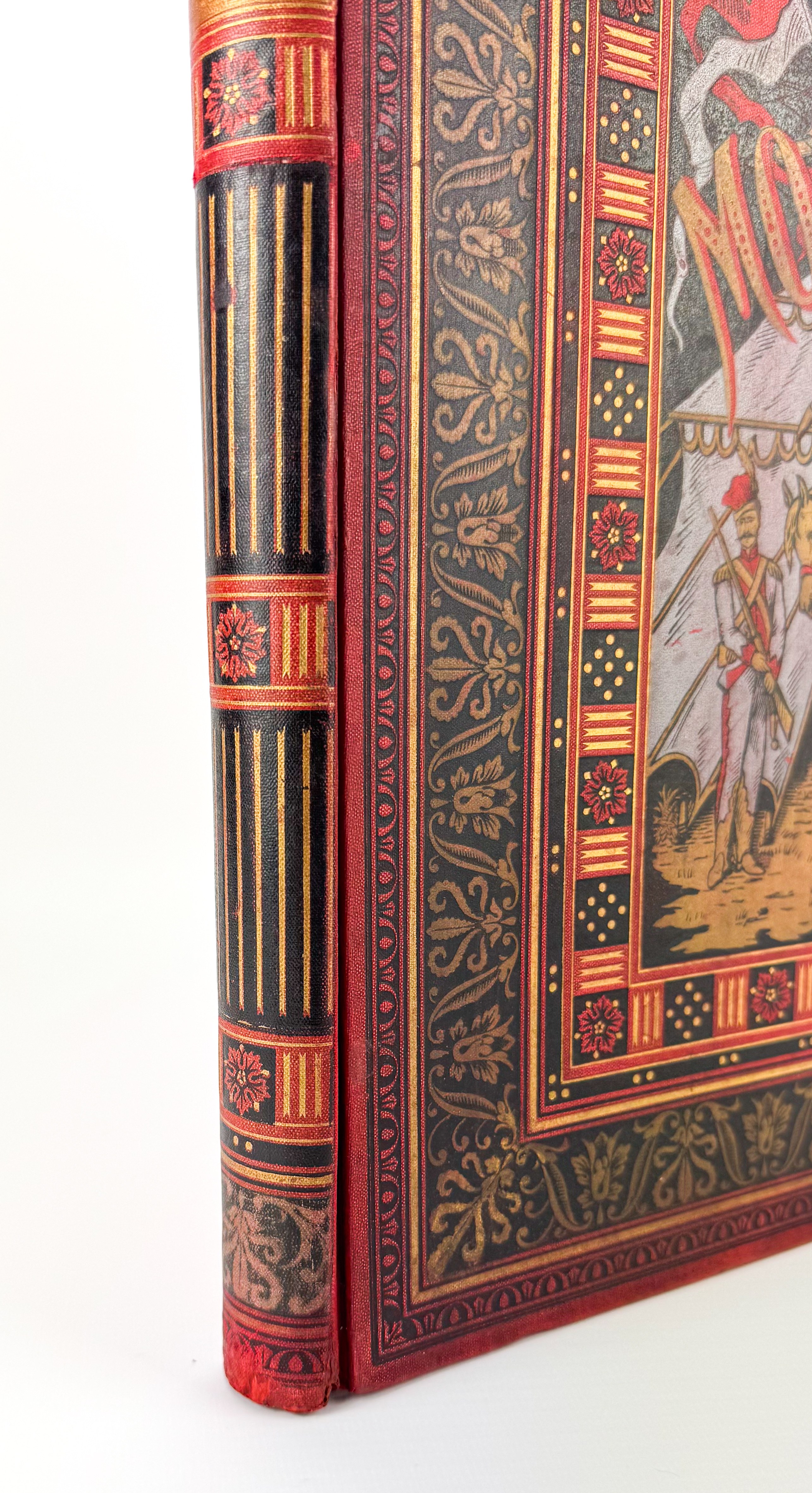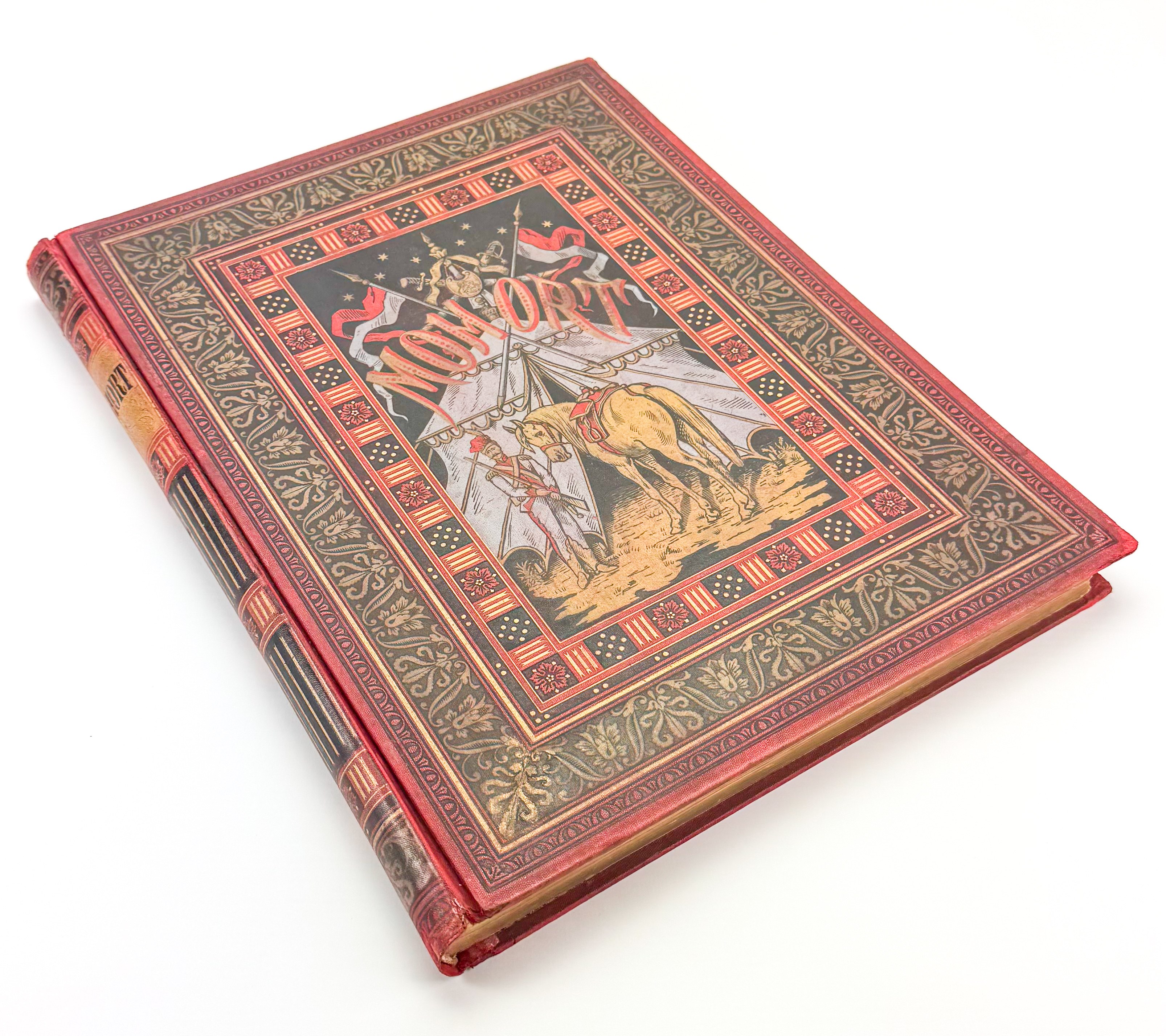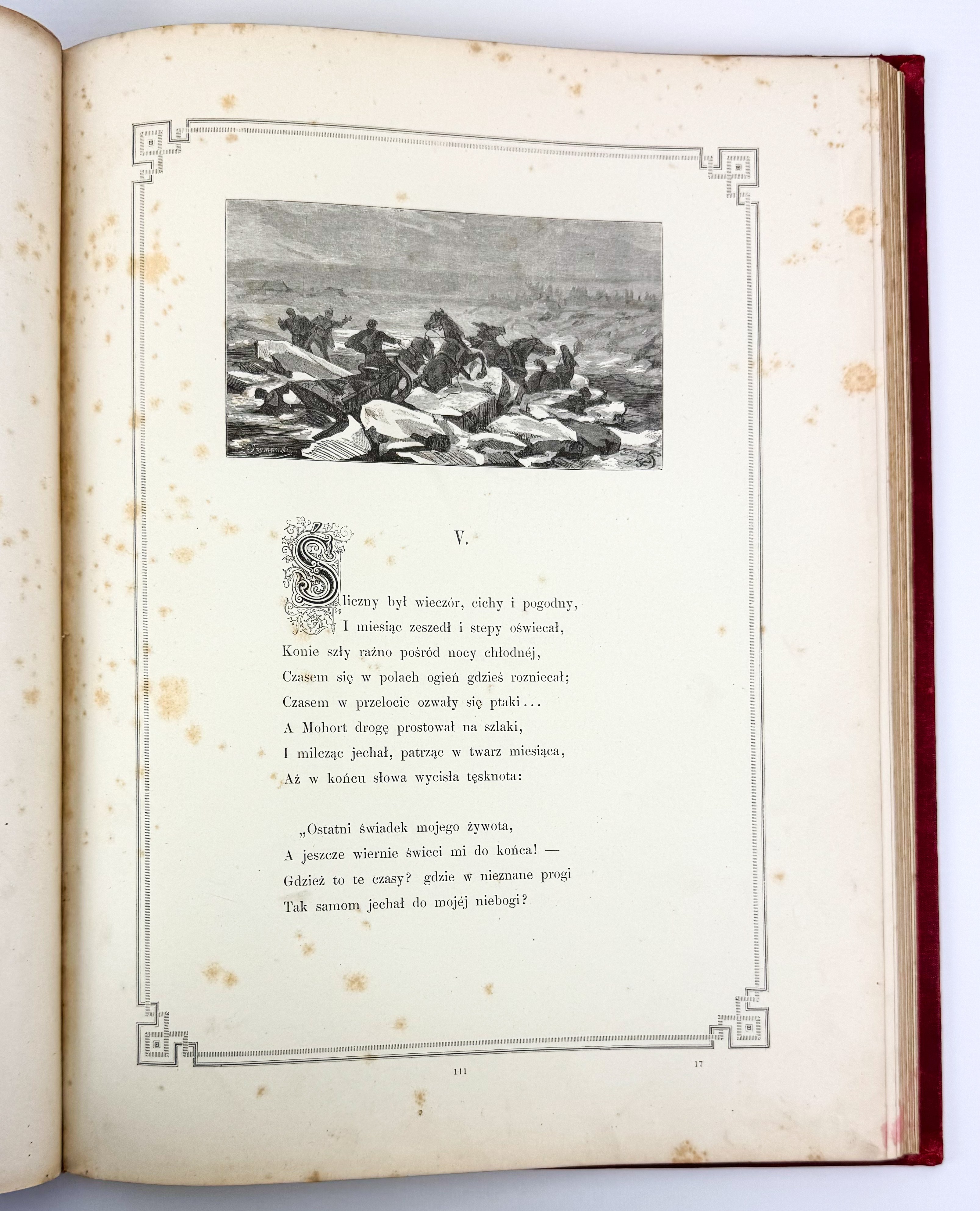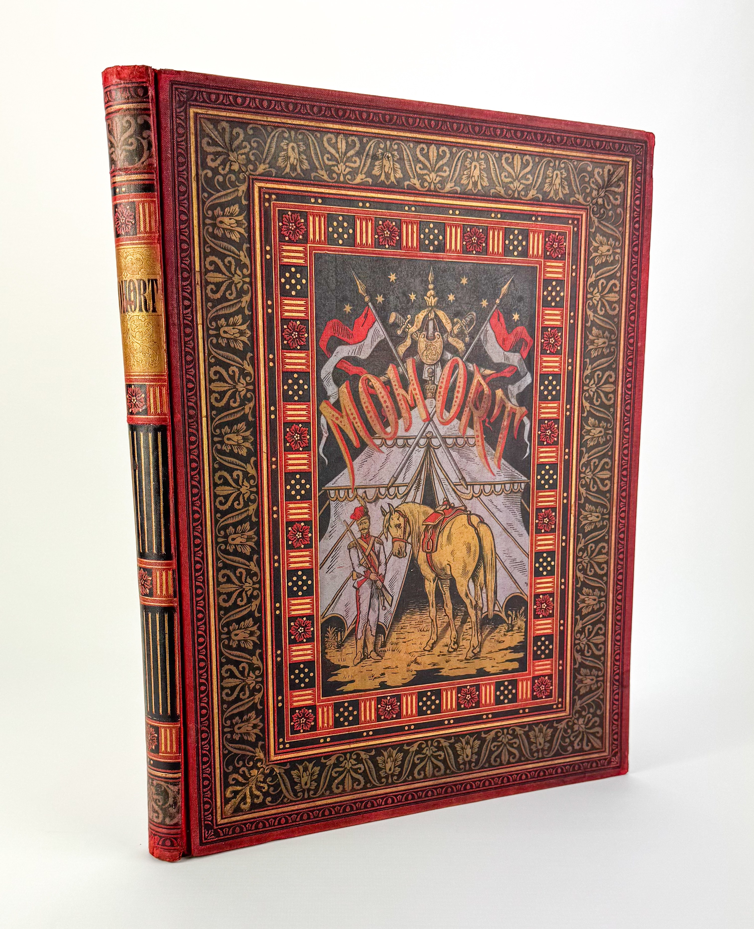 Piękne ilustrowane dzieło z barwną kompozycją na przedniej okładce: ułan na koniu na tle namiotu wojskowego, wokół geometryczno roślinna bordiura - tłoczona i złocona. Tekst ozdobiony ramkami. Ilustracje Juliusza Kossaka - 18 w tekście oraz 6 drzeworytów, rytował Z.Szymański i A.Zajkowski. Ostatnie karty z objaśnieniami, nutami oraz tekst dotyczący koni.