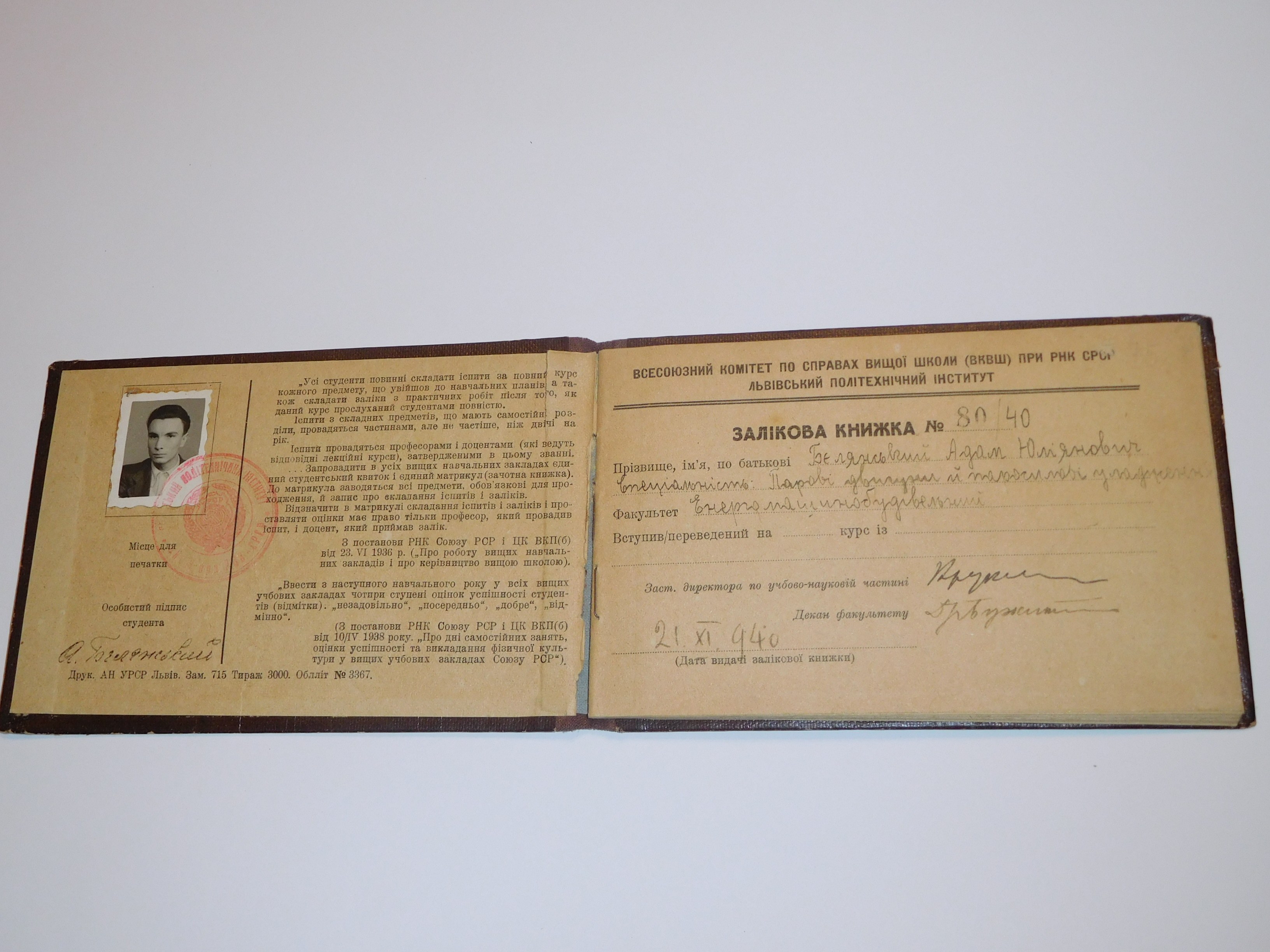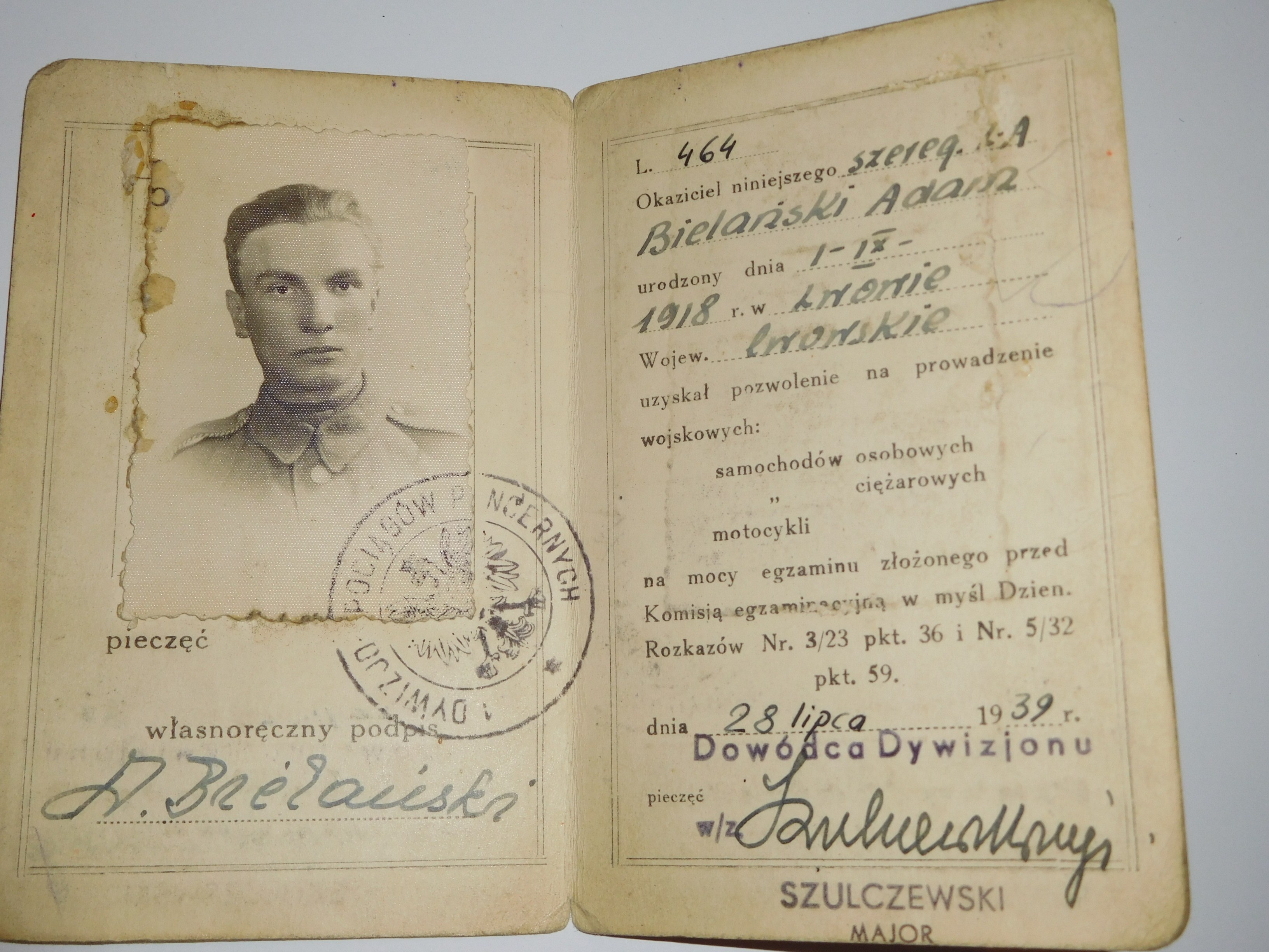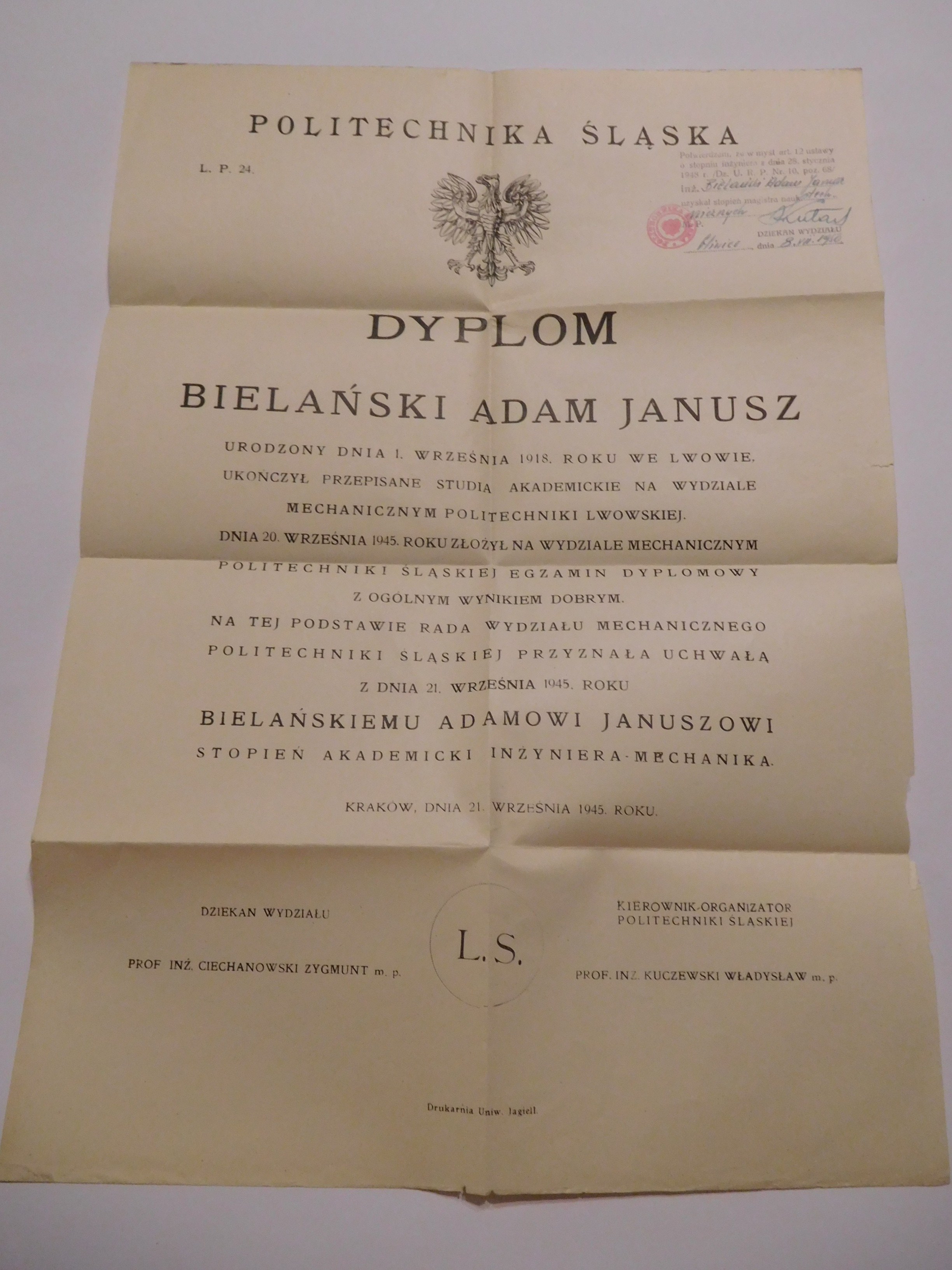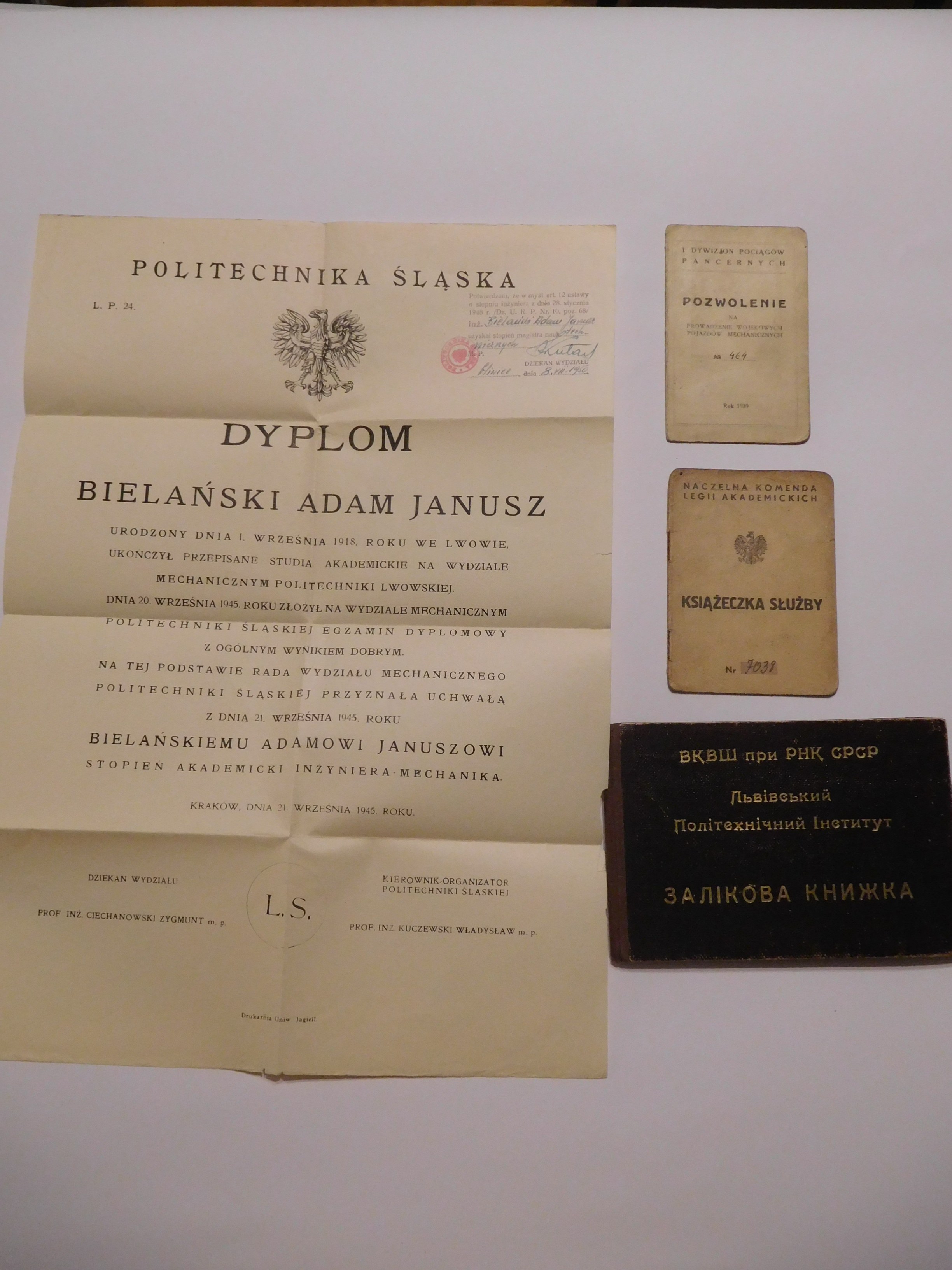 Unikatowy zbiór 4 dokumentów związanych ze studiami i służbą wojskową studenta Politechniki Lwowskiej. Pierwszy chronologicznie dokument to książeczka wojskowa Naczelnej Komendy Legii Akademickiej. Drugi dokument to wyjątkowe pozwolenie I Dywizjonu Pociągów Pancernych na prowadzenie wojskowych pojazdów mechanicznych. Dokument wraz ze zdjęciem posiadacza był wydany 28 VII 1939 [sic!], tuż przed wybuchem wojny. Trzeci dokument to indeks studenta ze zdjęciem posiadacza z okresu okupacji radzieckiej Lwowskiego Instytutu Politechnicznego ZSRR w j. rosyjskim. Zbiór wieńczy Dyplom Inżyniera Mechanika Politechniki Śląskiej wydany w Krakowie [sic!] 21 IX 1945 r. na podstawie studiów na Politechnice Lwowskiej oraz na podstawie egzaminu dyplomowego. Wszystkie dokumenty wystawione dla Adama Janusza Bielańskiego przedstawiają wyjątkowy przykład łączenia obowiązków studenckich z wojskowymi i trudnej sytuacji w okupowanym Lwowie. Bardzo rzadki przykład dokumentów związanych ze Lwowem i Politechniką z okresu tuż przed wojną i samej okupacji.